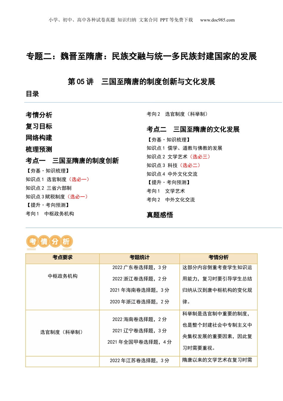 小学、初中、高中各种试卷真题知识归纳文案合同PPT等免费下载www.doc985.com专题二:魏晋至隋唐:民族交融与统一多民族封建国家的发展第05讲三国至隋唐的制度创新与文化发展目录考情分析复习目标网络构建梳理预测考点一三国至隋唐的制度创新【夯基·知识梳理】知识点1选官制度(选必一)知识点2三省六部制知识点3赋税制度(选必一)【提升·考向预测】考向1中枢政务机构考向2选官制度(科举制)考点二三国至隋唐的文化发展【夯基·知识梳理】知识点1儒学、道教与佛教的发展知识点2文学艺术(选必三)知识点3科技(选必二)知识点4中外文化交流【提升·考向预测】考向1文学艺术考向2中外文化交流真题感悟考点要求考题统计考情分析中枢政务机构2022广东卷选择题,3分2022浙江卷选择题,2分2021年海南卷选择题,3分2020年浙江卷选择题,2分这部分内容侧重考查学生知识运用能力,复习时要引导学生总结归纳从汉到唐中枢机构的变化规律。选官制度(科举制)2022海南卷选择题,2分2021辽宁卷选择题,3分2021年全国甲卷选择题,4分科举制是选官制中重要的制度,也是整个封建社会中专制主义中央集权发展的重要因素,因此复习时需要重视。2022年江苏卷选择题,3分隋唐以来的文学艺术在复习时需小学、初中、高中各种试卷真题知识归纳文案合同PPT等免费下载www.doc985.com文学艺术2022年全国乙卷选择题,4分2020年天津卷选择题,3分要和背景相结合,文化是某一事件对政治制度的反映,需要学生学会融汇贯通的理解和归纳。中外文化交流2021年辽宁卷选择题,3分近三年涉及较少,复习时需要和选择性必修结合起来。1、通过把握三国两晋南北朝时期政权更迭的历史脉络,认识这一时期的重要改革和制度变化、区域开发、民族交融的特点和历史意义。2、通过把握三国至隋唐五代分合更迭的历史脉络,认识这一时期思想文化与社会领域中的新成就、新变化。考点一三国至隋唐的制度创新知识点1:选官制度(选必一)1、中国古代不同时期的选官制度选官方式世卿世禄制军功爵制察举制九品中正制科举制小学、初中、高中各种试卷真题知识归纳文案合同PPT等免费下载www.doc985.com时期商周时期战国~秦朝汉代魏晋南北朝隋唐~1905年依据标准血缘关系军功品行才能门第考试能力2、九品中正制:由中央委任中正官分九等为各地人才评定等级,朝廷依此授以相应的官职,西晋时期选官标准主要看重家世;九品中正制逐渐成为维护士族特权的工具3、科举制:采用分科考试的方式选拔官员。(1)产生:隋文帝初步建立通过考试选拔人才的制度;隋炀帝时,进士科的创立,标志着科举制的正式确立(2)发展:①唐太宗增加科举考试科目,鼓励士人报考,进士科逐渐成为最重要的科目;②武则天扩大科举取士的人数,创立殿试制度;③唐玄宗任用高官主持考试科目,提高了科举考试的地位。④宋朝增加科举取士名额,提高进士地位⑤明朝八股取士,禁锢了思想。⑥科举制度在我国封建社会延续了约1300年,直到清朝末年才被废除。(3)特点:分科考试、以才选官、自由报考、公平竞争(4)影响:积极①科举制打破了世家大族对选拔人才的垄断,扩大了封建政权的统治基础,有利于中央集权的加强。②通过考试选拔人才,相对公平公正。③读书-考试-做官三位一体,保证官僚队伍的来源,提高官员的文化素质,成为中华文明长期繁荣的制度保障④使出身社会中下层的读书人通过相对公平的考试参与政权,有利于社会阶层的流动,扩大了统治的基础⑤后被西方国家所借鉴,推动世界文明进步。⑥是中国古代选官制度的一大变革,加强了皇帝在选官和用人上的权利,扩大了官吏选拔的范围,使有才学的人能够由此参政,促进了社会阶层的流动,同时也推动了教育的发展,促进文学艺术的发展和唐诗的繁荣。消极①考试科目及内容以儒学经义为范畴,到了封建社会后期发展成八股取士,严重禁锢了人们的思想。②忽视实用性学问,阻碍了科学技术的新发展。4、选官制度的变化趋势:逐渐走向成熟与完善。①选拔标准:由家世门第、财产等级演变为才能学识。②选拔方式:由地方评定、推荐演变为中央考试选拔。③选拔原则:逐渐走向制度化,体现相对的公平公开。④选官基础:基础日益扩大...