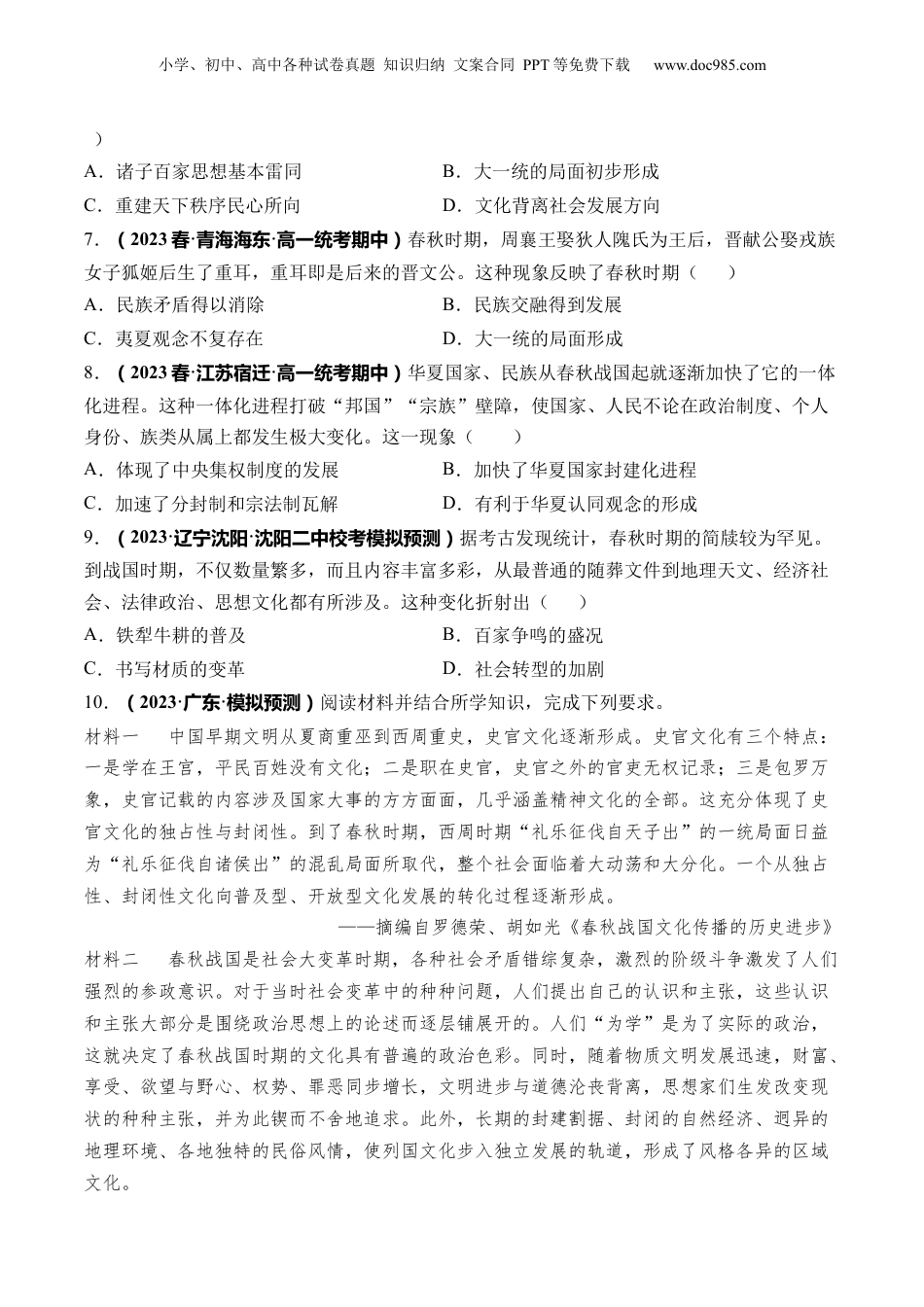 小学、初中、高中各种试卷真题知识归纳文案合同PPT等免费下载www.doc985.com第02讲诸侯纷争与变法运动1.(2023·浙江金华·统考模拟预测)战国时期,七国君主都标榜是黄帝的后裔;十六国时期,匈奴人建立大夏国,自认为是禹的后代;鲜卑族拓跋部统一北方建立北魏政权后,其皇室也自认为是黄帝后裔。据此可知()A.民族关系趋于平等B.尊祖敬宗思想推广C.国家统一趋势加强D.华夏认同观念强化2.(2023·浙江·统考模拟预测)在春秋时代,尚存在着“尊王攘夷”的呼声。但是到了战国时代,“夷夏”高下之分,已经不足辨。孟子就直截了当地指出:“吾闻用夏变夷者,未闻变于夷者也。”这说明,战国时代()A.华夏文化的辐射力增强B.礼乐成为夷夏交往准则C.百家思想呈现争鸣态势D.少数民族完成了封建化3.(2023·四川南充·统考三模)西周晚期至东周初,是早期史学发展的重要节点,历史表述主题侧重点由天命、族群及周王朝的发展变为贵族和诸侯功业等,中下级贵族及士阶层逐渐成为历史表述的主体,开诸侯国史著述之风、私人述史之风。这反映当时()A.士族政治开始出现B.传统秩序受到挑战C.宗法观念持续强化D.礼乐制度土崩瓦解4.(2023·山东临沂·统考二模)对于魏、齐等大国的君主,孟子劝之以仁政;对于滕、宋等小国的君主,孟子仍认为只要推行仁政,便可无敌于天下。孟子“仁者无敌”的主张()A.指出了当时富国强兵的途径B.适应了国家统一的历史趋势C.总结了各国治国理政的经验D.体现了儒家思想的现实追求5.(2023·山东济南·统考三模)鲁国的孟僖子(春秋后期鲁国大夫)对礼仪不熟悉,他感到遗憾,临终时吩咐他的儿子孟懿子和南宫敬叔去师事孔子。据此可知当时()A.私学兴起并发扬光大B.礼乐文化不断繁荣C.宗法分封度渐趋崩坏D.儒学成为社会主流6.(2023·海南海口·统考模拟预测)当梁惠王产生“天下恶乎定”的疑问时,孟子回答说:“定于一。”在《荀子》一书中,“一天下”、“天下为一”之语更是一再出现。《吕氏春秋》亦云“天下必有天子,所以一之也……一则治,两则乱”。这些观点反映了战国时期(最新模拟精炼小学、初中、高中各种试卷真题知识归纳文案合同PPT等免费下载www.doc985.com)A.诸子百家思想基本雷同B.大一统的局面初步形成C.重建天下秩序民心所向D.文化背离社会发展方向7.(2023春·青海海东·高一统考期中)春秋时期,周襄王娶狄人隗氏为王后,晋献公娶戎族女子狐姬后生了重耳,重耳即是后来的晋文公。这种现象反映了春秋时期()A.民族矛盾得以消除B.民族交融得到发展C.夷夏观念不复存在D.大一统的局面形成8.(2023春·江苏宿迁·高一统考期中)华夏国家、民族从春秋战国起就逐渐加快了它的一体化进程。这种一体化进程打破“邦国”“宗族”壁障,使国家、人民不论在政治制度、个人身份、族类从属上都发生极大变化。这一现象()A.体现了中央集权制度的发展B.加快了华夏国家封建化进程C.加速了分封制和宗法制瓦解D.有利于华夏认同观念的形成9.(2023·辽宁沈阳·沈阳二中校考模拟预测)据考古发现统计,春秋时期的简牍较为罕见。到战国时期,不仅数量繁多,而且内容丰富多彩,从最普通的随葬文件到地理天文、经济社会、法律政治、思想文化都有所涉及。这种变化折射出()A.铁犁牛耕的普及B.百家争鸣的盛况C.书写材质的变革D.社会转型的加剧10.(2023·广东·模拟预测)阅读材料并结合所学知识,完成下列要求。材料一中国早期文明从夏商重巫到西周重史,史官文化逐渐形成。史官文化有三个特点:一是学在王宫,平民百姓没有文化;二是职在史官,史官之外的官吏无权记录;三是包罗万象,史官记载的内容涉及国家大事的方方面面,几乎涵盖精神文化的全部。这充分体现了史官文化的独占性与封闭性。到了春秋时期,西周时期“礼乐征伐自天子出”的一统局面日益为“礼乐征伐自诸侯出”的混乱局面所取代,整个社会面临着大动荡和大分化。一个从独占性、封闭性文化向普及型、开放型文化发展的转化过程逐渐形成。——摘编自罗德荣、胡如光《春秋战国文化传播的历史进步》材料二春秋战国是社会大变革时期,各种社会矛盾错...