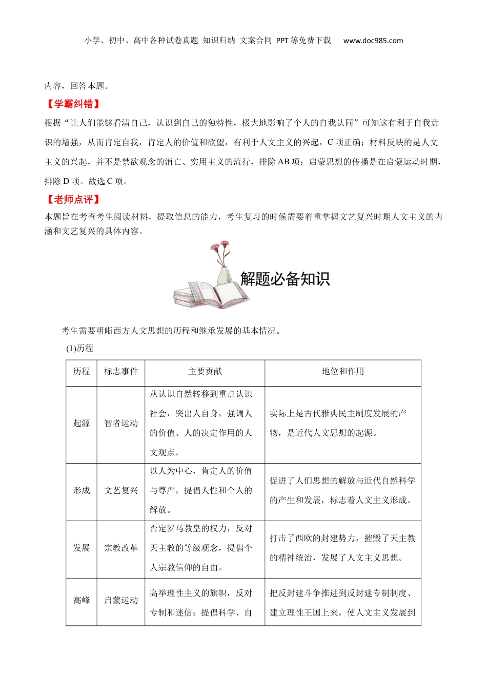 小学、初中、高中各种试卷真题知识归纳文案合同PPT等免费下载www.doc985.com考点17西方人文主义例1.(2021·湖北·高考真题)在苏格拉底看来,城邦最需要的是织工、农民、鞋匠和建筑工人;在这些人仍不能使城邦自给自足的时候,还需增加冶工、牧人、商人和小贩,这种设想蕴含着A.专制主义理念B.自由主义精神C.法律至上原则D.小国寡民情结【错因分析】本题材料视角新颖,创设的情景主要是考生掌握欠缺的苏格拉底思想内涵,直击考生的薄弱环节,有一定的难度。需要考生深入的思考材料蕴含的主旨大意,并结合古希腊城邦的特点做出正确的选择。【学霸解题】审材料:根据材料“城邦最需要的是织工、农民、鞋匠和建筑工人;在这些人仍不能使城邦自给自足的时候,还需增加冶工、牧人、商人和小贩”,可知,苏格拉底认为城邦的发展应该是自给自足,这种设想蕴含着小国寡民情结。结合所学可知,苏格拉底生活的时代,古希腊有数百个城邦,辖地不过百里,人口不过数万,城邦十分珍视独立自治,始终保持着小国寡民的状态,D项正确。析选项:材料未体现专制主义理念,排除A项;材料与自由主义无关,排除B项;材料未涉及法律至上原则,排除C项。【秒杀技巧】“专制主义”首先排除,苏格拉底生活在希腊城邦奴隶制民主政治时期。考生需要掌握西方人文主义起源的基本史实。一、智者学派—“人是万物的尺度”1.背景(1)公元前5世纪,古希腊城邦奴隶制民主政治发展到顶峰。(2)人们越来越多地参与政治生活,人在社会中的地位日益突出,有些学者的研究越来越关注“人”本身。2.代表人物:普罗泰戈拉、安提丰。小学、初中、高中各种试卷真题知识归纳文案合同PPT等免费下载www.doc985.com3.智者学派的主要思想(1)以人和人类社会为探索的主题,研究人类,反思人类自己。(2)特别强调人的价值。认为人的感觉是判定一切的准绳,否定神的意志是衡量一切的尺度,树立了人的尊严和权威。体现了希腊文化人文主义的本质。(3)反对迷信,强调自由。在社会道德方面,每个人都应该有自己的判断标准,不应该强求一律。4.意义(1)智者学派对雅典民众的思想启蒙和解放起了积极的作用。(2)它的某些思想是西方思想史上人文主义精神的最初体现。二、苏格拉底—“美德即知识”1.苏格拉底的主张(1)倡导“有思想力的人是万物的尺度”,希望重新建立人们的道德价值观,以挽救衰颓中的城邦制度。(2)认为社会中的人应该具备美德,美德来自于知识,提出“美德即知识”的思想。(3)提出善是人的内在灵魂,世界上没有人自愿作恶,人之所以作恶是出于无知。他进一步指出,教育对美德同样重要,教育可以使人认识自己灵魂之内已有的美德。2.意义:苏格拉底对人性本身的研究,是人类精神觉醒的一个重要表现,他使哲学真正成为一门研究“人”的学问。三、柏拉图和亚里士多德1.柏拉图:关注的焦点是人类社会。他在《理想国》中把人分为几等,每个人明确分工,各司其职。鼓励人们独立理性思考,为理性主义的发展奠定了基础。2.亚里士多德:关注自然界和人类生活,强调在整个自然界中,人类是最高级的。例2(2021·湖北·高考真题)文艺复兴时期,威尼斯人发明的玻璃镜风靡欧洲。相比之前的铜镜,玻璃镜让人们能够看清自己,认识到自己的独特性,极大地影响了个人的自我认同,这反映了A.禁欲观念的消亡B.实用主义的流行C.人文主义的兴起D.启蒙思想的传播【错因分析】本题材料视角新颖,创设的情景比较别致,以考生相对陌生材料考查考生熟悉的内容,直击考生的薄弱环节,解答本题需要考生有效的提取材料信息,抓住关键词“文艺复兴”,然后再结合教材文艺复兴的具体小学、初中、高中各种试卷真题知识归纳文案合同PPT等免费下载www.doc985.com内容,回答本题。【学霸纠错】根据“让人们能够看清自己,认识到自己的独特性,极大地影响了个人的自我认同”可知这有利于自我意识的增强,从而肯定自我,肯定人的价值和欲望,有利于人文主义的兴起,C项正确;材料反映的是人文主义的兴起,并不是禁欲观念的消亡、实用主义的流行,排除AB项;启蒙思想的传播是在启蒙运动时期,排除D项。故选C项。【老师点评】本题旨在考查考生阅读材料,提取信...