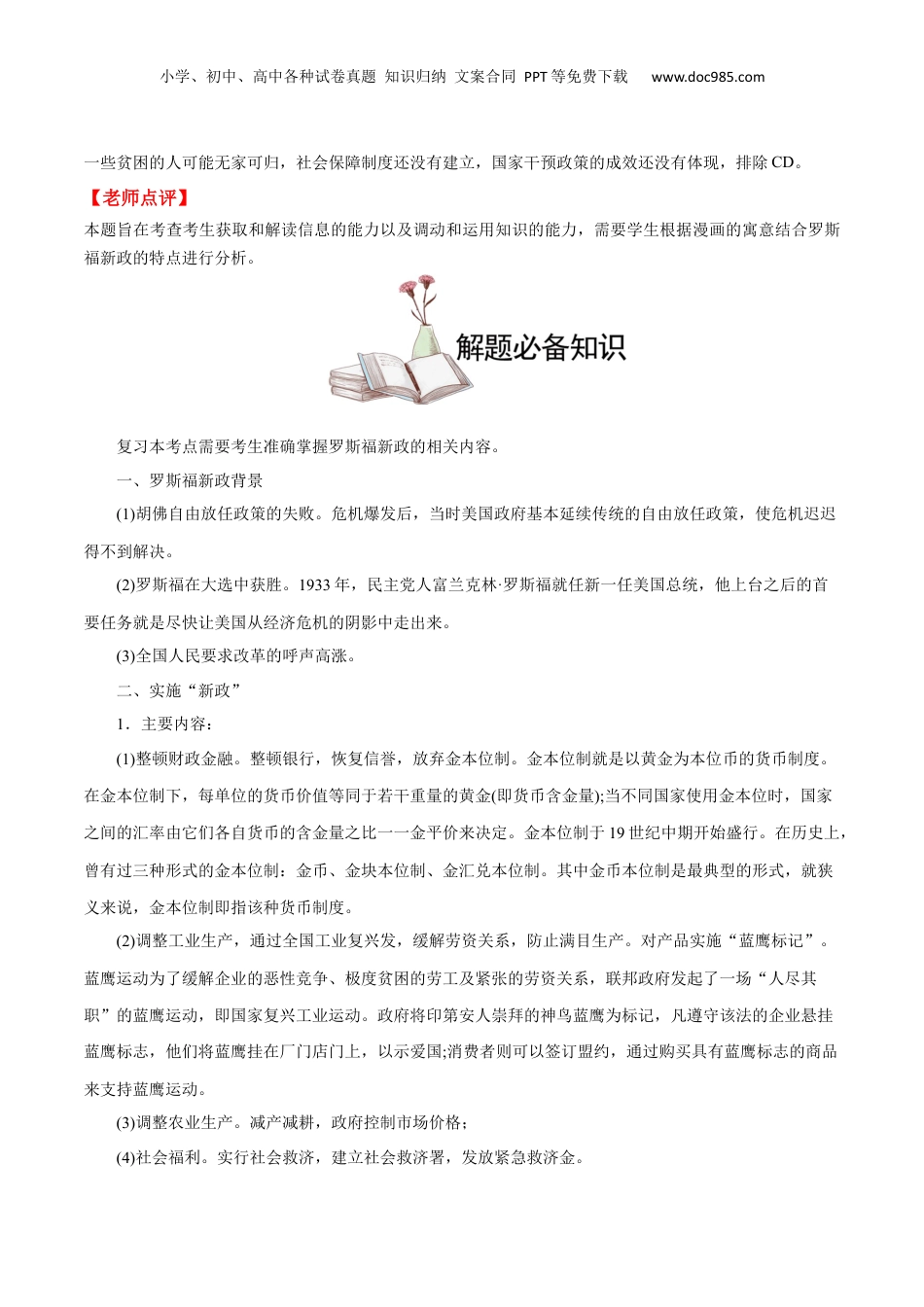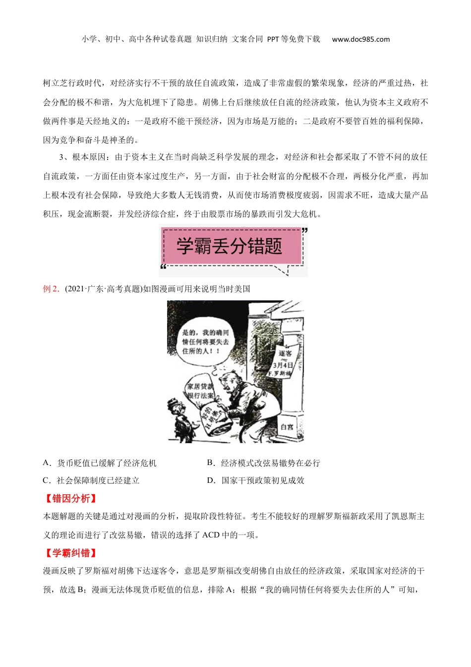 小学、初中、高中各种试卷真题知识归纳文案合同PPT等免费下载www.doc985.com考点13罗斯福新政例1(2021·全国·高考真题)1930~1931年,纽约市儿童餐厅提供的廉价午餐数量猛增,曾在1917~1918年因战争而畅销的香烟产量再次剧增,许多穿着整洁西装的商贩在街头兜售苹果,也成为城市一景。这反映出,当时美国A.经济危机持续加深B.社会矛盾趋于缓和C.新政取得良好成效D.福利制度已经确立【错因分析】本题旨在考查学生获取和解读信息的能力,同时也需要考生对经济危机的相关时间节点能够熟练地把握,学生倘若不能掌握新政开始于1933年,福利制度是在罗斯福新政以后逐渐建立,便容易错误的选择C项和D项。【学霸解题】审材料:材料信息“1930~1931年”说明这是经济危机期间,“纽约市儿童餐厅提供的廉价午餐数量猛增”说明纽约市民众生活水平下降,“因战争而畅销的香烟产量再次剧增”说明吸烟者寻找昂贵雪茄的替代品,“许多穿着整洁西装的商贩在街头兜售苹果”说明失业扩展到白领阶层。由此可知,材料中的现象反映出,当时美国经济危机在持续加深,故A正确;材料没有社会矛盾趋于缓和的信息,故B错误;析选项:新政开始于1933年,故C错误;福利制度在罗斯福新政以后逐步确立,故D错误。【秒杀技巧】根据“1930~1931年”可以首先排除CD项。复习本考点考生需要掌握危机的根源。1、历史根源:亚当·斯密的市场绝对自由万能理论2、直接因素:一战后,1924~1929年,以美国为首的资本主义国家经历了五年黄金发展周期,美国小学、初中、高中各种试卷真题知识归纳文案合同PPT等免费下载www.doc985.com柯立芝行政时代,对经济实行不干预的放任自流政策,造成了非常虚假的繁荣现象,经济的严重过热,社会分配的极不和谐,为大危机埋下了隐患。胡佛上台后继续放任自流的经济政策,他认为资本主义政府不做两件事是天经地义的:一是政府不能干预经济,因为市场是万能的;二是政府不要管百姓的福利保障,因为竞争和奋斗是神圣的。3、根本原因:由于资本主义在当时尚缺乏科学发展的理念,对经济和社会都采取了不管不问的放任自流政策,一方面任由资本家过度生产,另一方面,由于社会财富的分配极不合理,两极分化严重,再加上根本没有社会保障,导致绝大多数人无钱消费,从而使市场消费极度疲弱,因需求不旺,造成大量产品积压,现金流断裂,并发经济综合症,终于由股票市场的暴跌而引发大危机。例2.(2021·广东·高考真题)如图漫画可用来说明当时美国A.货币贬值已缓解了经济危机B.经济模式改弦易辙势在必行C.社会保障制度已经建立D.国家干预政策初见成效【错因分析】本题解题的关键是通过对漫画的分析,提取阶段性特征。考生不能较好的理解罗斯福新政采用了凯恩斯主义的理论而进行了改弦易辙,错误的选择了ACD中的一项。【学霸纠错】漫画反映了罗斯福对胡佛下达逐客令,意思是罗斯福改变胡佛自由放任的经济政策,采取国家对经济的干预,故选B;漫画无法体现货币贬值的信息,排除A;根据“我的确同情任何将要失去住所的人”可知,小学、初中、高中各种试卷真题知识归纳文案合同PPT等免费下载www.doc985.com一些贫困的人可能无家可归,社会保障制度还没有建立,国家干预政策的成效还没有体现,排除CD。【老师点评】本题旨在考查考生获取和解读信息的能力以及调动和运用知识的能力,需要学生根据漫画的寓意结合罗斯福新政的特点进行分析。复习本考点需要考生准确掌握罗斯福新政的相关内容。一、罗斯福新政背景(1)胡佛自由放任政策的失败。危机爆发后,当时美国政府基本延续传统的自由放任政策,使危机迟迟得不到解决。(2)罗斯福在大选中获胜。1933年,民主党人富兰克林·罗斯福就任新一任美国总统,他上台之后的首要任务就是尽快让美国从经济危机的阴影中走出来。(3)全国人民要求改革的呼声高涨。二、实施“新政”1.主要内容:(1)整顿财政金融。整顿银行,恢复信誉,放弃金本位制。金本位制就是以黄金为本位币的货币制度。在金本位制下,每单位的货币价值等同于若干重量的黄金(即货币含金量);当不同国家使用金本位时,国家之间的汇率由它们各自货币的含金量之比一一金平价来决定。金本位制于19...