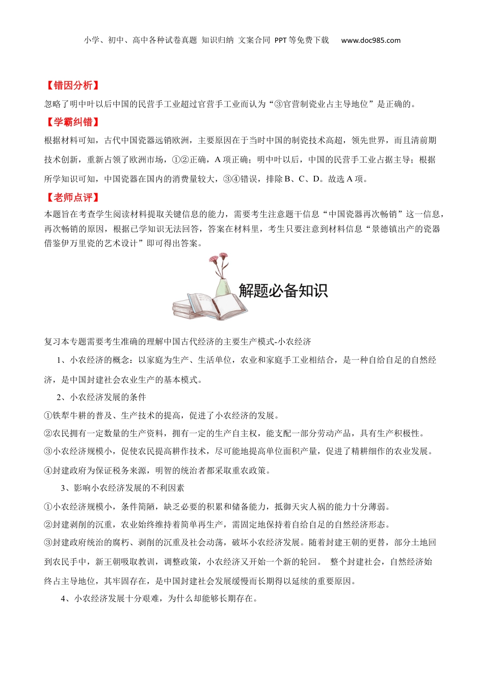 小学、初中、高中各种试卷真题知识归纳文案合同PPT等免费下载www.doc985.com考点10古代中国经济的基本结构例1西晋的占田制、南朝刘宋的占山护泽令均规定,官员可按品级高低占有数目不等的农田、山地,助长了大土地所有制发展。至隋唐,实行均田制,普遍授田。据此可知,西晋至唐A.自耕农数量存在反复B.皇权与世族势力互相依赖C.九品中正制遭到破坏D.田制改革目的是开发土地【错因分析】本题考查的是赋税制度,主要考查学生阅读材料提取信息的能力,易错的原因是对具体概念的理解不到位,主观的认为魏晋南北朝时期的官员即是门阀士族,而选择B项。【学霸解题】审材料:根据材料可知,西晋时期官员可占据土地,使土地兼并现象严重,自耕农减少。而均田制之下普遍授田,使自耕农数量有所增加,因此反映出这一时期自耕农数量反复,故A正确。析选项:C项提高的九品中正制在材料里没有体现这样的选官制度,可以排除;D项田制改革的目的是保证国家的税收而不是开发土地,故D项错误。【秒杀技巧】“九品中正制”首先排除。因为材料描述的是古代中国的赋税制度而不是选官制度。在复习过程中,要能够准确理解魏晋至隋唐时期的赋税制度1、租(庸)调制(曹魏至唐朝前期)(1)形成①魏晋时期:开始实行租调制,按户征收粮和绢帛。②北魏孝文帝改革,颁布均田令,规定一夫一妇每年纳粟为租,纳帛或布为调,受田农民承担定额租调,成年男子负担一定的徭役。小学、初中、高中各种试卷真题知识归纳文案合同PPT等免费下载www.doc985.com③唐初:开始实行租庸调制,除租、调外,男子不去服徭役的可以纳绢或布代役,称为庸。(2)特点:实行实物租和劳役相结合,按人丁计税,国家对人身依附关系控制严格;以均田制为基础。(3)意义:①租庸调制规定了农民负担的上限,以庸代役保证农民有较充分的生产时间。②政府的赋税收入有了保障。2、两税法(唐朝中后期)(1)原因①客观:天宝年间,土地买卖和兼并之风盛行,政府直接支配的土地日益减少,均田制无法推行,租庸调制也无法推行,政府财政收入锐降。②主观:为了解决财政困难。(2)实施:780年,唐德宗接受宰相杨炎的建议,实行两税法。(3)目的:解决财政困难。(4)内容:由国家财政支出确定赋税总额,然后将总额分解到各地,按田亩征收地税,按人丁、资产征收户税,分夏、秋两次征收。(5)标准:以资产和土地的多少作为纳税标准。(6)意义①两税法简化税收名目,扩大收税对象,保证国家的财政收入。②“惟以资产为宗,不以丁身为本”,改变了自战国以来以人丁为主的赋税制度,减轻了政府对农民的人身控制。例2.唐代以来,中国瓷器远销欧洲。明末“海禁”后,瓷器出口大幅减少,同时期日本学习中国制瓷技术,生产出色彩艳丽的伊万里瓷,在欧洲广受欢迎。清前期,景德镇出产的瓷器借鉴伊万里瓷的艺术设计,质优价廉,重新占领欧洲市场。中国瓷器再次畅销欧洲的原因是①制瓷技术保持世界领先②艺术设计注重借鉴创新③官营制瓷业占主导地位④国内民众的购买力下降A.①②B.③④C.①③D.②④小学、初中、高中各种试卷真题知识归纳文案合同PPT等免费下载www.doc985.com【错因分析】忽略了明中叶以后中国的民营手工业超过官营手工业而认为“③官营制瓷业占主导地位”是正确的。【学霸纠错】根据材料可知,古代中国瓷器远销欧洲,主要原因在于当时中国的制瓷技术高超,领先世界,而且清前期技术创新,重新占领了欧洲市场,①②正确,A项正确;明中叶以后,中国的民营手工业占据主导;根据所学知识可知,中国瓷器在国内的消费量较大,③④错误,排除B、C、D。故选A项。【老师点评】本题旨在考查学生阅读材料提取关键信息的能力,需要考生注意题干信息“中国瓷器再次畅销”这一信息,再次畅销的原因,根据已学知识无法回答,答案在材料里,考生只要注意到材料信息“景德镇出产的瓷器借鉴伊万里瓷的艺术设计”即可得出答案。复习本专题需要考生准确的理解中国古代经济的主要生产模式-小农经济1、小农经济的概念:以家庭为生产、生活单位,农业和家庭手工业相结合,是一种自给自足的自然经济,是中国封建社会农业生产的基本模式。2、小农经济发展的条件①铁犁牛耕的普及...