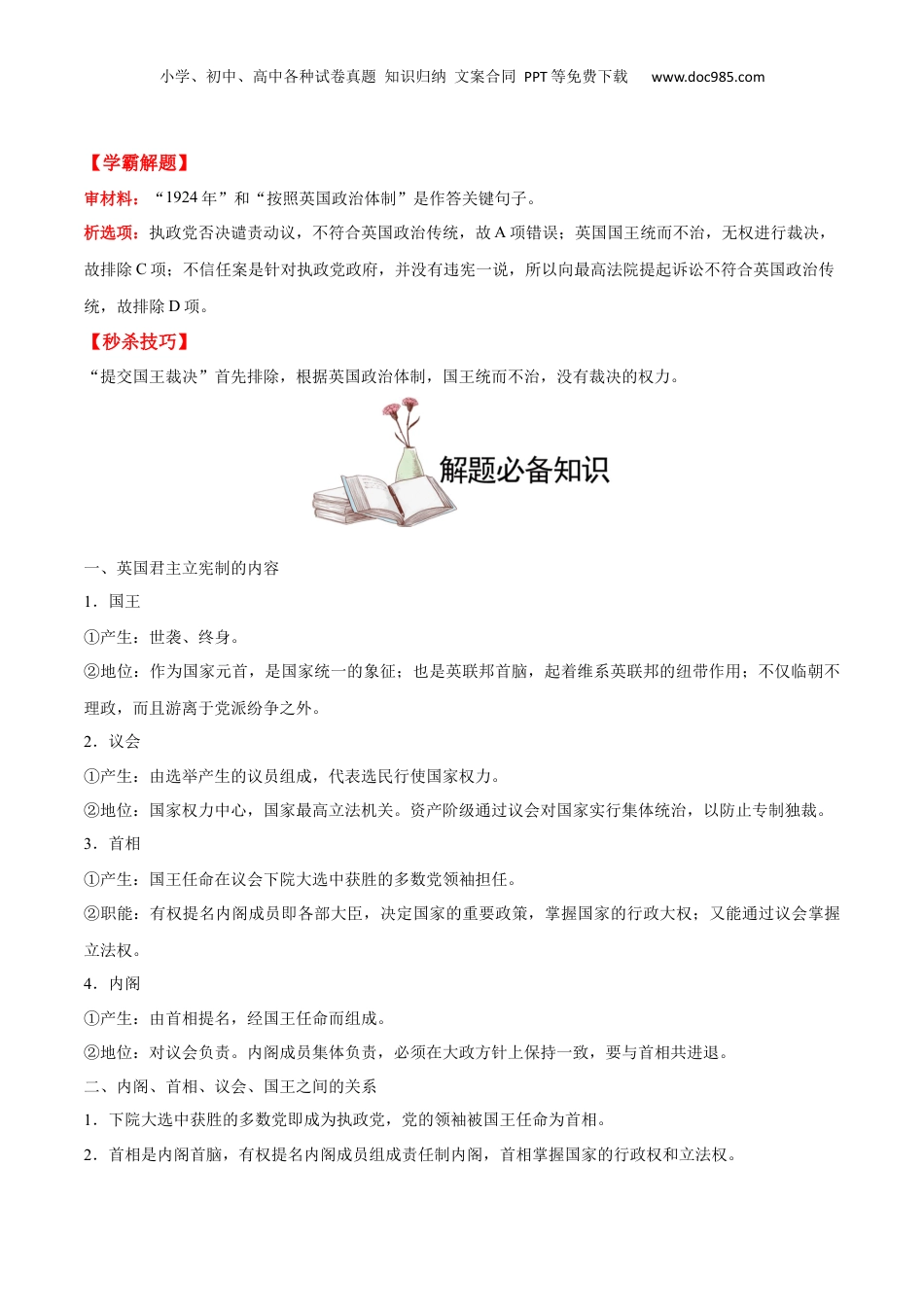 小学、初中、高中各种试卷真题知识归纳文案合同PPT等免费下载www.doc985.com考点07资本主义代议制例1(2019·北京高考真题)1924年,英国保守党和自由党对工党政府提出了谴责动议,工党政府将它视为不信任案。按照英国政治体制,政府接下来可以A.否决谴责动议,继续执政B.要求解散议会,重新大选C.将谴责动议提交国王裁决D.向最高法院提起违宪诉讼【错因分析】本题出错的原因主要是因为学生对英国君主立宪体制的运行机制理解不到位,学生需要辨别清楚内阁、首相、议会和国王之间的相互关系,英国执政党内阁一旦受到不信任案,有两个选择,或者提出辞职、或者要求解散议会重新选举,由此可知,材料涉及的政府接下来要做的就是要求解散议会,重新大选,所以只有B项符合题干要求。小学、初中、高中各种试卷真题知识归纳文案合同PPT等免费下载www.doc985.com【学霸解题】审材料:“1924年”和“按照英国政治体制”是作答关键句子。析选项:执政党否决谴责动议,不符合英国政治传统,故A项错误;英国国王统而不治,无权进行裁决,故排除C项;不信任案是针对执政党政府,并没有违宪一说,所以向最高法院提起诉讼不符合英国政治传统,故排除D项。【秒杀技巧】“提交国王裁决”首先排除,根据英国政治体制,国王统而不治,没有裁决的权力。一、英国君主立宪制的内容1.国王①产生:世袭、终身。②地位:作为国家元首,是国家统一的象征;也是英联邦首脑,起着维系英联邦的纽带作用;不仅临朝不理政,而且游离于党派纷争之外。2.议会①产生:由选举产生的议员组成,代表选民行使国家权力。②地位:国家权力中心,国家最高立法机关。资产阶级通过议会对国家实行集体统治,以防止专制独裁。3.首相①产生:国王任命在议会下院大选中获胜的多数党领袖担任。②职能:有权提名内阁成员即各部大臣,决定国家的重要政策,掌握国家的行政大权;又能通过议会掌握立法权。4.内阁①产生:由首相提名,经国王任命而组成。②地位:对议会负责。内阁成员集体负责,必须在大政方针上保持一致,要与首相共进退。二、内阁、首相、议会、国王之间的关系1.下院大选中获胜的多数党即成为执政党,党的领袖被国王任命为首相。2.首相是内阁首脑,有权提名内阁成员组成责任制内阁,首相掌握国家的行政权和立法权。小学、初中、高中各种试卷真题知识归纳文案合同PPT等免费下载www.doc985.com3.内阁成员在大政方针上保持一致,集体负责,与首相共进退。4.内阁形式上对国王负责,实际对议会负责。议会可不信任政府,迫使内阁辞职;首相也有权解散议会,重新选举。例2(2021·湖南高考真题)1925年,美国国会通过《法官法》,完全赋予最高法院对上诉案件的自由裁量权,使之可以更多地根据其主观判断来审理案件。此后,最高法院得以积极干预政府的公共政策、据此可知,美国A.国会地位在这一时期高于最高法院B.三权分立体制进行了一次内部调整C.最高法院可利用自由裁量权压制政府D.分权与制衡机制遭到一定程度的破坏【错因分析】忽略了美国三权分立,相互制衡的事实,而直接选C。【学霸纠错】材料信息是,美国国会完全赋予最高法院对上诉案件的自由裁量权,使最高法院得以积极干预政府的公共政策,这就加大了最高法院对行政权的监督,从而在内部调整了三权分立体制,故B正确;材料无法说明国会地位高于最高法院,故A错误;自由裁量权针对的是上诉案件,“压制政府”说法错误,故C错误;这一措施完善了分权与制衡机制,故D错误。【老师点评】本题旨在考查学生的历史学科思维能力,需要学生明晰美国三权分立,相互制衡的事实,辨别清楚国会、法院、政府之间的相互关系。关于资产阶级代议制的含义、特征及影响的理解。1.资产阶级代议制。(1)含义:代议制又称议会制是指由选举产生的代表民意的机关来行使国家主权的制度,这种代表民意的机小学、初中、高中各种试卷真题知识归纳文案合同PPT等免费下载www.doc985.com关就是议会。(代议制是一种间接民主形式,选举制是它的基础。)(2)实现途径:革命战争、和平改革。(3)欧美主要资本主义国家代议制的类型特征。①英国:以君主立宪为主要特征,国王(君主)“统而不治”,...