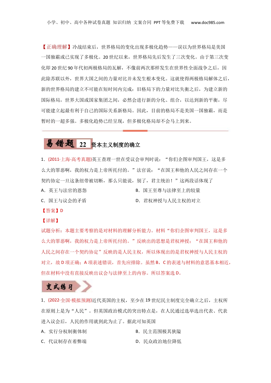 小学、初中、高中各种试卷真题知识归纳文案合同PPT等免费下载www.doc985.com易错点05近代世界的政治制度易错题【22】资本主义制度的确立【正确理解】19世纪初—19世纪中期,资本主义制度最终战胜封建制度,在世界范围内确立统治地位的时期1.19世纪六七十年代,资产阶级革命和改革运动在世界许多地区展开,美国、德意志、意大利、俄国和日本等国家通过不同方式,走上了迅速发展资本主义的道路。到这时,已可断言资本主义制度在世界上得以确立了。自由主义潮流:(1)19世纪20年代,西班牙、南斯拉夫、希腊都发生了资产阶级革命。1830年法国的七月革命和比利时革命,是两次胜利的革命,1832年英国议会还进行了民主改革。(2)1848年爆发的波及整个欧洲的资产阶级民族民主革命,沉重打击了欧洲封建势力,彻底瓦解了维也纳体系,有利于资本主义进一步发展。(3)1861年俄国农奴制改革,从此俄国走上资本主义发展道路。(4)1861-1865年的美国南北战争,是第二次资产阶级革命,它维护了国家的统一,废除了农奴制度,进一步扫除了资本主义发展障碍。(5)19世纪中期德意通过王朝战争完成了国家统一,走上了资本主义发展道路。(6)19世纪中期,日本通过明治维新也走上了资本主义发展道路。易错题【23】冷战美国政策的比较【正确理解】政治上:美国提出了杜鲁门主义;苏联成立了情报局,与美国抗衡。经济上:美国援助西欧各国,控制西欧,遏制苏联;苏联成立互助会,建社会主义国家阵营。军事上:美国成立了北约组织,此后苏联成立了华约组织。易错题【24】社会主义阵营与《华沙条约组织》【正确理解】社会主义阵营不等同于《华沙条约组织》——误以为是一回事。二战后社会主义阵营的形成,是在1949年中华人民共和国的建立以后。新中国的建立和与苏联、欧亚各人民民主国家建交,在各方面开展的广泛合作,标志着社会主义阵营的形成。因苏联走上霸权主义的道路,以中苏关系的破裂、社会主义国家间原有的合作遭到破坏为标志,社会主义阵营瓦解。而华约组织到1955年才形成,它的成员只包含苏联和东欧社会主义国家等共8国。它是因美国在欧洲挑起冷战、苏联被迫应战而建立,并充当了苏联与美国争霸的工具。它并未因中苏关系破裂、社会主义国家之间的合作遭到破坏而瓦解,一直存在到苏东剧变(东欧剧变)发生、两极格局瓦解。易错题【25】20世纪下半叶世界的新变化小学、初中、高中各种试卷真题知识归纳文案合同PPT等免费下载www.doc985.com【正确理解】冷战结束后,世界格局的变化出现多极化趋势——误以为世界格局是美国一国独霸或已实现了多极化。20世纪以来,世界格局先后发生了三次变化。由于第三次变化即20世纪90年代初两极格局的瓦解,不像前两次那样发生在世界性全面战争之后,因此除苏联以外,世界大国之间的力量对比并未发生根本变化。这就使得两极格局解体之后,新的世界格局的建立不可能在短时间内完成:旧格局下的力量对比失衡之后,为建立新的国际格局,世界大国或国家集团之间,必然会进行新的分化、组合,以达到新的平衡,尽可能建立起最有利于自己的国际关系新格局。因此,目前的格局不是美国一国独霸,而是暂时的一超多强。多极化趋势已经呈现,但多极化格局却不会马上到来。22资本主义制度的确立1.(2011·上海·高考真题)英王查理一世在受议会审判时说:“你们企图审判国王,这是多么大的罪恶啊,我的权力是上帝所托付的。”法官说:“在国王和他的人民之间存在一个契约协定一旦这条纽带被切断,那么只能说,别了,君主统治!”这两段话体现了A.英王与法官的恩怨B.国王至尊与法律至上的较量C.国王与议会的矛盾D.君权神授与人民主权的对立【答案】D【详解】试题分析:本题主要考察的是对材料的理解分析能力。材料“你们企图审判国王,这是多么大的罪恶啊,我的权力是上帝所托付的。”反映出的思想是君权神授;“在国王和他的人民之间存在一个契约协定”反映的是人民主权,所以体现出的是君权神授与人民主权的对立,故D项正确;A项表述错误,首先应排除。虽然B,C的表述与材料的意思基本相近,但在材料中没有直接反映出议会与法律至上的内容。所以答案选D。1.(2022·全国·模拟预测)近代...