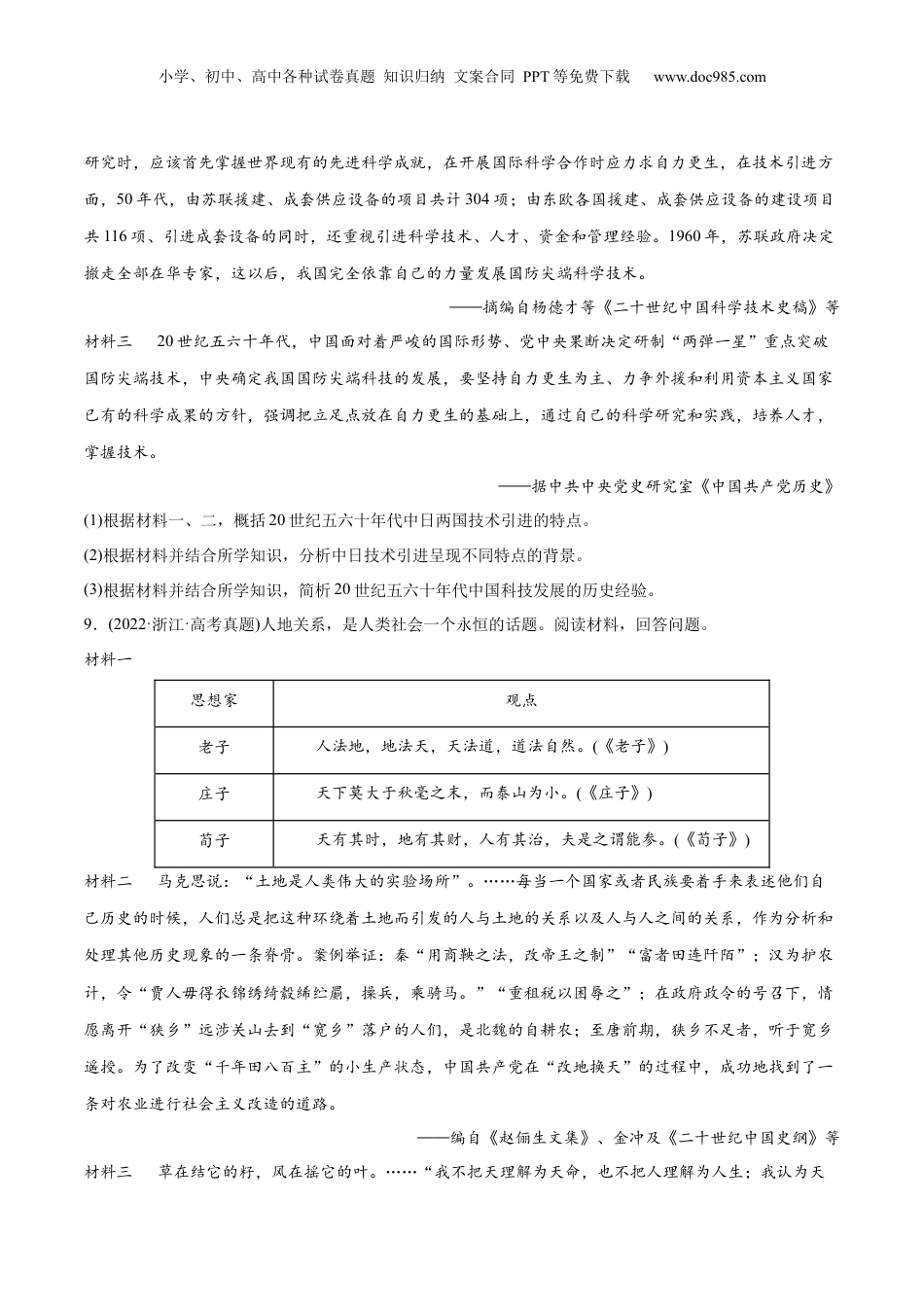 小学、初中、高中各种试卷真题知识归纳文案合同PPT等免费下载www.doc985.com专题08共和国年轮(1949至今)1.(2022·1浙江·高考真题)20世纪50年代中期,周恩来在印度尼西亚举行的某国际会议上强调中国代表团是来求团结而不是来吵架的”,会议最终通过了《关于促进世界和平和合作宣言》这次会议上,周恩来作出的重要贡献有A.鲜明地提出了“求同存异”的方针B.就印度支那停止敌对行动提出六点建设性意见C.首次提出了“和平共处五项原则”D.阐述了以结伴而不结盟为核心的新型国家关系2.(2022·全国甲卷·高考真题)如图为1978年和1987年全国社会商品零售总额中各经济成分所占比重图。图示占比变化反映出()A.经济体制改革目标的实现B.民众就业观念的转变C.计划管理调控作用的增强D.经济结构调整的完成3.(2022·6浙江·高考真题)深圳经济特区在中国对外开放的历程中举足轻重。2020年,习近平总书记在深圳经济特区建立四十周年庆祝大会上发表讲话,指出:“深圳是改革开放后党和人民一手缔造的崭新城市,是中国特色社会主义在一张白纸上的精彩演绎。”回眸历史,愈加凸显出深圳经济特区的不一般,这个不一般就在于它是()A.多边贸易体制主导下的成果B.国际竞争力持续增强的产物C.深化改革扩大开放的重要成就D.对外开放的窗口和经济体制改革的“试验田”4.(2022·湖南·高考真题)1992年中共十四大做出了“积极建立待业、养老、医疗等社会保障制度”的决定。小学、初中、高中各种试卷真题知识归纳文案合同PPT等免费下载www.doc985.com1993年十四届三中全会明确提出进一步健全失业保险制度。“待业保险”正式更名为“失业保险”。这一变化反映了()A.经济改革引发失业现象B.社会主义市场经济体制建立C.社会保障制度已经完善D.思想解放推动经济体制改革5.(2022·全国乙卷·高考真题)下图是1978年与1986年北京郊区男户主职业占比变化情况。这一变化的产生主要是由于()6.(2022·1浙江·高考真题)20世纪80年代的上海浦东还是“阡陌纵横、鸡犬相闻”,民间戏言“到上海要摆渡,到农村跨一步”。1990年4月,中共中央、国务院做出开发开放上海浦东地区的决策。随后,金融街、科技3园区等相继在这片土地上出现。下列项中,关于浦东开发开放的意义,表述正确的是A.标志着改革的重心从农村转向城市B.成为中国进步对外开放的重要标志C.开辟了建设中国特色社会主义的新道路D.成为中国第一个国家级经济技术开发区7.(2022·6浙江·高考真题)新华社北京某日讯:“一九七七年全国高等学校招生考试,到今天为止已经胜利结束。广大人民赞扬这次高校招生考试……(是)向‘四个现代化’进军,广开才路的盛举。”这场冬季里的春闱,在当时引起了强烈反响。恢复高考制度是邓小平同志作出的一项重要决策,在当时是()A.拨乱反正的一个重要标志B.“科教兴国”战略的理论基础C.新时期教育事业发展指导方针D.改革开放步入新阶段的标志8.(2022·全国·高考真题)阅读材料,完成下列要求。材料一20世纪50年代,日本颁布“外资法”等一系列法规,加强对技术引进的管理,政府有关部门根据不同时期经济发展的需要,列出鼓励进口和限制进口的技术项目,对私人企业的技术引进加以指导,其后,日本政府逐渐放宽引进技术的管理和审查标准,企业决定引进方式和内容,并承担引进过程中的一切风险,所引进的技术主要来自欧美。1962年到1966年,在企业提出的技术引进申请中,有90.4%获得了批准。——摘编自王永生《技术进步及其组织——日本的经验与中国的实践》等材料二新中国成立后即确立发展科技的方针。1956年,国家制定12年科技规划,明确提出在进行科学小学、初中、高中各种试卷真题知识归纳文案合同PPT等免费下载www.doc985.com研究时,应该首先掌握世界现有的先进科学成就,在开展国际科学合作时应力求自力更生,在技术引进方面,50年代,由苏联援建、成套供应设备的项目共计304项;由东欧各国援建、成套供应设备的建设项目共116项、引进成套设备的同时,还重视引进科学技术、人才、资金和管理经验。1960年,苏联政府决定撤走全部在华专家,这以后,我国完全依靠自己的力量发展国防尖端科学技术。...