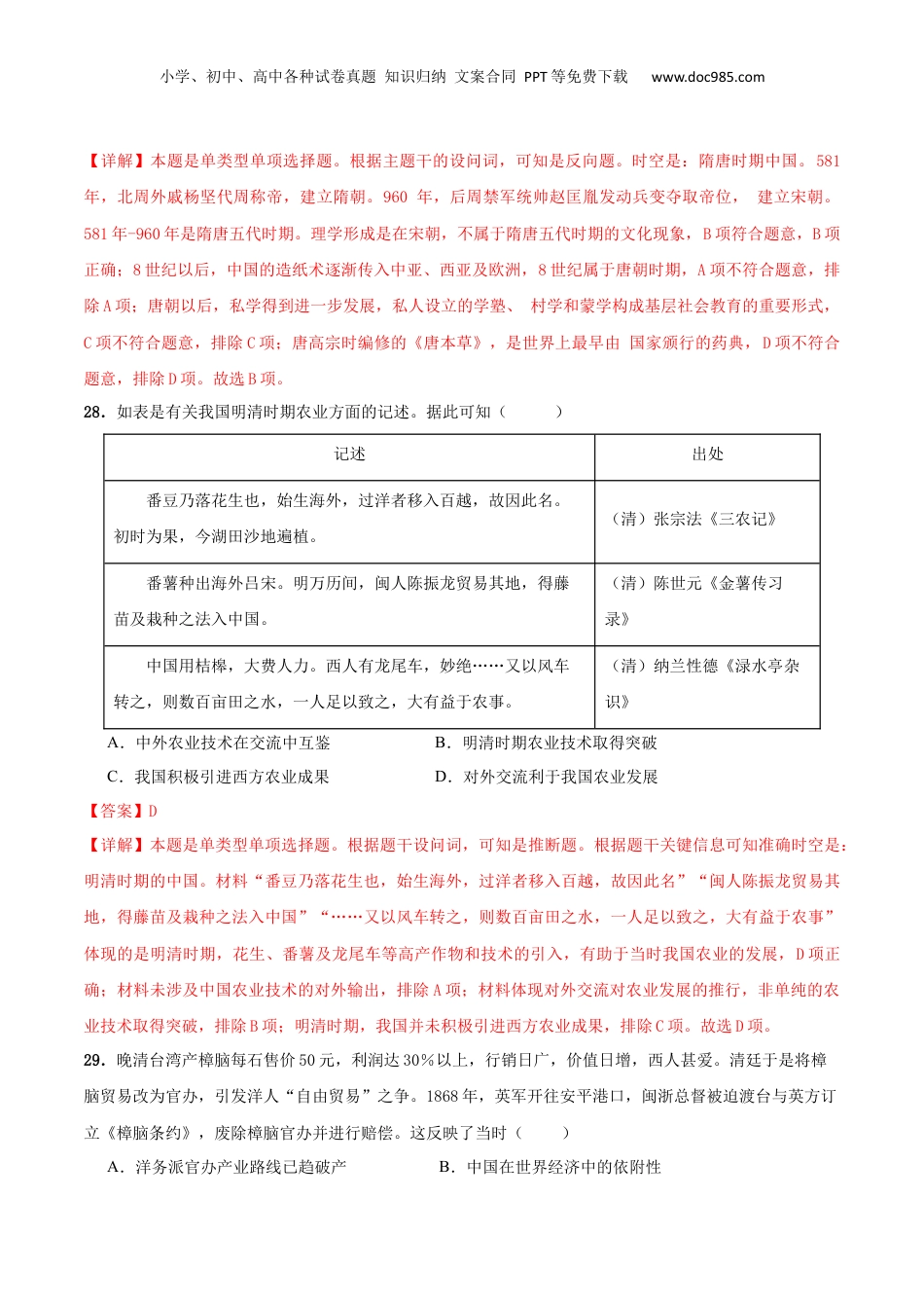 小学、初中、高中各种试卷真题知识归纳文案合同PPT等免费下载www.doc985.com2024年高考历史考前抢分押题卷(新课标卷)(河南、山西、新疆、西藏、云南专用)(本试卷满分100分,考试时间50分钟。)注意事项:1.答卷前,考生务必将自己的姓名、准考证号等填写在答题卡和试卷指定位置上。2.回答选择题时,选出每小题答案后,用铅笔把答题卡上对应题目的答案标号涂黑。如需改动,用橡皮擦干净后,再选涂其他答案标号。回答非选择题时,将答案写在答题卡上。写在本试卷上无效。3.考试结束后,将本试卷和答题卡一并交回。第Ⅰ卷一、选择题:本题共12小题,每小题4分,共48分。在每小题给出的四个选项中,只有一项符合题目要求。24.山西陶寺遗址是中华文明古国阶段晚期代表性遗址。考古发掘出土了彩陶、漆木器、玉器等器物,其中鼍鼓、石磬、土鼓等在大墓中随葬的数量、组合和布设位置都是固定和统一的。即使几座大墓的入葬时间至少相距百年,上述规制也无明显变化。据此可知()A.神权在陶寺社会中占据主导B.中原核心的文明格局基本形成C.古国阶段晚期初步形成礼制D.陶寺文化具有兼收并蓄的特征【答案】C【详解】本题是单类型单项选择题。据本题主题干的设问词,可知这是推断题。据本题时间信息可知准确时空是:新石器时代(中国)。据材料“考古发掘出土了彩陶、漆木器、玉器等器物,其中鼍鼓、石磬、土鼓等在大墓中随葬的数量、组合和布设位置都是固定和统一的”及所学知识可知,这些鼓、磬等在数量、组合、位置上的固定和统一,反映了这些乐器明显具有了礼仪性的功能,体现了此时期初步形成了礼制,C项正确;材料反映的是礼制,而非神权,不能反映神权在陶寺社会中占据主导,排除A项;材料只涉及陕西陶寺遗址的情况,不能得知“中原核心的文明格局”,排除B项;材料没有涉及陶寺文化中的礼制是否受到了其他文化影响,不能得知陶寺文化具有兼收并蓄的特征,排除D项。故选C项。25.论及战国时期某一学派,古代有学者指出:“盖出于清庙之守。茅屋采椽,是以贵俭。……宗祀严父,是以右鬼;顺四时而行,是以非命;以孝视天下,是以上同,此其所长也。及蔽者为之,见俭之利,因以非礼,而不知别亲疏。”下列选项中,属于这一学派的思想主张是(⋯⋯)A.“相生相胜”B.“和实生物,同则不继”小学、初中、高中各种试卷真题知识归纳文案合同PPT等免费下载www.doc985.comC.“以吏为师”D.“夫尚贤者,政之本也”【答案】D【详解】本题是单类型单项选择题。据本题主题干的设问词,可知这是正向题。据本题时间信息可知准确时空是:战国时期(中国)。根据材料“盖出于清庙之守。茅屋采椽,是以贵俭。……宗祀严父,是以右鬼;顺四时而行,是以非命;以孝视天下,是以上同,此其所长也。及蔽者为之,见俭之利,因以非礼,而不知别亲疏”可知,该学派崇尚节俭,主张非命,重视宗法,主张“上同”,结合所学可知,这是⋯⋯墨家的主张,“夫尚贤者,政之本也”是墨家的主张,D项正确;“相生相胜”是阴阳家的主张,排除A项;“和实生物,同则不继”意为实现了和谐,则万物即可生长发育,如果完全相同一致,则无法发展、继续,是先秦时期思想家史伯的观点,排除B项;“以吏为师”是法家的主张,排除C项。故选D项。26.云梦秦简《厩苑律》中规定:每年对各县的官用牛考核一次,有十头以上,一年间死了三分之一,不满十头的一年间死了三头,主管牛的吏、饲牛的徒、令、丞都有罪。《秦律杂抄》也规定:十头成年母牛要生六头小牛,十头母羊要生四头小羊,否则饲养者要受到“费一盾”的惩罚。这些规定()A.反映了以法治国的统治模式B.佐证了重农抑商统治政策C.适应了小农经济发展的需要D.体现了基层治理的规范性【答案】C【详解】本题是多类型单项选择题。据本题次题干的提示词,可知这是本质题、推断题。据本题时间信息可知准确时空是:秦朝(中国)。根据材料“《厩苑律》中规定:”可每年对各县的官用牛考核一次,有十头以上,一年间死了三分之一,不满十头的一年间死了三头,主管牛的吏、饲牛的徒、令、丞都有罪。“结合所学知识可知,秦朝对过度使用耕牛的问题进行处罚,体现了秦...
