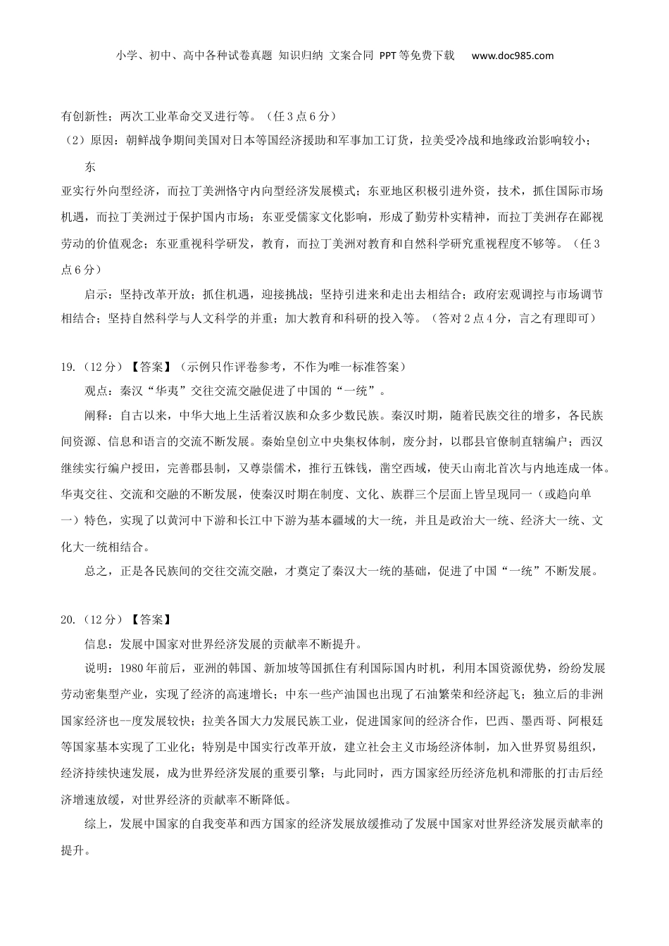 小学、初中、高中各种试卷真题知识归纳文案合同PPT等免费下载www.doc985.com2024年高考历史考前抢分押题卷(广东卷)参考答案(本试卷满分100分,考试时间75分钟)一、选择题:本题共16小题,每小题4分,共48分。12345678910CCDDDBCCBC111213141516DBDDAD二、非选择题:本题共4小题,共52分。17.(14分)【答案】(1)特点:兼具报时和预警功能;钟楼或鼓楼单独修建、配合使用;钟楼和鼓楼对设布局;钟鼓楼逐渐脱离衙署;出现在城市的中心地段;逐渐制度化。(任2点4分)(2)背景:鸦片战争后,传教士获得在通商口岸和内地城市游历和传教的特权;西方工业文明的传入;西方时间观念的影响;电报技术的迅速引入、应用及其与世界时的配合使用;中国近代工业和近代生活的需要;政府的倡导和支持;中西方联系加强。(任3点6分)(3)认识:巩固新生人民政权;维护多民族国家统一;指导民众生产与生活;有利于对外交往。(任2点4分)18.(14分)【答案】(1)起点低,起步晚,发展快;学习外来科技成果;政府起推动作用;具有民族主义倾向;工业化道路具小学、初中、高中各种试卷真题知识归纳文案合同PPT等免费下载www.doc985.com有创新性;两次工业革命交叉进行等。(任3点6分)(2)原因:朝鲜战争期间美国对日本等国经济援助和军事加工订货,拉美受冷战和地缘政治影响较小;东亚实行外向型经济,而拉丁美洲恪守内向型经济发展模式;东亚地区积极引进外资,技术,抓住国际市场机遇,而拉丁美洲过于保护国内市场;东亚受儒家文化影响,形成了勤劳朴实精神,而拉丁美洲存在鄙视劳动的价值观念;东亚重视科学研发,教育,而拉丁美洲对教育和自然科学研究重视程度不够等。(任3点6分)启示:坚持改革开放;抓住机遇,迎接挑战;坚持引进来和走出去相结合;政府宏观调控与市场调节相结合;坚持自然科学与人文科学的并重;加大教育和科研的投入等。(答对2点4分,言之有理即可)19.(12分)【答案】(示例只作评卷参考,不作为唯一标准答案)观点:秦汉“华夷”交往交流交融促进了中国的“一统”。阐释:自古以来,中华大地上生活着汉族和众多少数民族。秦汉时期,随着民族交往的增多,各民族间资源、信息和语言的交流不断发展。秦始皇创立中央集权体制,废分封,以郡县官僚制直辖编户;西汉继续实行编户授田,完善郡县制,又尊崇儒术,推行五铢钱,凿空西域,使天山南北首次与内地连成一体。华夷交往、交流和交融的不断发展,使秦汉时期在制度、文化、族群三个层面上皆呈现同一(或趋向单一)特色,实现了以黄河中下游和长江中下游为基本疆域的大一统,并且是政治大一统、经济大一统、文化大一统相结合。总之,正是各民族间的交往交流交融,才奠定了秦汉大一统的基础,促进了中国“一统”不断发展。20.(12分)【答案】信息:发展中国家对世界经济发展的贡献率不断提升。说明:1980年前后,亚洲的韩国、新加坡等国抓住有利国际国内时机,利用本国资源优势,纷纷发展劳动密集型产业,实现了经济的高速增长;中东一些产油国也出现了石油繁荣和经济起飞;独立后的非洲国家经济也--度发展较快;拉美各国大力发展民族工业,促进国家间的经济合作,巴西、墨西哥、阿根廷等国家基本实现了工业化;特别是中国实行改革开放,建立社会主义市场经济体制,加入世界贸易组织,经济持续快速发展,成为世界经济发展的重要引擎;与此同时,西方国家经历经济危机和滞胀的打击后经济增速放缓,对世界经济的贡献率不断降低。综上,发展中国家的自我变革和西方国家的经济发展放缓推动了发展中国家对世界经济发展贡献率的提升。小学、初中、高中各种试卷真题知识归纳文案合同PPT等免费下载www.doc985.com