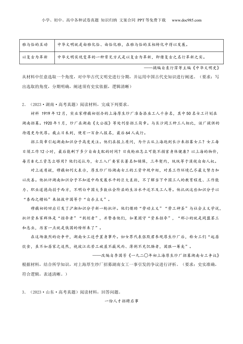 小学、初中、高中各种试卷真题知识归纳文案合同PPT等免费下载www.doc985.com押新高考第20题论述题高考历史论述题注重考查学生的价值观,包括爱国主义、集体主义、社会主义核心价值观等。这类题目通常会以具体的历史事件或人物为背景,让学生分析其对当代社会的启示或影响。更加强调学生的历史素养,包括历史知识、历史思维、历史方法等。这类题目通常要求学生运用历史知识,结合自己的理解和见解,进行深入的分析和阐述。会更多地采用情境化的设计,如设置特定的历史时期、地点、事件等作为背景,让学生在具体的时空背景下进行分析和思考。更加注重创新性,如创设新颖的试题情境、题目条件、设问方式,考查学生的思维灵活性和创造性。更加注重考查学生的基本功、综合能力和应用能力,如对历史知识的掌握程度、对历史事件的综合分析能力、对历史知识的实际应用能力等。1.(2023·广东·高考真题)阅读材料并结合所学知识,完成下列要求。材料中华文明源远流长,其演进过程可从以下几个角度予以探究。角度内涵多元一体格局的形成中华文明的演进过程,在很大程度上可以视为不同地域的文明以及不同民族的文明,在交往中整合为一体的过程。多民族的交融中华文明的发展史从一个侧面来看就是多民族不断交融、共同创造的历史。外来文明的吸收中华文明不断与域外异质文明接触,积极吸收外来文化,具有很强的包容性。小学、初中、高中各种试卷真题知识归纳文案合同PPT等免费下载www.doc985.com雅与俗的互动中华文明就是由雅化俗、由俗化雅,在雅与俗的互相转化中得以发展。以复古为革新中华文明实现变革的一种常见方式是以复古为革新,即借复古之名行革新之实。——摘编自袁行霈等主编《中华文明史》从材料中任意选取一个角度,对中华古代文明史进行分期,并运用中国古代史知识进行阐述。(要求:写出选取的角度,分期明确,阐述须有史实依据,逻辑清晰)2.(2023·湖南·高考真题)阅读材料,完成下列要求。材料1919年12月,实业家穆藕初创办的上海厚生纱厂准备添雇工人千余名,其中50名女工计划在湖南招募。1920年1月,纱厂在湖南《大公报》等处刊登招工简章。与长沙同工种工人相比,该厂提供的待遇更为优厚。截止日未到,便有一百余人报名,最后64人成行。招工简章引起湖南知识分子高度关注。他们在报上质问,为什么从上海跑到长沙来招募女工?女工每日须工作12小时,最后能剩下多少自由支配的时间?日夜轮班怎么可能不损害身体健康?以上海的物价,每月8元工资怎么够用?他们还认为,女工入厂要家长署名加铺保,三年契约,统统等于漠视自由人权。对上述质疑,穆藕初刊文表示,厚生纱厂给湖南女工的工资中规中矩,对其工作环境已尽最大努力加以改善。他批评湖南知识分子不知道中西发展水平的巨大差距,不了解当下中国工人的教育程度、工作能力、职业道德尚弱于西方,不明白中国大多数社会阶层的生活水平还不及工人等。他讥讽这些知识分子以“泰西之糟粕”来拯救中国等于“自杀主义”。穆藕初的回应引发了沪湘知识分子新一轮批评。他们借助“劳动主义”“劳工神圣”与社会主义学说,批评资本家群体是“掠夺者”“剥削者”,并警告他们,如果固守“资本掠夺”,“那小的就是同盟罢工和息业,厉害一点就是俄国的榜样来了”。在这场激烈的论争中,湖南女工近乎置身事外。妇女界代表张默君参观厚生纱厂后,称女工们“起居饮食,虽不如居家之适然,视彼江北苦工破屋不蔽风雨、薄粥不充饥肠者,固胜一筹矣”。——改编自李国芳《一九二○年初上海厚生纱厂招募湖南女工争议》根据材料,结合所学知识,对上海厚生纱厂招募湖南女工一事引发的争议进行评析。(要求:史实准确,符合逻辑,表述清晰。)3.(2023·山东·高考真题)阅读材料,回答问题。一份人才招聘启事小学、初中、高中各种试卷真题知识归纳文案合同PPT等免费下载www.doc985.com1981年9月17日,深圳市蛇口工业区在《广州日报》登载了一份人才招聘启事。为适应我区建设发展需要,经上级批准,拟在广州招收一批有志于企业管理的技术人才,进行企业管理、外贸业务和商业英语等知识的培训,为期一年。结业后,由我区统一分配到区内各企...