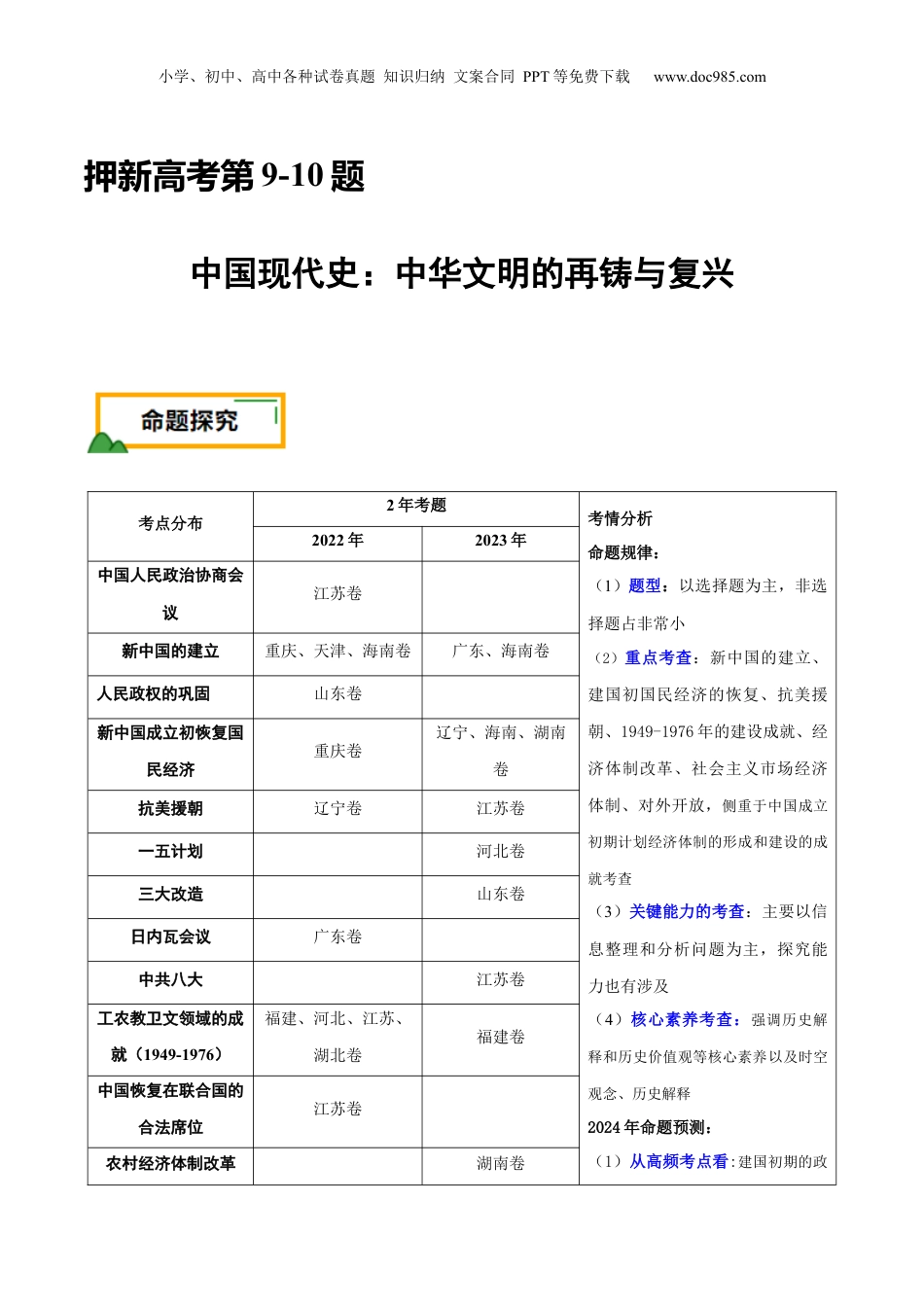 小学、初中、高中各种试卷真题知识归纳文案合同PPT等免费下载www.doc985.com押新高考第9-10题中国现代史:中华文明的再铸与复兴考点分布2年考题考情分析命题规律:(1)题型:以选择题为主,非选择题占非常小(2)重点考查:新中国的建立、建国初国民经济的恢复、抗美援朝、1949-1976年的建设成就、经济体制改革、社会主义市场经济体制、对外开放,侧重于中国成立初期计划经济体制的形成和建设的成就考查(3)关键能力的考查:主要以信息整理和分析问题为主,探究能力也有涉及(4)核心素养考查:强调历史解释和历史价值观等核心素养以及时空观念、历史解释2024年命题预测:(1)从高频考点看:建国初期的政2022年2023年中国人民政治协商会议江苏卷新中国的建立重庆、天津、海南卷广东、海南卷人民政权的巩固山东卷新中国成立初恢复国民经济重庆卷辽宁、海南、湖南卷抗美援朝辽宁卷江苏卷一五计划河北卷三大改造山东卷日内瓦会议广东卷中共八大江苏卷工农教卫文领域的成就(1949-1976)福建、河北、江苏、湖北卷福建卷中国恢复在联合国的合法席位江苏卷农村经济体制改革湖南卷小学、初中、高中各种试卷真题知识归纳文案合同PPT等免费下载www.doc985.com权巩固、经济恢复、抗美援朝及改革开放前的建设成就、经济体制改革、社会主义市场经济体制建立,对外开放(2)从考查形式看:注重从历史角城市经济体制改革山东卷福建、辽宁、江苏卷社会主义市场经济体制的建立湖南卷天津、重庆、海南、湖北卷对外开放江苏、湖北卷山东卷综合国力显著提升河北卷中共十八大、中华民族伟大复兴山东卷1.(2023·河北·高考真题)第一个五年计划期间,全国总工会号召在国营企业开展劳动竞赛。上海机床厂劳动模范盛利改进了39种工具,创造了3年完成5年工作量、产品质量合格率月均达到99%以上的优异成绩。这体现出()A.社会主义工业化建设顺利推进B.社会主义建设总路线得到贯彻C.技术革新助力了经济体制改革D.社会主义改造工作的有序开展【答案】A【详解】本题是单类型单项选择题。据本题主题干的设问词,可知这是本质题。据本题时间信息可知准确时空是建国初期一五计划时期的中国。据材料“劳动模范盛利的事迹作为一五计划期间国营企业开展劳动竞赛的典型”并结合所学可知,当时处于一五计划、工业化建设时期,广大国营企业通过劳动竞赛改进了生产工具,提高了生产效率,推动了生产力的进步,这反映了社会主义工业化建设顺利推进,A项正确;社会主义建设总路线于1958年提出,经济体制改革在1978年中共十一届三中全会之后逐渐展开,而材料时间是1953年至1957年,排除BC项;材料涉及的是一五计划,不是三大改造,排除D项。故选A项。2.(2023·福建·高考真题)下表为1952年、1978年我国农业发展的部分指标。农业的这种巨大变化主要反映了()类别年份农业机械总动力(万马力)机械耕种面积(万公顷)机电灌溉面积(万公顷)化肥施用量(万吨)农业用电量(亿度)小学、初中、高中各种试卷真题知识归纳文案合同PPT等免费下载www.doc985.com1952年2513.631.77.80.51978年1597540672489.5884253.1A.计划经济体制的确立B.农业合作社的发展C.国家重农政策的贯彻D.工业对农业的反哺【答案】D【详解】本题是单类型单项选择题。据本题主题干的设问词,可知这是本质题。据本题时间信息可知准确时空是:1952年-1978年(中国)。据材料信息可知,在新中国成立初期,农业机械总动力、机械耕种面积、机电灌溉面积、化肥施用量、农业用电量整体水平均较低,1978年时则有了显著提高,结合所学知识可知,在1952年到1978年,经过一五计划及以后的社会主义建设,工业化水平和科技发展水平提高,进而提高了农业的机械化、科技化水平,D项正确;1956年底我国的计划经济体制基本形成,与材料时间不符。仅从农业机械化水平提高不能断定经济体制情况,排除A项;建立农业生产合作社是新中国成立初对农业进行社会主义改造的主要方式,1958年人民公社化运动开展后,农业生产合作社成为人民公社的生产队,故农业合作社的发展不能解释材料所述农业变化,排除B项;据所学知识可知,一五计划期间,国家采取优先发展重工业的政...