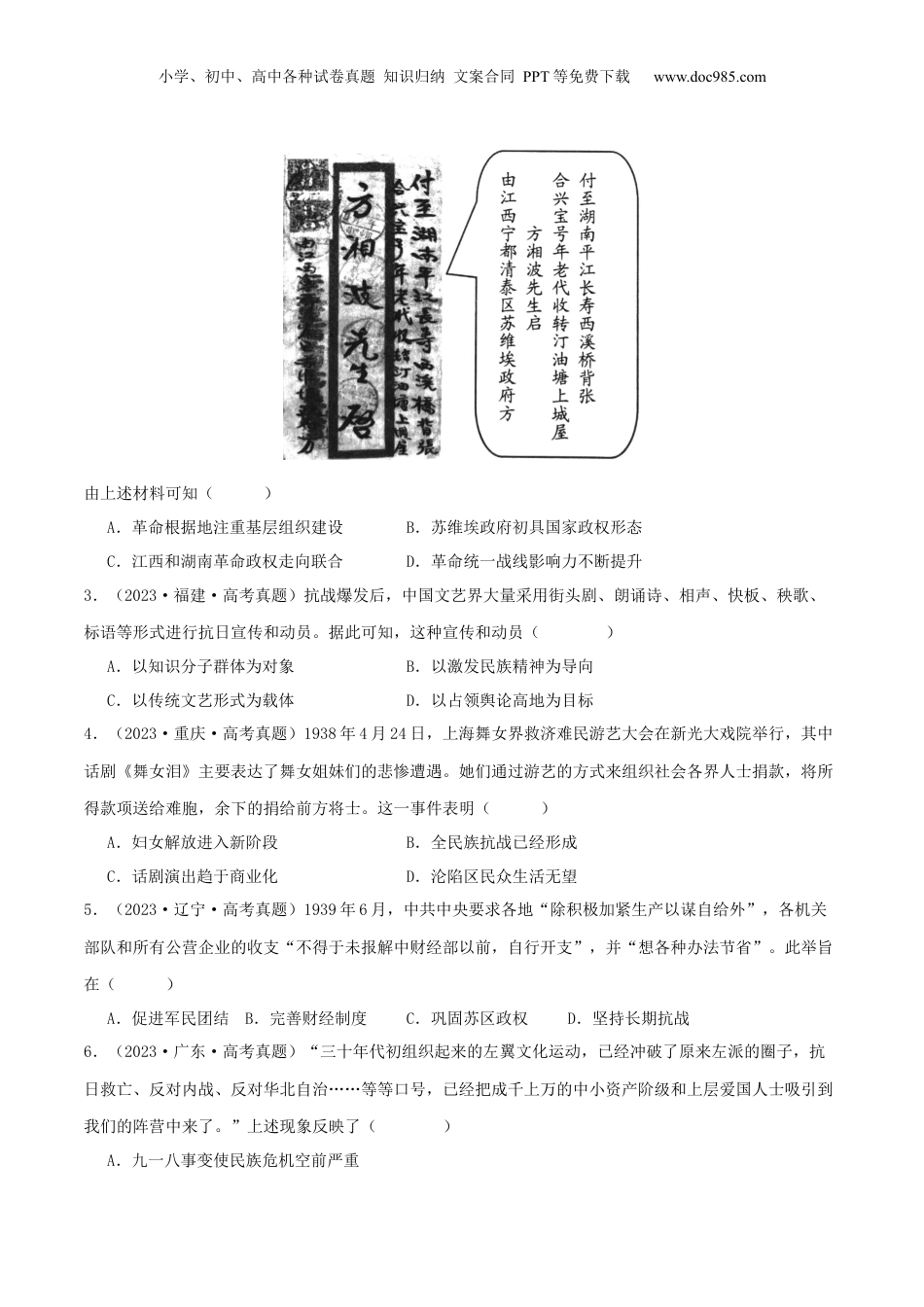 小学、初中、高中各种试卷真题知识归纳文案合同PPT等免费下载www.doc985.com押新高考第7-8题从辛亥革命至抗日战争考点分布2年考题考情分析命题规律:(1)题型:以选择题为主,非选择题也较多(2)重点考查:辛亥革命、新文化运动、国共合作与国民革命、五四运动和马克思主义的传播、土地革命、工农武装割据、局部与全面抗战、正面战场与敌后战场的抗战等,强调中共对民主革命道路的探索。非选择题在抗日战争里考查较多。(3)关键能力的考查:命题多提供新材料,以小角度切入,多层面综合考国民政府的政治、经济政策和新民主主义革命的发展历程,主要透过现象分析本质(4)核心素养考查:强调历史解释和历史价值观等核心素养2022年2023年辛亥革命重庆、天津、江苏卷国共合作与国民革命海南卷江苏卷新文化运动、妇女解放山东、广东卷天津卷五四运动和马克思主义的传播河北、辽宁、湖南、湖北卷山东、河北卷中国共产党的诞生天津卷中华民国的建立湖北卷北洋军阀、一战北京卷辽宁卷民国初的经济社会生活辽宁、江苏、湖南、湖北卷土地革命、工农武装割据福建卷河北、福建卷毛泽东思想辽宁卷日本侵华河北卷局部、全国抗战湖北、山东卷广东、福建、重小学、初中、高中各种试卷真题知识归纳文案合同PPT等免费下载www.doc985.com庆、湖南卷2024年命题预测:(1)从高频考点看:这一时期的历来的高考重点章节,主要体现在袁世凯时期的专制与民主的斗争、北洋政府统治时期的经济发展、国共合作领导的国民大革命运动、马克思主义的传播、全民族抗战形成、正面战场与敌后战正面战场、敌后战场海南、辽宁、北京、山东、湖北卷抗战的胜利江苏卷全面内战的爆发广东卷争取和平民主的斗争北京卷1.(2023·辽宁·高考真题)1914年9月,北京政府颁布《商会法》,规定商会对各级地方官厅行文一律用“呈”“禀”,地方官厅对商会则用“令”“批”。该法一经颁布就遭到商界人士的强烈反对。这反映了当时()A.文言文与白话文使用的矛盾B.愚昧观念与科学思想的斗争C.改良思想与革命理念的碰撞D.专制思想与民主观念的冲突2.(2023·河北·高考真题)下图为留存至今的一封实寄信件封面,上面贴有1930年3月“赣西南赤色邮政”的邮票。小学、初中、高中各种试卷真题知识归纳文案合同PPT等免费下载www.doc985.com由上述材料可知()A.革命根据地注重基层组织建设B.苏维埃政府初具国家政权形态C.江西和湖南革命政权走向联合D.革命统一战线影响力不断提升3.(2023·福建·高考真题)抗战爆发后,中国文艺界大量采用街头剧、朗诵诗、相声、快板、秧歌、标语等形式进行抗日宣传和动员。据此可知,这种宣传和动员()A.以知识分子群体为对象B.以激发民族精神为导向C.以传统文艺形式为载体D.以占领舆论高地为目标4.(2023·重庆·高考真题)1938年4月24日,上海舞女界救济难民游艺大会在新光大戏院举行,其中话剧《舞女泪》主要表达了舞女姐妹们的悲惨遭遇。她们通过游艺的方式来组织社会各界人士捐款,将所得款项送给难胞,余下的捐给前方将士。这一事件表明()A.妇女解放进入新阶段B.全民族抗战已经形成C.话剧演出趋于商业化D.沦陷区民众生活无望5.(2023·辽宁·高考真题)1939年6月,中共中央要求各地“除积极加紧生产以谋自给外”,各机关部队和所有公营企业的收支“不得于未报解中财经部以前,自行开支”,并“想各种办法节省”。此举旨在()A.促进军民团结B.完善财经制度C.巩固苏区政权D.坚持长期抗战6.(2023·广东·高考真题)“三十年代初组织起来的左翼文化运动,已经冲破了原来左派的圈子,抗日救亡、反对内战、反对华北自治……等等口号,已经把成千上万的中小资产阶级和上层爱国人士吸引到我们的阵营中来了。”上述现象反映了()A.九一八事变使民族危机空前严重小学、初中、高中各种试卷真题知识归纳文案合同PPT等免费下载www.doc985.comB.一二·九运动促进了中华民族的新觉醒C.卢沟桥事变发生后全面抗战开始D.国共合作推动抗日民族统一战线形成解题秘籍01辛亥革命掌握三民主义与辛亥革命对中国社会转型的影响(1)三民主义的内涵及评价内容民族主义民权主义民生主义含...