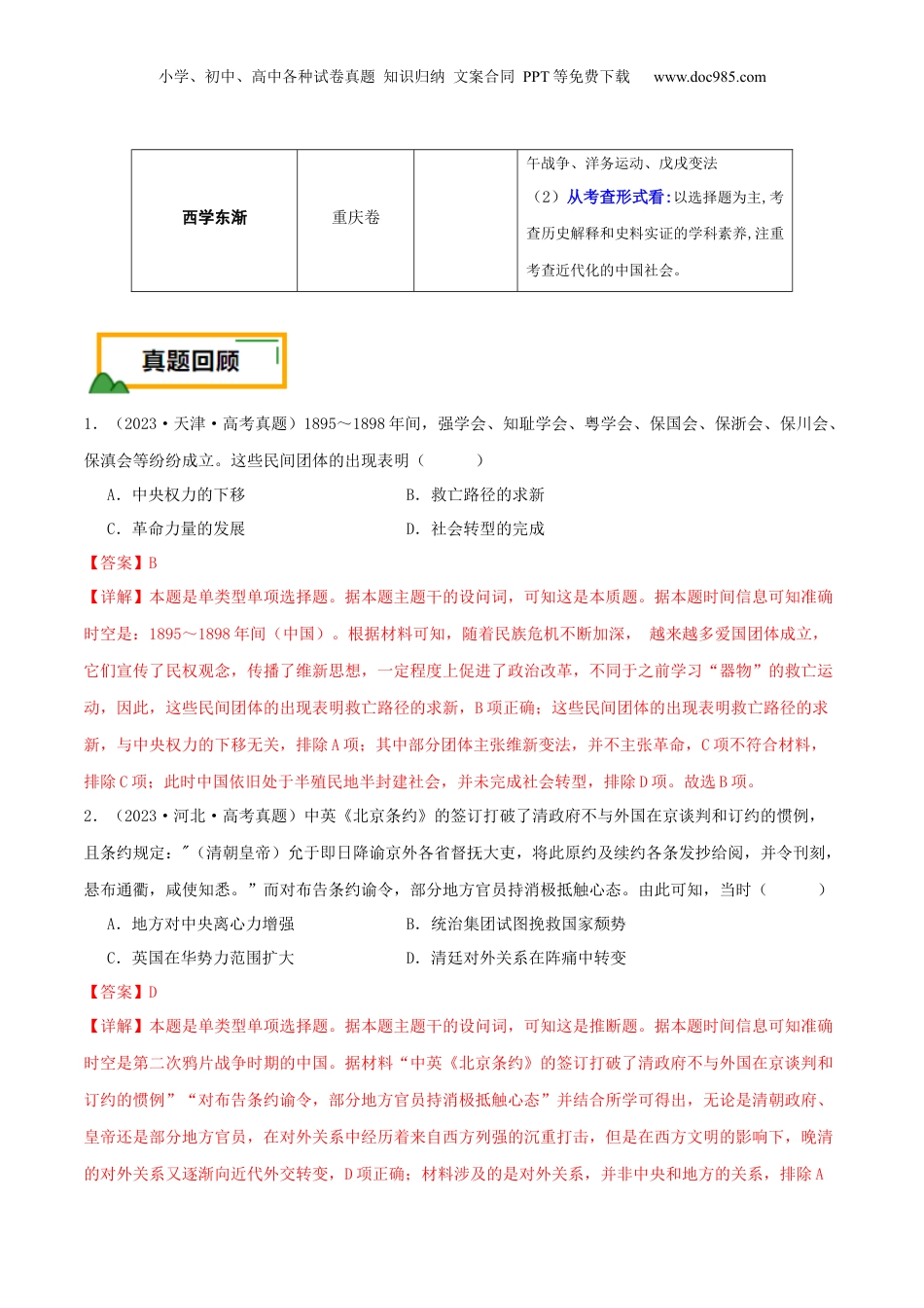 小学、初中、高中各种试卷真题知识归纳文案合同PPT等免费下载www.doc985.com押新高考第6题晚清:中华文明的变革与转型考点分布2年考题考情分析2022年2023年开眼看成世界福建、北京卷命题规律:(1)题型:主要集中于选择题,非选择题考查概率也不小(2)重点考查:政治史考查两次鸦战争、甲午战争、戊戌变法等;经济史侧重于对洋务运动、近代社会生活变迁的考查;文化史的开眼看成世界、洋务思想、维新思想等(4)关键能力的考查:主要集中于获取历史信息,对概念的深度理解,特别是政治制度之间的关系和文化概念的内涵;(5)核心素养考查:主要集中于时空观念、史料实证和历史解释。渗透唯物史观和历史价值观的考查。2024年命题预测:(1)从高频考点看:两次鸦战争、甲晚清选官制度的变革天津卷第一次鸦片战辽宁、北京卷第二次鸦片战争湖北卷天津、河北、湖北卷开眼看世界北京卷太平天国运动湖北卷洋务运动山东、江苏卷河北、广东、海南卷边疆危机与甲午中日战争重庆卷福建、北京卷瓜分中国的狂潮北京卷重庆卷戊戌变法辽宁卷天津、江苏卷20世纪初民族危机湖南卷小学、初中、高中各种试卷真题知识归纳文案合同PPT等免费下载www.doc985.com午战争、洋务运动、戊戌变法(2)从考查形式看:以选择题为主,考查历史解释和史料实证的学科素养,注重考查近代化的中国社会。西学东渐重庆卷1.(2023·天津·高考真题)1895~1898年间,强学会、知耻学会、粤学会、保国会、保浙会、保川会、保滇会等纷纷成立。这些民间团体的出现表明()A.中央权力的下移B.救亡路径的求新C.革命力量的发展D.社会转型的完成【答案】B【详解】本题是单类型单项选择题。据本题主题干的设问词,可知这是本质题。据本题时间信息可知准确时空是:1895~1898年间(中国)。根据材料可知,随着民族危机不断加深,越来越多爱国团体成立,它们宣传了民权观念,传播了维新思想,一定程度上促进了政治改革,不同于之前学习“器物”的救亡运动,因此,这些民间团体的出现表明救亡路径的求新,B项正确;这些民间团体的出现表明救亡路径的求新,与中央权力的下移无关,排除A项;其中部分团体主张维新变法,并不主张革命,C项不符合材料,排除C项;此时中国依旧处于半殖民地半封建社会,并未完成社会转型,排除D项。故选B项。2.(2023·河北·高考真题)中英《北京条约》的签订打破了清政府不与外国在京谈判和订约的惯例,且条约规定:"(清朝皇帝)允于即日降谕京外各省督抚大吏,将此原约及续约各条发抄给阅,并令刊刻,悬布通衢,咸使知悉。”而对布告条约谕令,部分地方官员持消极抵触心态。由此可知,当时()A.地方对中央离心力增强B.统治集团试图挽救国家颓势C.英国在华势力范围扩大D.清廷对外关系在阵痛中转变【答案】D【详解】本题是单类型单项选择题。据本题主题干的设问词,可知这是推断题。据本题时间信息可知准确时空是第二次鸦片战争时期的中国。据材料“中英《北京条约》的签订打破了清政府不与外国在京谈判和订约的惯例”“对布告条约谕令,部分地方官员持消极抵触心态”并结合所学可得出,无论是清朝政府、皇帝还是部分地方官员,在对外关系中经历着来自西方列强的沉重打击,但是在西方文明的影响下,晚清的对外关系又逐渐向近代外交转变,D项正确;材料涉及的是对外关系,并非中央和地方的关系,排除A小学、初中、高中各种试卷真题知识归纳文案合同PPT等免费下载www.doc985.com项;统治集团试图挽救国家颓势在材料中体现不明显,排除B项;材料没有提到英国,更没有提到英国在华势力范围扩大,且《北京条约》也不只涉及到英国,排除C项。故选D项。3.(2023·福建·高考真题)19世纪90年代,中国各地的新设民族企业,常到上海、广州、厦门以较高的工资觅雇工人。这一现象可用于说明当时()A.产业工人的待遇丰厚B.资产阶级的救国实践C.通商口岸的产业优势D.晚清政府的政策支持【答案】C【详解】本题是单类型单项选择题。据本题主题干的设问词,可知这是本质题。据本题时间信息可知准确时空是:19世纪90年代(中国)。据本题材料“常到上海、广州、厦门以较高的工资觅雇工人。”并结合所学知识...