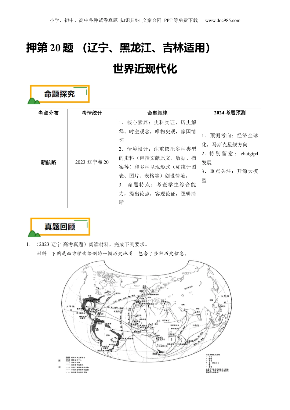 小学、初中、高中各种试卷真题知识归纳文案合同PPT等免费下载www.doc985.com押第20题(辽宁、黑龙江、吉林适用)世界近现代化考点分布考情统计命题规律2024考题预测新航路2023·辽宁卷201.核心素养:史料实证、历史解释、时空观念,唯物史观,家国情怀2.情境设计:注重依托多种类型的史料(包括文献原文、数据、档案等)和多种呈现形式(如统计图表、图片、表格等)创设情境。3.命题特点:考查学生综合能力,提出论点,客观论证,逻辑清晰1.预测考向:经济全球化,马斯克星舰方向2.特别留意:chatgtp4发展3.重点关注:开源大模型1.(2023·辽宁·高考真题)阅读材料,完成下列要求。材料下图是西方学者绘制的一幅历史地图,包含了多种历史信息。小学、初中、高中各种试卷真题知识归纳文案合同PPT等免费下载www.doc985.com紧扣材料所示信息,结合世界史相关知识,为该图命名,并阐释命名理由。(要求:名称中须包含时间尺度;史实准确,逻辑严谨,表述清晰)精准解密1近代城市化的影现积极响经济(1)带来生产方式的变化。城市化带来人口、土地、资金的集约,为工业发展提供了便利,促进工业化进程和经济的发展(2)推动城市工商业发展。城市拥有较多就业机会,改变了人口的地区结构和职业结构,人口不断离开农村,向城市集中(3)推动基础设施的发展与完善。城市排水、照明、交通、通信建设和医疗卫生、文化教育设施等都有较大发展政治(1)促进了政府职能现代化,提高了政府治理能力。城市化改变了传统的社会经济条件,给现有治理模式带来冲击与挑战,倒逼政府根据新的需要调整规划,进行职能转型与治理创新(2)有利于法治化进程。城市化使社会关系由礼俗社会转向法理社会,为法治观念的普及和法治化提供有效途径;城市化引发的社会关系和不良倾向需要法律来调节,这促进了法治建设思想文化引起了思想观念的变化。自然经济下,人们被传统价值观念束缚,城市中高度发展的现代文明使人们的思想意识、价值观念、行为方式等都有了很大的转变社会生活(1)引起家庭结构和功能的变化。家庭规模变小;家庭权力结构变化,趋向相对自主和自由;家庭功能减弱,许多传统功能逐渐向社会转移,家庭只是一个生活和生育子女的场所(2)推动居住条件的改善。建筑技术的革新改善居住条件,城市功能的完善为人们提供了便捷和丰富的生活服务(3)引起生活方式的变化。城市化加快了生活节奏,丰富了日常生活,改变了人们的交往方式精准解密2唯物史——本主世界市形成的原因观资义场(1)资本主义开放和扩张的本性是世界市场形成的根本推动力。资本主义经济的开放性特点必然促使资产阶级不断地开拓市场。(2)殖民扩张与掠夺是世界市场形成的主要途径。英、法、美等国的殖民扩张迫使亚非拉绝大部分国家和地区卷入资本主义世界市场。(3)两次工业革命是世界市场形成的助推剂。机器大生产促使资本主义到世界各地抢占商品销售市场和原料产地;垄断组织的产生、跨国公司的发展、资本的国际流通促使世界经济联系更为紧密。(4)科学技术的进步,特别是交通、通信工具的发展,为世界市场形成提供了必要的技术条件。精准解密3唯物史——子商和金融易人生活的影观电务网络贸对们响(1)电子商务对人类工作和生活方式的影响小学、初中、高中各种试卷真题知识归纳文案合同PPT等免费下载www.doc985.com①电子商务改变了人们的消费方式。网上购物的最大特征是消费者的主导性,购物意愿掌握在消费者手中;同时消费者还能以一种轻松自由的自我服务的方式来完成交易。②电子商务改变了企业的生产方式。电子商务是一种快捷、方便的购物手段,消费者的个性化、特殊化需要可以完全通过网络展示在生产厂商面前。为了取悦顾客,突出产品的设计风格,许多企业纷纷发展和普及电子商务。(2)金融网络贸易对人们生活的影响①各国经济紧密联系,牵一发而动全身,经济全球化日趋强化,人类命运息息相关。②国际分工降低了产品成本,从而降低了产品价格,使优质产品在世界范围内更加普及。③提高国民生活水平,人们可以享受来自世界各国的商品和服务,服务超越了国家界限。④影响文化和价值观,世界各地的文化、教育、宗...