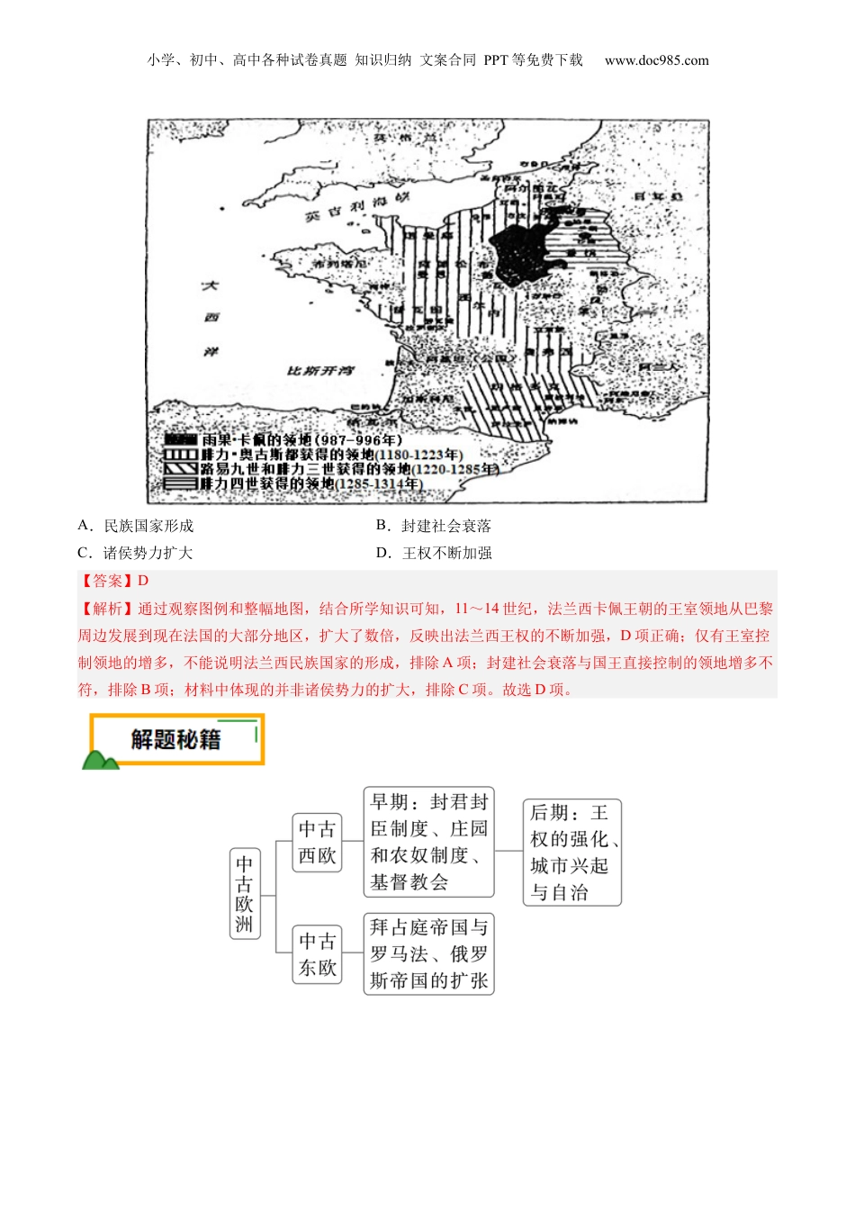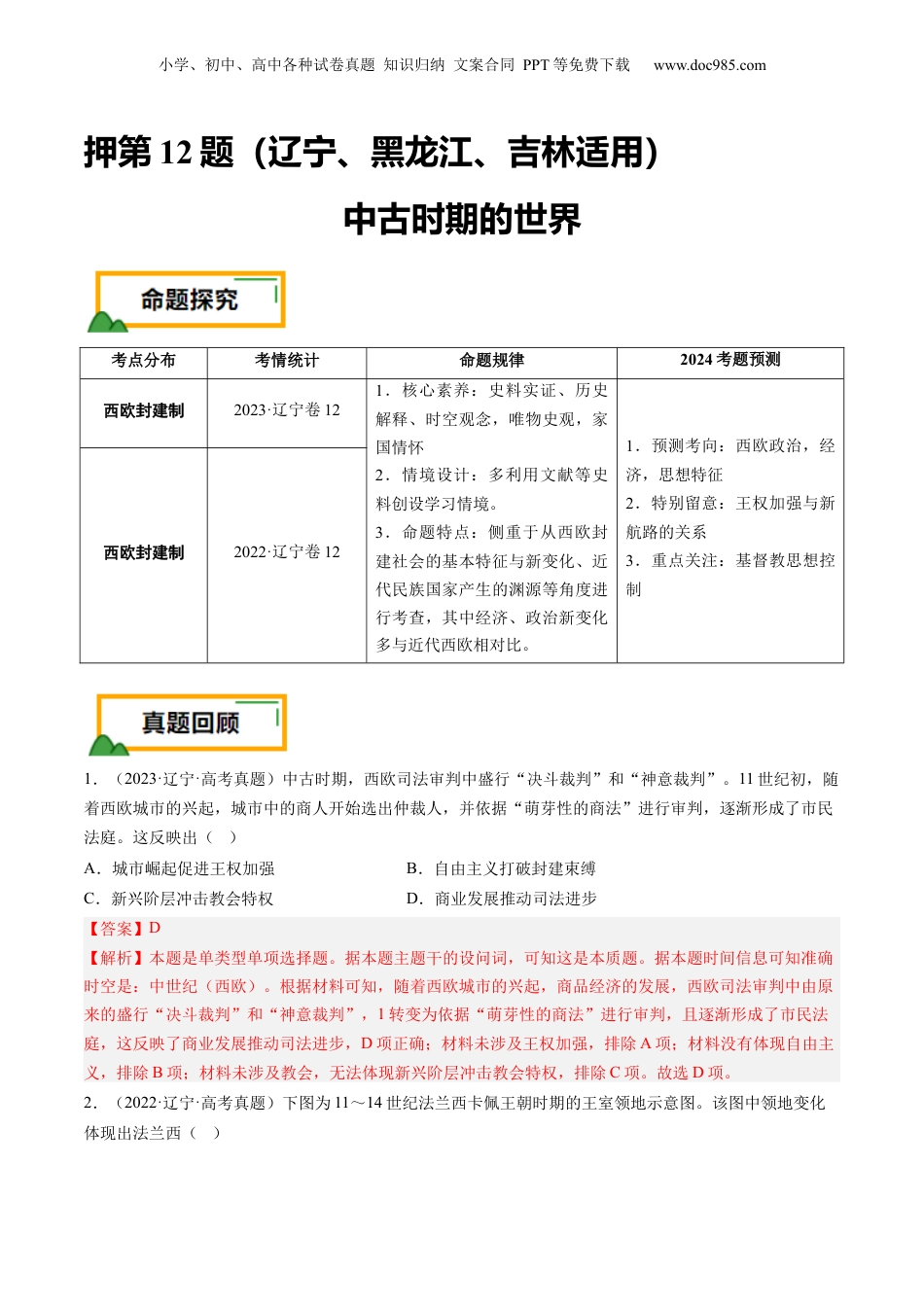 小学、初中、高中各种试卷真题知识归纳文案合同PPT等免费下载www.doc985.com押第12题(辽宁、黑龙江、吉林适用)中古时期的世界考点分布考情统计命题规律2024考题预测西欧封建制2023·辽宁卷121.核心素养:史料实证、历史解释、时空观念,唯物史观,家国情怀2.情境设计:多利用文献等史料创设学习情境。3.命题特点:侧重于从西欧封建社会的基本特征与新变化、近代民族国家产生的渊源等角度进行考查,其中经济、政治新变化多与近代西欧相对比。1.预测考向:西欧政治,经济,思想特征2.特别留意:王权加强与新航路的关系3.重点关注:基督教思想控制西欧封建制2022·辽宁卷121.(2023·辽宁·高考真题)中古时期,西欧司法审判中盛行“决斗裁判”和“神意裁判”。11世纪初,随着西欧城市的兴起,城市中的商人开始选出仲裁人,并依据“萌芽性的商法”进行审判,逐渐形成了市民法庭。这反映出()A.城市崛起促进王权加强B.自由主义打破封建束缚C.新兴阶层冲击教会特权D.商业发展推动司法进步【答案】D【解析】本题是单类型单项选择题。据本题主题干的设问词,可知这是本质题。据本题时间信息可知准确时空是:中世纪(西欧)。根据材料可知,随着西欧城市的兴起,商品经济的发展,西欧司法审判中由原来的盛行“决斗裁判”和“神意裁判”,1转变为依据“萌芽性的商法”进行审判,且逐渐形成了市民法庭,这反映了商业发展推动司法进步,D项正确;材料未涉及王权加强,排除A项;材料没有体现自由主义,排除B项;材料未涉及教会,无法体现新兴阶层冲击教会特权,排除C项。故选D项。2.(2022·辽宁·高考真题)下图为11~14世纪法兰西卡佩王朝时期的王室领地示意图。该图中领地变化体现出法兰西()小学、初中、高中各种试卷真题知识归纳文案合同PPT等免费下载www.doc985.comA.民族国家形成B.封建社会衰落C.诸侯势力扩大D.王权不断加强【答案】D【解析】通过观察图例和整幅地图,结合所学知识可知,11~14世纪,法兰西卡佩王朝的王室领地从巴黎周边发展到现在法国的大部分地区,扩大了数倍,反映出法兰西王权的不断加强,D项正确;仅有王室控制领地的增多,不能说明法兰西民族国家的形成,排除A项;封建社会衰落与国王直接控制的领地增多不符,排除B项;材料中体现的并非诸侯势力的扩大,排除C项。故选D项。小学、初中、高中各种试卷真题知识归纳文案合同PPT等免费下载www.doc985.com精准解密1史解——中古西社的多元面貌历释欧会多元的社会结构政治上,基督教会、封建领主与自治城市鼎立经济上,农奴经济、小农经济与商品经济并存文化上,基督教神学、日耳曼文化、希腊罗马文化、民族国家文化与人文精神共处封君封臣的体制封君与封臣之间建立了一种契约关系,领主不能强加给封臣某种义务,封臣要承担效忠领主等义务相对独立的庄园自给自足是西欧庄园经济的显著特征,同时在庄园中以领主为中心,形成相对独立的政治集团,领主在自己的庄园中,行使某种程度的统治权和庄园法庭的司法权追逐自由的城市城市建立在商业贸易的交结点上,封建关系脆弱。自治城市建立一种保护机构来对抗领主,维护市民生活与商业贸易,为市民文化的生长提供土壤禁欲主义与世俗文化并存宗教文化宣扬对上帝、神权的敬畏,通过禁欲控制人们的生活。贵族宣扬以忠诚为核心的骑士精神精准解密2唯物史——城市西的史意观复兴对欧历义政治城市的兴起使欧洲出现了新的社会阶层——市民阶级。城市与王权结盟,促使王权加强,市民阶级参与政治,促进了议会制度的出现经济城市兴起推动了商品经济的发展,促使旧的经济制度瓦解,孕育了资本主义的萌芽思想在西欧城市市民争取自治的过程中,自由、平等、民主、权利的意识逐步觉醒,追求自我价值、实现人性解放、谋求人生幸福等思想观念得以张扬文化随着城市的出现,产生了市民日常需要的世俗文化和世俗教育,为日后的文艺复兴和宗教改革作了准备精准解密3史解——阿拉伯家在促西方文化交流中生的影历释国进东产响角度阐释西方思想文化阿拉伯保留的古希腊罗马文化典籍译成拉丁文重回欧洲,为文艺复兴和近代小学、初中、高中各种试卷真题知识归纳文案合同PPT等免费下载...