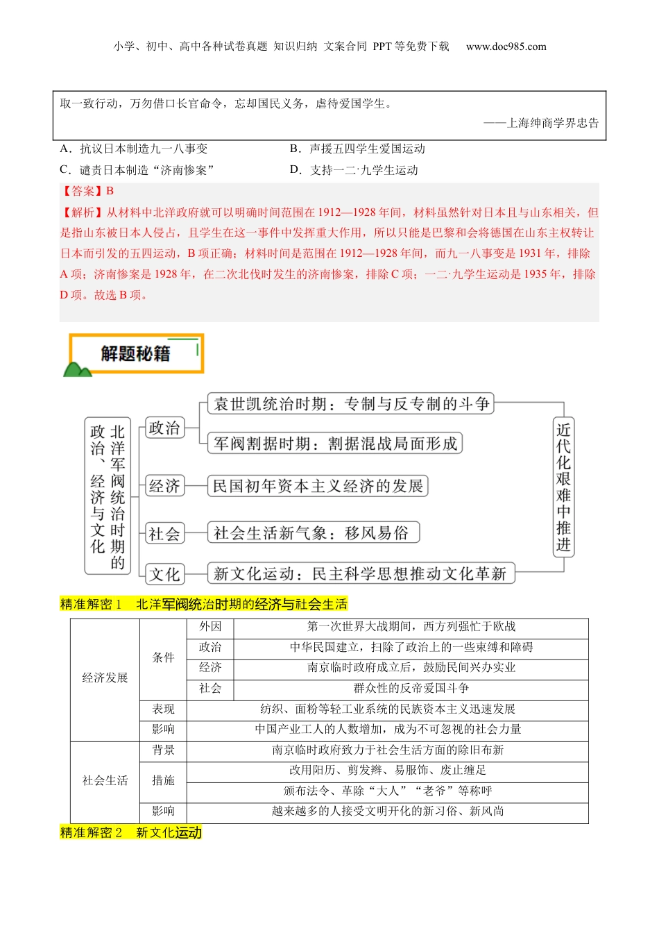 小学、初中、高中各种试卷真题知识归纳文案合同PPT等免费下载www.doc985.com押第7题(辽宁、黑龙江、吉林适用)北洋军阀时期:政治经济文化考点分布考情统计命题规律2024考题预测北洋军阀时期的经济2023·辽宁卷71.核心素养:史料实证、历史解释、时空观念,唯物史观2.情境设计:多利用民族资本主义发展的相关经济数据、文献,漫画等史料创设情境。3.命题特点:以北洋军阀统治为背景考察当时新旧思想的斗争1.预测考向:爱国情怀:五四运动2.特别留意:民族资产阶级的黄金时期表现及局限性3.重点关注:新文化的性质与影响北洋军阀时期的政治2022·辽宁卷71.(2023·辽宁·高考真题)1914年9月,北京政府颁布《商会法》,规定商会对各级地方官厅行文一律用“呈”“禀”,地方官厅对商会则用“令”“批”。该法一经颁布就遭到商界人士的强烈反对。这反映了当时()A.文言文与白话文使用的矛盾B.愚昧观念与科学思想的斗争C.改良思想与革命理念的碰撞D.专制思想与民主观念的冲突【答案】D【解析】本题是单类型单项选择题。据本题主题干的设问词,可知这是本质题。据本题时间信息可知准确时空是:1914年(中国)。根据材料“规定商会对各级地方官厅行文一律用‘呈’禀,地方官厅对商会则用‘令“批””可知,商会与地方官厅的行文方式存在等级差异,这反映了专制思想与民主观念的冲突,D项正确;材料强调的是专制思想,与白话文使用无关,排除A项;材料不涉及愚昧观念,排除B项;材料没有涉及改良思想,排除C项。故选D项。2.(2022·辽宁·高考真题)下图是存于北洋政府内务部档案中的一份传单。当时发放该传单的目的是()劝告吾最亲爱之军人警察吾最亲爱之军人警察,皆是吾中华民国的好百姓,何苦去帮助日本,反来摧残吾中华民国之爱国学生。况军、警两界大半出身山东,祖宗血地被人侵占,良心上应有何种痛苦。尚望急起挽救,与学生商民小学、初中、高中各种试卷真题知识归纳文案合同PPT等免费下载www.doc985.com取一致行动,万勿借口长官命令,忘却国民义务,虐待爱国学生。——上海绅商学界忠告A.抗议日本制造九一八事变B.声援五四学生爱国运动C.谴责日本制造“济南惨案”D.支持一二·九学生运动【答案】B【解析】从材料中北洋政府就可以明确时间范围在1912—1928年间,材料虽然针对日本且与山东相关,但是指山东被日本人侵占,且学生在这一事件中发挥重大作用,所以只能是巴黎和会将德国在山东主权转让日本而引发的五四运动,B项正确;材料时间是范围在1912—1928年间,而九一八事变是1931年,排除A项;济南惨案是1928年,在二次北伐时发生的济南惨案,排除C项;一二·九学生运动是1935年,排除D项。故选B项。精准解密1北洋治期的社生活军阀统时经济与会经济发展条件外因第一次世界大战期间,西方列强忙于欧战政治中华民国建立,扫除了政治上的一些束缚和障碍经济南京临时政府成立后,鼓励民间兴办实业社会群众性的反帝爱国斗争表现纺织、面粉等轻工业系统的民族资本主义迅速发展影响中国产业工人的人数增加,成为不可忽视的社会力量社会生活背景南京临时政府致力于社会生活方面的除旧布新措施改用阳历、剪发辫、易服饰、废止缠足颁布法令、革除“大人”“老爷”等称呼影响越来越多的人接受文明开化的新习俗、新风尚精准解密2新文化运动小学、初中、高中各种试卷真题知识归纳文案合同PPT等免费下载www.doc985.com原因人们缺乏对旧思想、旧文化、旧礼教的彻底批判,专制和愚昧束缚着国民头脑兴起标志1915年9月陈独秀创办《青年杂志》阵地北京大学和迁往北京的《新青年》杂志代表陈独秀、胡适、李大钊、鲁迅、钱玄同、刘半农等内容思想革命提倡民主科学,反对专制愚昧伦理革命提倡新道德,反对旧道德文学革命提倡新文学,反对旧文学;提倡白话文,反对文言文意义报业发展、思想解放、青年觉醒、民族曙光、社会转型精准解密3史解——近代中民族工展的特点历释国业发从产生与发展看先天不足(资本、技术、人才),后天畸形从诞生环境看产生于半殖民地半封建的社会环境中,深受外国资本主义和本国封建主义的双重压迫从地域分布看主要集中在沿海、沿江地区,内陆很少从经...