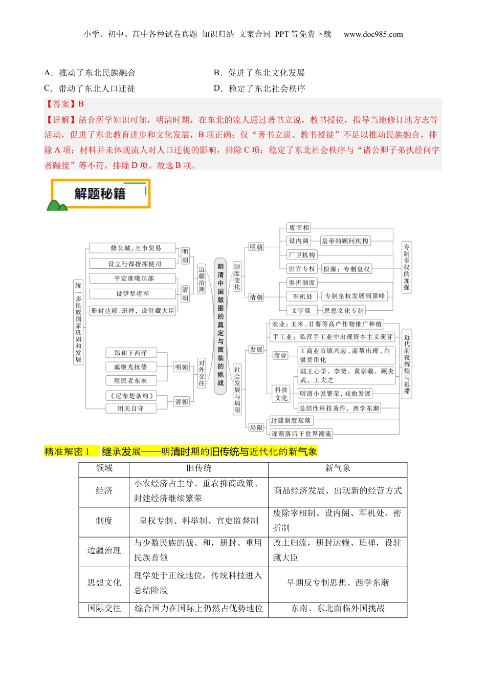 小学、初中、高中各种试卷真题知识归纳文案合同PPT等免费下载www.doc985.com押第5题(辽宁、黑龙江、吉林适用)明清时期:中国版图的奠定与危机考点分布考情统计命题规律2024考题预测明清民族关系2023·辽宁卷51.核心素养:史料实证、家国情怀、时空观念、唯物史观2.情境设计:多利用文献、图片史料创设学习情境、综合情境与学术情境,注重考查学生理解、运用材料,在唯物史观下对史事做出解释的能力,突出考查明清时期的时代特征。3.命题特点:从民族关系角度考察维护国家统一;时事振兴东北1.预测考向:以哈尔冰长春沈阳文旅为背景考查国家组织力增强2.特别留意:东北饮食风俗角度考察南北经济文化交流3.重点关注:东北话的推广查考民族融合明清文化2022·辽宁卷51.(2023·辽宁·高考真题)1749年,乾隆皇帝谕曰:“蒙古、汉人,同属臣民,如有书写之处,应称‘蒙古’‘内地’,不得以‘蒙’‘汉’字面混行填写,已屡经降旨。今马灵阿奏折,犹以‘夷’‘汉’二字分别名色,可见伊等全未留心。”此谕意在()A.加强中央集权B.维护国家一统C.调整民族关系D.规范文书体例【答案】B【详解】本题是单类型单项选择题。据本题主题干的设问词,可知这是目的题。据本题时间信息可知准确时空是:清朝(中国)。材料中乾隆皇帝的谕旨是要求在文书中不得用“蒙古”、“汉人”称呼蒙古族和汉族,而应称“蒙古”“内地”,这体现了清朝统治者对蒙古族和汉族一视同仁的民族政策,其意在维护国家一统,B项正确;材料没有涉及中央与地方的关系,排除A项;材料体现的是清朝统治者对蒙古族和汉族一视同仁的民族政策,而不是调整民族关系,排除C项;规范文书体例是对材料的误读,排除D项。故选B项。2.(2022·辽宁·高考真题)明清时期,一些谪戍东北的流人著书立说,教书授徒。如胡世宁谪戍辽东沈阳卫,“尝侨寓广宁,训诲生徒,学者宗焉”;陈梦雷曾指导修订地方志,“诸公卿子弟执经问字者踵接”。这反映出流人()小学、初中、高中各种试卷真题知识归纳文案合同PPT等免费下载www.doc985.comA.推动了东北民族融合B.促进了东北文化发展C.带动了东北人口迁徙D.稳定了东北社会秩序【答案】B【详解】结合所学知识可知,明清时期,在东北的流人通过著书立说,教书授徒,指导当地修订地方志等活动,促进了东北教育进步和文化发展,B项正确;仅“著书立说、教书授徒”不足以推动民族融合,排除A项;材料并未体现流人对人口迁徙的影响,排除C项;稳定了东北社会秩序与“诸公卿子弟执经问字者踵接”等不符,排除D项。故选B项。精准解密1承展——明期的近代化的新象继发清时旧传统与气领域旧传统新气象经济小农经济占主导、重农抑商政策、封建经济继续繁荣商品经济发展、出现新的经营方式制度皇权专制、科举制、官吏监督制废除宰相制、设内阁、军机处、密折制边疆治理与少数民族的战、和,册封、重用民族首领改土归流,册封达赖、班禅,设驻藏大臣思想文化理学处于正统地位,传统科技进入总结阶段早期反专制思想、西学东渐国际交往综合国力在国际上仍然占优势地位东南、东北面临外国挑战小学、初中、高中各种试卷真题知识归纳文案合同PPT等免费下载www.doc985.com精准解密2承古萌新——明期的思想文化的新化与清时变陆王心学背景程朱理学获得官方尊崇后,逐渐失去活力内容代表人物陆九渊(南宋)王守仁(明中期)核心主张心是万物的本原“致良知”“心外无物,心外无理”求理方法“发明本心”,内心反省知行合一评价①带有主观唯心主义倾向②强调主观能动性,激励人们奋发立志③隐含一定的平等和叛逆色彩进步思潮背景明末清初社会的剧烈动荡,促进了思想界的活跃主张①李贽提倡个性自由,蔑视权威和教条,甚至否定传统伦理道德标准②黄宗羲抨击君主专制制度,反对重农抑商观念,提出“工商皆本”③顾炎武、王夫之批判高度集权的政治制度精准解密3史解——明期社展的新象历释清时会经济发现货币经济活跃随着商品流通领域的扩大,社会上大量使用白银,商业资本日趋活跃农产品商品化农产品大量进入市场,棉花、茶叶等经济作物普遍种植工商业市镇兴起运河沿岸和江南地区,工商业市镇大量涌现长...