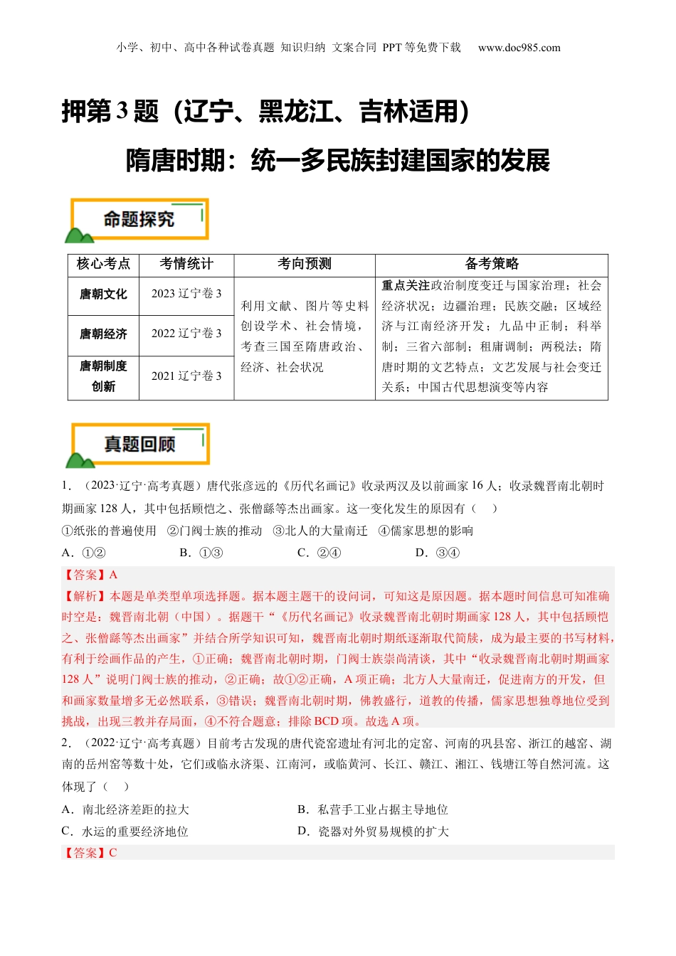 小学、初中、高中各种试卷真题知识归纳文案合同PPT等免费下载www.doc985.com押第3题(辽宁、黑龙江、吉林适用)隋唐时期:统一多民族封建国家的发展核心考点考情统计考向预测备考策略唐朝文化2023辽宁卷3利用文献、图片等史料创设学术、社会情境,考查三国至隋唐政治、经济、社会状况重点关注政治制度变迁与国家治理;社会经济状况;边疆治理;民族交融;区域经济与江南经济开发;九品中正制;科举制;三省六部制;租庸调制;两税法;隋唐时期的文艺特点;文艺发展与社会变迁关系;中国古代思想演变等内容唐朝经济2022辽宁卷3唐朝制度创新2021辽宁卷31.(2023·辽宁·高考真题)唐代张彦远的《历代名画记》收录两汉及以前画家16人;收录魏晋南北朝时期画家128人,其中包括顾恺之、张僧繇等杰出画家。这一变化发生的原因有()①纸张的普遍使用②门阀士族的推动③北人的大量南迁④儒家思想的影响A.①②B.①③C.②④D.③④【答案】A【解析】本题是单类型单项选择题。据本题主题干的设问词,可知这是原因题。据本题时间信息可知准确时空是:魏晋南北朝(中国)。据题干“《历代名画记》收录魏晋南北朝时期画家128人,其中包括顾恺之、张僧繇等杰出画家”并结合所学知识可知,魏晋南北朝时期纸逐渐取代简牍,成为最主要的书写材料,有利于绘画作品的产生,①正确;魏晋南北朝时期,门阀士族崇尚清谈,其中“收录魏晋南北朝时期画家128人”说明门阀士族的推动,②正确;故①②正确,A项正确;北方人大量南迁,促进南方的开发,但和画家数量增多无必然联系,③错误;魏晋南北朝时期,佛教盛行,道教的传播,儒家思想独尊地位受到挑战,出现三教并存局面,④不符合题意;排除BCD项。故选A项。2.(2022·辽宁·高考真题)目前考古发现的唐代瓷窑遗址有河北的定窑、河南的巩县窑、浙江的越窑、湖南的岳州窑等数十处,它们或临永济渠、江南河,或临黄河、长江、赣江、湘江、钱塘江等自然河流。这体现了()A.南北经济差距的拉大B.私营手工业占据主导地位C.水运的重要经济地位D.瓷器对外贸易规模的扩大【答案】C小学、初中、高中各种试卷真题知识归纳文案合同PPT等免费下载www.doc985.com【解析】结合所学知识可知,唐代瓷窑多建在运河或自然河流附近,体现了当时水运的发展及其在经济生活中的重要地位,C项正确;材料并未体现唐朝南北经济差距的拉大,排除A项;直到明朝时期,私营手工业才占据主导地位,排除B项;唐代瓷窑选址优先运河和自然河流附近,不能说明瓷器对外贸易规模扩大,排除D项。故选C项。3.(2021·辽宁·高考真题)唐朝要求弘文馆生、崇文馆生研习经史须用官方正音“读文精熟”;科举考试须使用官方颁布的韵书;吏部将“言辞辩正”作为铨选四项标准之一。这些规定有利于A.文化交流B.扩大选官基础C.澄清吏治D.推动方言传播【答案】A【解析】根据材料“用官方正音‘读文精熟’”、“使用官方颁布的韵书”、“将‘言辞辩正’作为铨选四项标准之一”等信息可知,这些规定有利于文化交流发展,A项正确;材料不止科举制,B项以偏概全,排除B项;材料与吏治现象无关,排除C项;材料中强调使用官方语言,不是推动方言传播,排除D项。故选A项。精准解密1唯物史观——隋唐时期制度创新的影响和认识影响政治制度三省六部制完善了封建官僚机构,提高了行政效率科举制有利于抑制门阀势力,扩大官吏来源,提高官员素质,加强中央集权,稳定政局经济制度租庸调制保证了农时,相对减轻了农民的赋税负担,有利于垦荒,保障了政府的赋税收入,巩固了府兵制两税法使税制得到统一,在一定时期内,保证了国家的财政收入;改变了以人丁为主的赋税制度,是我国赋税制度的一次重大改革小学、初中、高中各种试卷真题知识归纳文案合同PPT等免费下载www.doc985.com和进步军事制度募兵制减轻农民负担,有利于生产的发展,建立一支强有力的军队认识创新是民族进步的灵魂,是国家兴旺的动力,也是中华民族最深沉的民族禀赋;制度创新要适应本国国情,顺应生产力的发展,符合历史潮流精准解密2历史解释——隋唐文化的特点全面繁荣科技、宗教、哲学、史学、教育、文学、艺术等方面全面繁荣兼收...