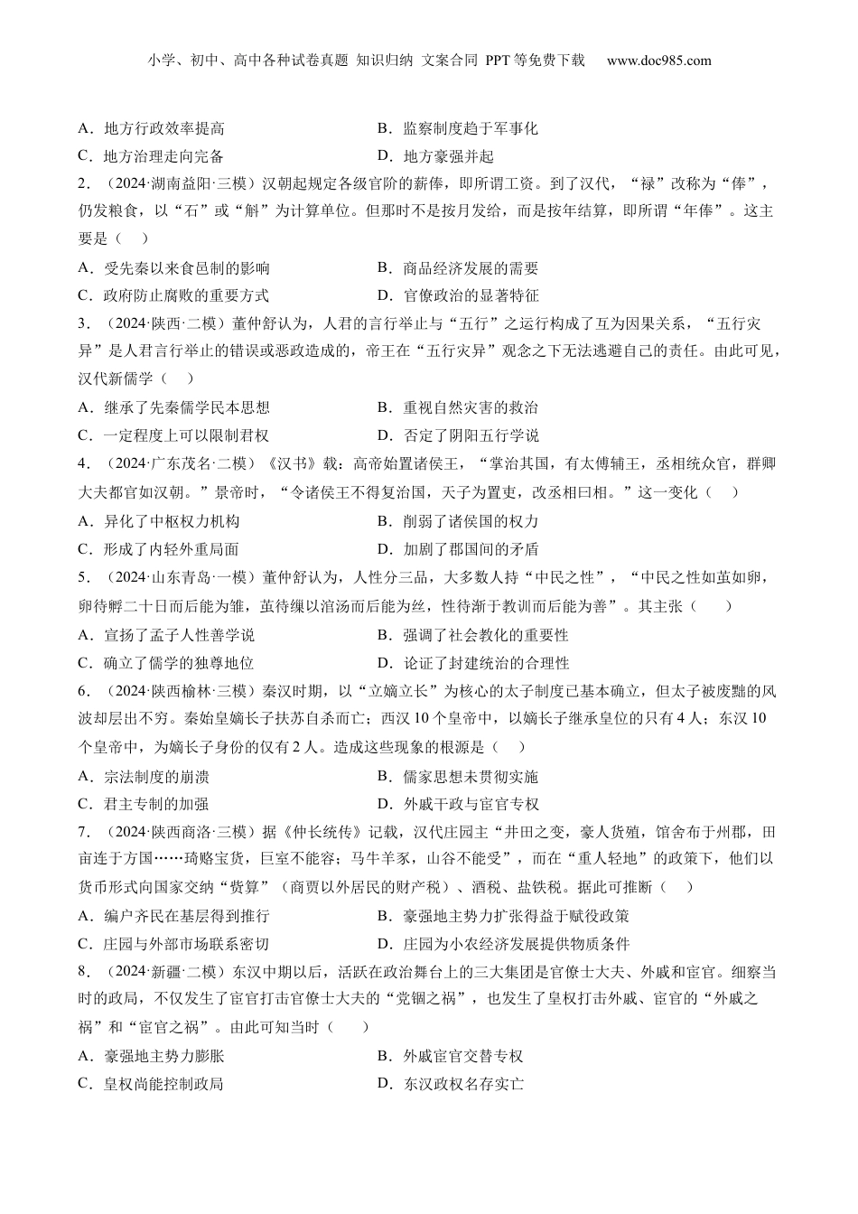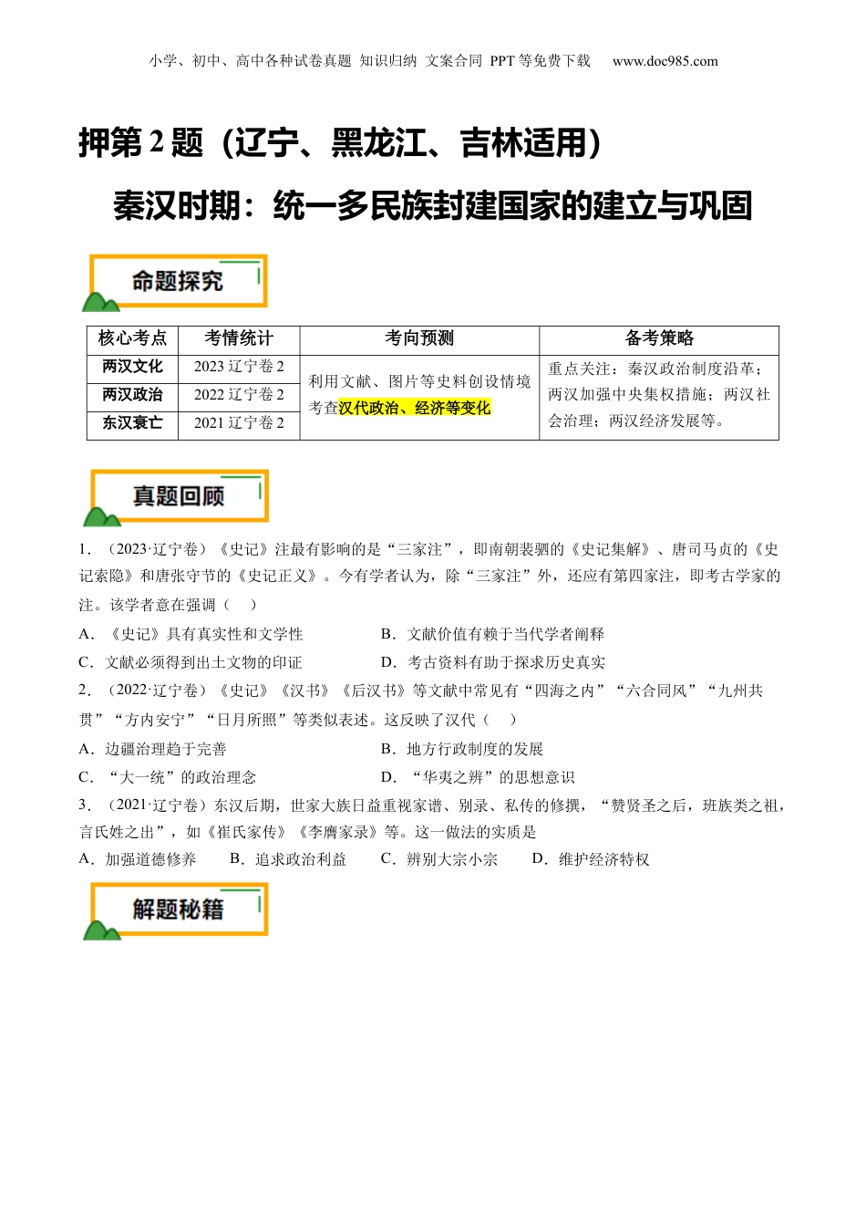 小学、初中、高中各种试卷真题知识归纳文案合同PPT等免费下载www.doc985.com押第2题(辽宁、黑龙江、吉林适用)秦汉时期:统一多民族封建国家的建立与巩固核心考点考情统计考向预测备考策略两汉文化2023辽宁卷2利用文献、图片等史料创设情境考查汉代政治、经济等变化重点关注:秦汉政治制度沿革;两汉加强中央集权措施;两汉社会治理;两汉经济发展等。两汉政治2022辽宁卷2东汉衰亡2021辽宁卷21.(2023·辽宁卷)《史记》注最有影响的是“三家注”,即南朝裴驷的《史记集解》、唐司马贞的《史记索隐》和唐张守节的《史记正义》。今有学者认为,除“三家注”外,还应有第四家注,即考古学家的注。该学者意在强调()A.《史记》具有真实性和文学性B.文献价值有赖于当代学者阐释C.文献必须得到出土文物的印证D.考古资料有助于探求历史真实2.(2022·辽宁卷)《史记》《汉书》《后汉书》等文献中常见有“四海之内”“六合同风”“九州共贯”“方内安宁”“日月所照”等类似表述。这反映了汉代()A.边疆治理趋于完善B.地方行政制度的发展C.“大一统”的政治理念D.“华夷之辨”的思想意识3.(2021·辽宁卷)东汉后期,世家大族日益重视家谱、别录、私传的修撰,“赞贤圣之后,班族类之祖,言氏姓之出”,如《崔氏家传》《李膺家录》等。这一做法的实质是A.加强道德修养B.追求政治利益C.辨别大宗小宗D.维护经济特权小学、初中、高中各种试卷真题知识归纳文案合同PPT等免费下载www.doc985.com精准解密1家国情怀——秦汉在统一多民族国家发展中的贡献“大一统”的观念认同秦朝建立后,废分封行郡县,奠定了“大一统”中央政权的政治制度基础,“大一统”的观念逐渐形成。汉武帝从政治、经济、思想等方面采取措施,使“大一统”得以巩固和发展。从此以后,“大一统”逐渐发展成中国传统文化的精神内核“中央集权”的制度认同秦汉时期是中央集权制度的创立时期。随着秦统一王朝的建立,中央集权制度应运而生,权力高度集中于中央,中央又高度集中于皇帝。与皇帝制度相适应的是一套完整的官僚机构和官僚体系,保障了中央集权制度有效实施“中华文明”的文化认同秦汉时期是一个由文化多元到逐渐走向文化思想相对统一并确立社会主导思想的时期。秦汉时期采取的一系列巩固统一的措施,不仅很快实现了“书同文、行同伦”的理想,而且汉朝尊崇儒术,儒家思想被用作统一思想、道德和文化的武器。从此,统一的文化思想、统一的道德伦理和统一的心理素质,即统一的价值体系,在中华民族中形成了精准解密2历史解释——东汉后期威胁王朝统治的主要因素1.(2024·湖南益阳·三模)光武帝刘秀“罢州牧置刺史”,刺史基本恢复了监察官职能;中平五年(188),为镇压人民反抗,汉灵帝“罢刺史置州牧”,是利用自己信任的宗室成员和亲信重臣去当州牧,对处在混乱状态的州郡加以强力控制,即“以重臣镇有乱诸州”。这一举措使()小学、初中、高中各种试卷真题知识归纳文案合同PPT等免费下载www.doc985.comA.地方行政效率提高B.监察制度趋于军事化C.地方治理走向完备D.地方豪强并起2.(2024·湖南益阳·三模)汉朝起规定各级官阶的薪俸,即所谓工资。到了汉代,“禄”改称为“俸”,仍发粮食,以“石”或“斛”为计算单位。但那时不是按月发给,而是按年结算,即所谓“年俸”。这主要是()A.受先秦以来食邑制的影响B.商品经济发展的需要C.政府防止腐败的重要方式D.官僚政治的显著特征3.(2024·陕西·二模)董仲舒认为,人君的言行举止与“五行”之运行构成了互为因果关系,“五行灾异”是人君言行举止的错误或恶政造成的,帝王在“五行灾异”观念之下无法逃避自己的责任。由此可见,汉代新儒学()A.继承了先秦儒学民本思想B.重视自然灾害的救治C.一定程度上可以限制君权D.否定了阴阳五行学说4.(2024·广东茂名·二模)《汉书》载:高帝始置诸侯王,“掌治其国,有太傅辅王,丞相统众官,群卿大夫都官如汉朝。”景帝时,“令诸侯王不得复治国,天子为置吏,改丞相曰相。”这一变化()A.异化了中枢权力机构B.削弱了诸侯国的权力C.形成了内轻外重局面D.加剧了郡国间的矛...