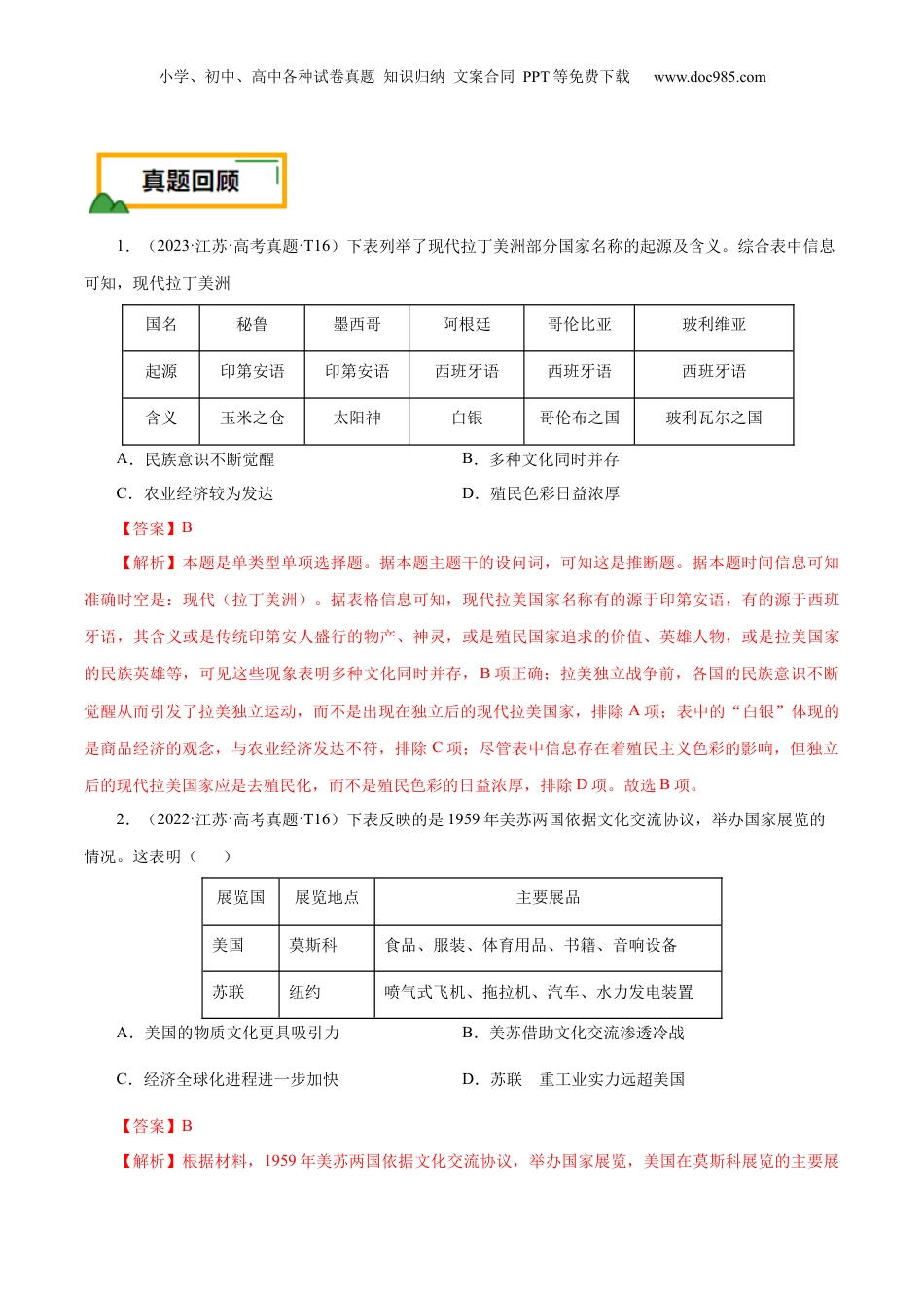 小学、初中、高中各种试卷真题知识归纳文案合同PPT等免费下载www.doc985.com押江苏卷第16题二战后的世界核心考点考情统计考向预测备考策略现代拉丁美洲国家2023·江苏卷T16(1)考查冷战背景下美国谋求世界霸权的表现和影响(2)结合美苏冷战与世界格局的变化,考查冷战背景下从两极格局向多极化趋势的演变及影响,(3)主要通过联系第二次世界大战后资本主义国家新变化的主要史实,认识资本主义国家新变化的原因、特点及作用,突出对史料实证的考查。(4)主要考查苏联改革、中国社会主义的发展。(5)从宏观和微观角度突出考查战后资本主义国家的新变化及对苏联改革的认识(6)世界殖民体系的瓦解和发展中国家取得成就与面临的问题是考查的重点(7)考点集中在世界多极化和经济全球化以及社会信息化和文化多样性(1)厘清冷战发生、发展的线索和主要阶段,了解冷战时期美苏对抗的基本史实,认识冷战的基本特征。(2)知道冷战一方面加剧世界局势的紧张,另一方面美苏避免直接冲突,防止世界性的大战爆发,是既非和平又非战争的对抗。(3)多角度地探究冷战爆发和两极格局产生的原因,认识两极格局具有不对称性和不完全性,最终必将瓦解,多极化趋势在两极格局中酝酿、发展(4)注意理解战后资本主义国家经济调整与资本主义发展之间的关系。(5)重点掌握苏联改革的原因和影响、中国社会主义发展的影响。(6)认识苏联解体、东欧剧变对世界局势的影响(7)注重世界殖民体系,新兴国家发展与世界政治、经济发展的关系;充分肯定发展中国家的发展成就,指出问题并找到解决这些问题的有效途径(8)注意将欧洲一体化进程与国际格局多极化趋势相联系,认识欧盟在国际格局中的地位(9)以全球史观掌握经济全球化的发展历程二战后的美苏关系2022·江苏卷T16世界多极化趋势2021·江苏卷T16小学、初中、高中各种试卷真题知识归纳文案合同PPT等免费下载www.doc985.com1.(2023·江苏·高考真题·T16)下表列举了现代拉丁美洲部分国家名称的起源及含义。综合表中信息可知,现代拉丁美洲国名秘鲁墨西哥阿根廷哥伦比亚玻利维亚起源印第安语印第安语西班牙语西班牙语西班牙语含义玉米之仓太阳神白银哥伦布之国玻利瓦尔之国A.民族意识不断觉醒B.多种文化同时并存C.农业经济较为发达D.殖民色彩日益浓厚【答案】B【解析】本题是单类型单项选择题。据本题主题干的设问词,可知这是推断题。据本题时间信息可知准确时空是:现代(拉丁美洲)。据表格信息可知,现代拉美国家名称有的源于印第安语,有的源于西班牙语,其含义或是传统印第安人盛行的物产、神灵,或是殖民国家追求的价值、英雄人物,或是拉美国家的民族英雄等,可见这些现象表明多种文化同时并存,B项正确;拉美独立战争前,各国的民族意识不断觉醒从而引发了拉美独立运动,而不是出现在独立后的现代拉美国家,排除A项;表中的“白银”体现的是商品经济的观念,与农业经济发达不符,排除C项;尽管表中信息存在着殖民主义色彩的影响,但独立后的现代拉美国家应是去殖民化,而不是殖民色彩的日益浓厚,排除D项。故选B项。2.(2022·江苏·高考真题·T16)下表反映的是1959年美苏两国依据文化交流协议,举办国家展览的情况。这表明()展览国展览地点主要展品美国莫斯科食品、服装、体育用品、书籍、音响设备苏联纽约喷气式飞机、拖拉机、汽车、水力发电装置A.美国的物质文化更具吸引力B.美苏借助文化交流渗透冷战C.经济全球化进程进一步加快D.苏联的重工业实力远超美国【答案】B【解析】根据材料,1959年美苏两国依据文化交流协议,举办国家展览,美国在莫斯科展览的主要展小学、初中、高中各种试卷真题知识归纳文案合同PPT等免费下载www.doc985.com品多是贴近日常生活的消费品,意图在民生方面遏制苏联,说明美国在冷战中注重运用文化交流渗透冷战,苏联在美国举办的文化交流中展览的展品主要是重工业产品,其意图是在重工业方面遏制美国,说明苏联在冷战中注重运用文化交流渗透冷战,B项正确;材料信息没有涉及影响和效果,得不出美国的物质文化更具吸引力,排除A项;材料只提到美苏两国,不能证明经济全球化进程进一步加快,排...