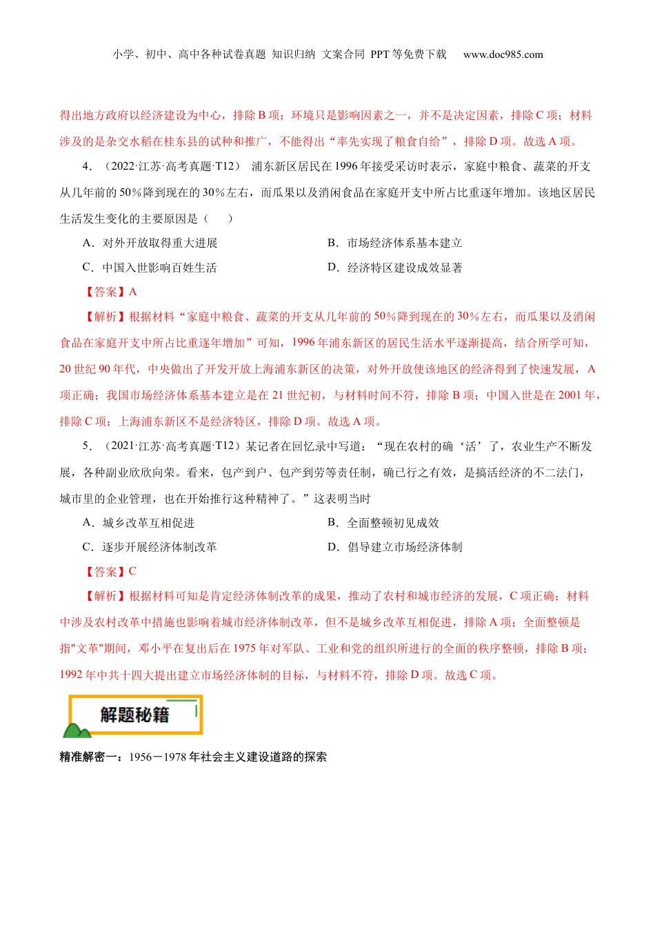 小学、初中、高中各种试卷真题知识归纳文案合同PPT等免费下载www.doc985.com押江苏卷第10题1956~至今:中国社会主义制度建立至今核心考点考情统计考向预测备考策略全面建设社会主义2023·江苏卷T10(1)伟大的建设成就是考查的重点(2)通过列举与伟大的建设成就相关的学习情境或社会情境,增强学生的民族自信与自豪感(3)改革开放的进程以及综合国力、国际影响力是考查的重点(4)以经济、社会现象、科技文化、外贸、外交为载体,考查重要阶段特征及政治、经济、科技文化发展状况(5)命题突出改革开放史考查,突显家国情怀(1)梳理历史发展线索,把握这一时期阶段特征,归纳从过渡时期到全面建设社会主义时期的政治、经济、思想文化发展状况(2)重视改革开放史基本概念的理解,基本史实的梳理与识记(3)关注与其他历史阶段以及世界其他国家、地区各领域的联系和对比,深入分析各种现象之间的联系20世纪70年代中国外交2022·江苏卷T10改革开放的成就2022·江苏卷T11浦东的对外开放2022·江苏卷T12经济体制改革2021·江苏卷T121.(2023·江苏·高考真题·T10)1956—1957年,在中国科学院出版的译著中,以社会主义国家的著作为主,但资本主义国家的著作数量增长很快。资本主义国家在华专家的人数和比重从1961年起逐渐增加,至1966年,日本和法国的专家人数居在华外国专家前两位。导致上述变化的主要因素是()小学、初中、高中各种试卷真题知识归纳文案合同PPT等免费下载www.doc985.comA.三线建设缺乏专业人才B.科技交流摆脱冷战影响C.全面建设社会主义的需要D.中国特色大国外交的开展【答案】C【解析】本题是单类型单项选择题。据本题主题干的设问词,可知这是原因题。据本题时间信息可知准确时空是:20世纪五六十年代(中国)。根据材料“至1966年,日本和法国的专家人数居在华外国专家前两位”并结合所学可知,1956年到1966年全面建设社会主义的十年,随着中苏关系走向恶化,中国缓和与西方国家关系,适应全面建设社会主义的需要,C项正确;根据材料“从1961年起逐渐增加”,结合所学可知1964年到1980年,主要涉及中国中西部13个省区进行了一场以战备为指导思想的大规模国防、科技、工业和交通基本设施建设,史称三线建设,时空不符,排除A项;结合所学可知当时科技交流不能摆脱冷战影响,排除B项;中国开展特色外交是手段而非主要因素,排除D项。故选C项。2.(2022·江苏·高考真题·T10)赵国明《中国的立场》一诗写道:“万国(联合国)旗帜欲添丁,孤岛、红旗都有名。山姆(美国)阴谋如获胜,不教公使到西京(纽约)。”该诗佐证了,中华人民共和国()A.与美国的关系趋向紧张B.在联合国行使否决权C.抵制美国构建单极世界D.反对“双重代表权”案【答案】D【解析】根据材料“万国(联合国)旗帜欲添丁,孤岛、红旗都有名。山姆(美国)阴谋如获胜,不教公使到西京(纽约)”可知,该诗反映了美国提出了“双重代表权”案,想要制造“一中一台”两个中国,中华人民共和国对此表示坚决反对,D项正确;材料主旨不是强调中美关系的发展,排除A项;该诗反映的是中国重返联合国的过程,中国此时还不能在联合国行使否决权,排除B项;当时的世界格局是两极格局,美国企图构建单极世界是在两极格局结束后,排除C项。故选D项。3.(2022·江苏·高考真题·T11)据袁隆平回忆,位于井冈山南麓的桂东县是全国率先推广种植杂交水稻的地区之一。1975年全县仅试种水稻98.88亩,次年便在全县迅速推开。当地民谣传唱:“层层梯田持山腰,银河两岸种杂交。”这反映了()A.当地提高粮食产量的迫切愿望B.地方政府以经济建设为中心C.杂交水稻试种成败取决于环境D.桂东县率先实现了粮食自给【答案】A【解析】依据材料“层层梯田持山腰,银河两岸种杂交。”,可以看出在井冈山南麓的桂东县推广种植杂交水稻,而杂交水稻作为新品种,寄托了当地人民对粮食产量的迫切愿望,A项正确;仅从材料不能小学、初中、高中各种试卷真题知识归纳文案合同PPT等免费下载www.doc985.com得出地方政府以经济建设为中心,排除B项;环境只是影响因素之一,并不是决定因素,排除C项;材料涉及的是杂...