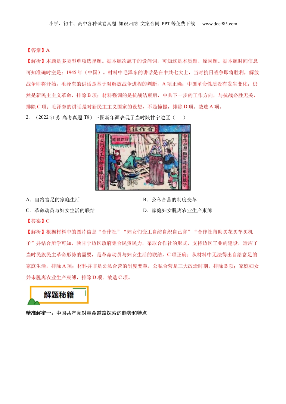 小学、初中、高中各种试卷真题知识归纳文案合同PPT等免费下载www.doc985.com押江苏卷第8题1927~1949:国共十年对峙至新中国成立前核心考点考情统计考向预测备考策略中共七大前后的形势2023·江苏卷T8(1)近代民族工业发展历程、工农武装割据道路是考查的重点(2)敌后战场的开辟、敌后根据地的建设以及抗日战争的历史意义、中共七大是考查的重点(3)解放区根据地建设以及新民主主义革命的胜利是考查的重点(3)注重呈现这一时期中国共产党波澜壮阔的奋斗历程和伟大成就,弘扬党的光荣传统和优良作风,考查党的实践创造和历史经验,培育学生家国情怀(1)注重阶段特征,梳理这一时期的基本线索(2)加强图表类题目训练,注重横向与纵向的比较,深入思考历史事件之间的关系(3)梳理历史发展线索,把握抗日战争的阶段特征(4)加强党史教育与训练,切实提升学生家国情怀素养,打造知史爱党教育阵地(5)把握解放战争基本史实的阶段特征陕甘宁边区的发展2022·江苏卷T81.(2023·江苏·高考真题·T8)在中共七大上,毛泽东强调“由减租减息转变到耕者有其田”,要派干部到城市去,“掌握大的铁路、工厂、银行”。他主张新的中央委员应该包罗各种人才,“将来还要搞大工业”。他提出要夺取北平、天津等中心城市,并表示“我们一定要在那里开八大”。毛泽东的主张()A.基于对解放战争进程的判断B.说明中国革命性质发生变化C.重在强调抗战必胜的坚定信念D.憧憬着新民主主义国家的未来小学、初中、高中各种试卷真题知识归纳文案合同PPT等免费下载www.doc985.com【答案】A【解析】本题是多类型单项选择题。据本题次题干的设问词,可知这是本质题、原因题。据本题时间信息可知准确时空是:1945年(中国)。材料中毛泽东的讲话是在中共七大上,当时抗日战争即将胜利,解放战争即将开始,毛泽东的讲话是基于对解放战争进程的判断,A项正确;中国革命性质没有发生变化,仍然是新民主主义革命,排除B项;材料强调的是抗战结束后,中共下一步的工作方向,与抗战必胜无关,排除C项;毛泽东的讲话是对新民主主义国家的设想,不是憧憬,排除D项。故选A项。2.(2022·江苏·高考真题·T8)下图新年画表现了当时陕甘宁边区()A.自给富足的家庭生活B.公私合营的制度变革C.革命动员与妇女生活的联结D.家庭妇女脱离农业生产束缚【答案】C【解析】根据材料中的图片信息“合作社”“妇女们变工自纺自织自己穿”“合作社帮助买花买车买机子”并结合所学可知,陕甘宁边区政府集合民资民力,采取合作社的形式,支持边区工业的建设,适应了当时民族民主革命形势的需要,是革命动员与妇女生活的联结,C项正确;从材料中无法得出自给富足的家庭生活,排除A项;材料并非是公私合营的制度变革,公私合营是三大改造时期,排除B项;家庭妇女并未脱离农业生产束缚,排除D项。故选C项。精准解密一:中国共产党对革命道路探索的趋势和特点小学、初中、高中各种试卷真题知识归纳文案合同PPT等免费下载www.doc985.com精准解密二:中国共产党在抗战时期的历史贡献政治上倡导建立了抗日民族统一战线,实现了全民族抗战,打击了国民党的分裂投降活动,维护了统一战线;领导沦陷区人民开展各种反抗斗争军事上取得抗战以来主动歼敌的第一场胜仗——平型关大捷,坚定了全国人民的抗战决心;创建了敌后抗日根据地,开辟了敌后战场,在抗战初期有力地配合了正面战场;在相持阶段成为抗战的主战场,发动百团大战,对争取抗战形势好转起了积极作用;及时开展局部反攻,为最后打败日本侵略者作出了重大贡献思想上制定了全面抗战路线,即人民战争路线;提出持久战的思想,指出了抗战胜利的正确道路;召开中共七大,为抗战胜利作了充分准备精准解密三:中国取得抗日战争胜利的四大原因小学、初中、高中各种试卷真题知识归纳文案合同PPT等免费下载www.doc985.com精准解密四:中国在抗日战争过程中积累的新的现代化因素政治民主化层面抗日战争为中国民主制度的发展,在客观上提供了条件。(1)在民族生存受到日本侵略者严重威胁的时候,中国共产党和其他政治派别先后发出了开放民主的声音,尽管南京国民政府开放的民主十分有...