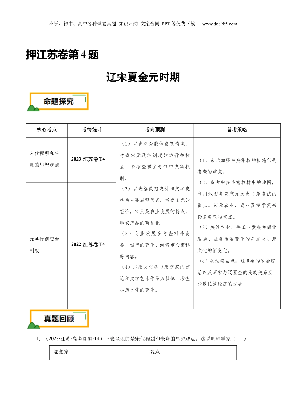 小学、初中、高中各种试卷真题知识归纳文案合同PPT等免费下载www.doc985.com押江苏卷第4题辽宋夏金元时期核心考点考情统计考向预测备考策略宋代程颐和朱熹的思想观点2023·江苏卷T4(1)以史料为载体设置情境,考查宋元政治制度的运行和特点,多考查君主专制中央集权制。(2)以表格数据史料和文字史料为主要表现形式,考查宋元的经济,特别是农业发展的特点,和农产品的商品化(3)商业发展多考查对外贸易、城市的变化、经济重心南移等内容。(4)思想文化多以思想家的言论和文学艺术作品为载体,考查思想文化的变化。(1)宋元加强中央集权的措施仍是考查的重点。(2)备考中多注意教材中的地图,利用地图考查宋元历史将是考试的重点。宋元农业、商业及儒学复兴仍是考查的重点。(3)关注农业、手工业发展和商业发展、社会生活变化的关系及思想文化的新变化。(4)关注空白点:辽夏金的政治统治以及两宋与辽夏金的民族关系及少数民族经济的发展元朝行御史台制度2022·江苏卷T41.(2023·江苏·高考真题·T4)下表呈现的是宋代程颐和朱熹的思想观点。这说明理学家()思想家观点小学、初中、高中各种试卷真题知识归纳文案合同PPT等免费下载www.doc985.com程颐读史须见圣贤所存治乱之机,贤人君子出处进退,便是格物朱熹若未读彻语、孟、中庸、大学便去看史,胸中无一个权衡,多为所惑A.主经学史时须重视道德教化B.研究历史注重史料搜集整理C.通过探究万物获取历史真相D.借助历史事实领悟心学理念【答案】A【解析】本题是单类型单项选择题。据本题主题干的设问词,可知这是本质题。据本题时间信息可知准确时空是:宋朝(中国)。据材料可知,程颐认为读史书需要看见圣贤所留下的治乱的关键,贤人君子出仕或隐退的时机,就是格物;朱熹认为读书要按一定的次序,不要颠倒,读史之前要先将四书读透彻。综上可看出,两人都主张主经学史时须重视道德教化,A项正确;材料中没有提及史料搜集的信息,排除B项;材料中描述的是读历史要用儒家思想去权衡,没有体现探究万物获得历史真相,排除C项;心学理念是王阳明的思想,排除D项。故选A项。2.(2022·江苏·高考真题·T4)元朝创建行御史台“主察行省”。至元二十年,江淮行省“有欲专肆而忌廉察官者”,建议行御史台隶属行省。经重臣董文用据理力争,该图谋未能得逞。至元二十八年,行御史台不受行省节制在法令上被确认。这说明元代()A.行省长官的特权受到否定B.地方权力的监督机制得到改善C.地方的吏治问题得以解决D.行省事务最终由朝廷大臣决定【答案】B【解析】根据材料“元朝创建行御史台‘主察行省’......至元二十八年,行御史台不受行省节制在法令上被确认”可知,元朝建行御史台监察行省,江淮行省“欲专肆”建议行御史台隶属行省,未能得逞,之后行御史台不受行省节制在法令上被确认,说明行御史台能够更好的监察地方,地方权力的监督机制得到改善,B项正确;行省长官的特权受到否定,在材料中没有体现,排除A项;通过材料信息无法判断地方吏治问题解决程度,排除C项;行省事务最终由朝廷大臣决定,不符合史实,排除D项。故选B项。精准解密一:唐宋时期的政治变革士族政治衰落,君主专制加强隋唐实行并完善科举制,通过考试选拔官吏,从制度上打破了门阀士族贵族垄断政权的局面;隋唐实行三省六部制分散相权、提升皇权;北宋实行小学、初中、高中各种试卷真题知识归纳文案合同PPT等免费下载www.doc985.com重文政策,大兴科举,士族政治进一步衰落;中央实行分权政策,相权一分为三,相互牵制,加强皇权中枢权力体系:由三省制到一省制三省制标志着宰相权力被三省分掌,秦汉以来的独相被群相代替,形成三省的长官共议国政的新型治国方式。宋承唐制,但门下省和尚书省虚设,中书省的职能限于政务,军权与财权被枢密院和三司分割文官制度的完善中唐以后,士人广泛参与国家政治,宋太祖推行崇文抑武的政策,形成以科举出身的士大夫为主体的文官政府。隋唐统治阶层大多出自门阀士族,而宋代的文人政治特点明显。宋代文官制度的完善扭转了唐末五代藩镇割据的局面,也促进了宋代经济、教育、文化的繁荣发展精准解密二...