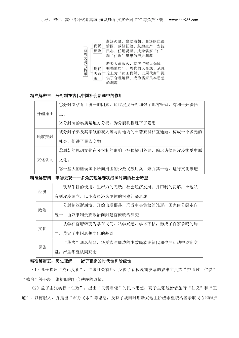 小学、初中、高中各种试卷真题知识归纳文案合同PPT等免费下载www.doc985.com押江苏卷1题先秦时期核心考点考情统计考向预测备考策略王室衰微和春秋五霸2023·江苏卷1(1)中华文明起源的特征和早期国家是考查重点。(2)以青铜器为载体考查视角的多元性。(3)春秋战国时期的诸子思想是命题考查的重点,利用诸子百家的思想言论创设情境,考查各家思想的主张、特点及对当时社会的意义。(4)经济方面,考查春秋战国时期经济发展的表现,体现转型时期的时代特点。(5)春秋战国时期政治变革,侧重考查分封宗法制的崩溃。(1)中华文明起源依然是关注的重点。(2)注意考古材料与传世文献在认识上古历史中的价值,培养史料实证素养。(3)理解春秋战国时期的社会转型,重点关注通过创设新情境、提出新问题的形式考查春秋战国时期政治、经济、文化的重大变化及对历史发展的影响。(5)需关注高考空白点,如早期国家政治制度与秦汉政治制度的关系春秋战国时期的华夏认同与民族交融。井田制瓦解、土地私有制逐渐形成2022·江苏卷1重农抑商政策2021·江苏卷11.(2023·江苏·高考真题·T1)春秋时期,晋国在兼并虞国等同姓方国时,也与无终戎等北方诸戎和好,以免于在同楚国争霸过程中腹背受敌。这一现象表明当时()A.北方诸戎已融入华夏族B.政治权力下移至卿大夫小学、初中、高中各种试卷真题知识归纳文案合同PPT等免费下载www.doc985.comC.楚国吴起变法成效显著D.宗法政治体制遭到破坏2.(2022·江苏·高考真题·T1)据学者考证,春秋末年,陈国司徒辕颇向封疆内所有的田地征取赋纳。辕颇遭到拥有一定数量田地的国人驱逐,逃亡到郑国。这一考证可以说明()A.官僚政治的腐朽B.贵族与农民阶级矛盾尖锐C.土地制度的变动D.诸侯权威遭到卿大夫挑战3.(2021·江苏·高考真题T1)有学者认为,《睡虎地秦简·为吏之道》是供学习为吏者使用的识字课本。其末尾附录的两条魏律(颁布于公元前252年)规定:商贾和经营客店者“勿令为户”,不分给他们田地、房屋;派其从军,杀牛犒赏全军时,不给他们肉吃。由此可见A.魏律成为秦吏准绳B.强制耕战成效显著C.秦国实行以吏为师D.抑商思想影响渐广精准解密一:史学理论——文明起源和早期国家的学术研究方法文明起源与早期国家是近年学术界比较关注的问题,其史学研究方法成为高考关注的高频考点。(1)考古学用第一手史料揭示了我国上古历史发展脉络。①旧石器时代的考古成就揭示了中国境内远古人类的起源,反映出旧石器时代晚期中国境内已经形成若干文化区。②新石器时代的考古成就反映出新石器时代晚期逐渐形成了以中原为核心,以黄河流域、长江流域为主干,周围环绕多个文化圈的“重瓣花朵”式结构,创造了多元一体、中原核心的文化模式。(2)用“二重证据法”研究早期国家特征①考古材料和传世文献相结合,是了解上古历史的基本途径。在研究中国早期国家特征时,要求使用甲骨文、青铜铭文及其他文献记载等不同材料,知道考古材料与传世文献在历史研究中的不同作用。②反映上古历史的传世文献,大都出于后人追述和概括,史料价值打了折扣;考古材料通常是零碎和散乱的,只有结合传世文献,才能对其进行更加深入和全面的解读。精准解密二:文明传承——商周文明对后世儒家思想的影响小学、初中、高中各种试卷真题知识归纳文案合同PPT等免费下载www.doc985.com精准解密三:分封制在古代中国社会治理中的作用开疆拓土①分封制孕育了统一的因素,通过层层分封加强了地方管理,有利于开疆拓土。②分封制的实质是地方分权,为分裂割据埋下了隐患民族交融被分封子弟及其率领的族人等与封地内的土著族群相互通婚,构成一个多元的社会,促进了民族交融文化认同①周朝的思想文化在分封制的影响下被传播到各地,偏远诸侯国逐步接受中原文化。②一些大的诸侯国不断向周围的少数民族用兵,兼并其土地,进行文化渗透精准解密四:唯物史观——多角度理解春秋战国时期的社会转型经济铁犁牛耕的使用,生产力的飞跃,社会经济发展;井田制的瓦解,土地私有制逐步确立,以小农经济为主体的封建经济形成政治分封制逐渐崩溃,开始出现郡县,形成中央集权的...
