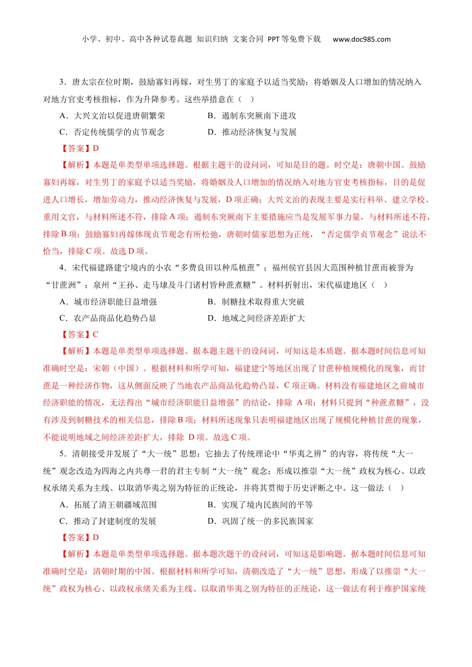 小学、初中、高中各种试卷真题知识归纳文案合同PPT等免费下载www.doc985.com高考押题卷01(江苏卷)历史(考试时间:75分钟试卷满分:100分)注意事项:1.答卷前,考生务必将自己的姓名、考生号等填写在答题卡和试卷指定位置。2.回答选择题时,选出每小题答案后,用铅笔把答题卡上对应题目的答案标号涂黑。如需改动,用橡皮擦干净后,再选涂其他答案标号。回答非选择题时,将答案写在答题卡上。写在本试卷上无效。3.考试结束后,将本试卷和答题卡一并交回。一、单项选择题(本大题共16题,每题3分,共48分)1.墨子主张“非攻”,他不仅止楚攻宋,还用许多行动贯彻了这一主张。齐将伐鲁,墨子见齐将项子牛及齐王,说而罢之。还有,楚欲攻郑,墨子劝说鲁阳文君而作罢。由此可知,墨家学派()A.开始践行知行合一B.富有实践精神C.重视科学理论运用D.蕴含仁爱思想【答案】B【解析】本题是单类型单项选择题。据本题主题干的设问词,可知这是推断题。据本题时间信息可知准确时空是:春秋战国时期(中国)。材料核心信息是墨子的“非攻”主张在战国时期至少制止了三次战争,体现了墨家学派注重实践的精神,B项正确;A项错在战国时期的墨子不会践行明朝王阳明的知行合一思想,排除A项;C项错在“非攻”思想不是科学理论,排除C项;墨家主张兼爱,并非仁爱,排除D项。故选B项。2.作为独立的社会阶层,士人经历了西汉时由游士到儒士,东汉时由儒士向士大夫的转变,从体制外走入体制内。吕思勉对此评价说“自西汉以前,言治者对社会政治竭力攻击:东汉以后,此等议论渐不复闻。”这反映了()A.士人参政意识持续提升B.社会治理机制日渐完善C.以文教治天下成为共识D.儒家政治伦理趋向强化【答案】D【解析】本题是单类型单选题,据题干设问词可知是本质题,据材料时间信息得出准确时空是中国古代。根据材料,西汉以前儒家思想家对政治还进行讨论,但是东汉以后,对政治的讨论不存在,可知儒家政治伦理不断强化,D项正确;材料体现的是参政意识受到压制,排除A项;社会治理机制面太大,排除B项;C项错在“共识”,排除C项。故选D项。小学、初中、高中各种试卷真题知识归纳文案合同PPT等免费下载www.doc985.com3.唐太宗在位时期,鼓励寡妇再嫁,对生男丁的家庭予以适当奖励;将婚姻及人口增加的情况纳入对地方官吏考核指标,作为升降参考。这些举措意在()A.大兴文治以促进唐朝繁荣B.遏制东突厥南下进攻C.否定传统儒学的贞节观念D.推动经济恢复与发展【答案】D【解析】本题是单类型单项选择题。根据主题干的设问词,可知是目的题。时空是:唐朝中国。鼓励寡妇再嫁,对生男丁的家庭予以适当奖励,将婚姻及人口增加的情况纳入对地方官吏考核指标,目的是促进人口增长,增加劳动力,推动经济恢复与发展,D项正确;大兴文治的表现主要是实行科举、建立学校、重用文官,与材料所述不符,排除A项;遏制东突厥南下主要措施应当是发展军事力量,与材料所述不符,排除B项;鼓励寡妇再嫁体现贞节观念有所松弛,唐朝时儒家思想为正统,“否定儒学贞节观念”说法不恰当,排除C项。故选D项。4.宋代福建路建宁境内的小农“多费良田以种瓜植蔗”;福州侯官县因大范围种植甘蔗而被誉为“甘蔗洲”;泉州“王孙、走马埭及斗门诸村皆种蔗煮糖”。材料折射出,宋代福建地区()A.城市经济职能日益增强B.制糖技术取得重大突破C.农产品商品化趋势凸显D.地域之间经济差距扩大【答案】C【解析】本题是单类型单项选择题。据本题主题干的设问词,可知这是本质题。据本题时间信息可知准确时空是:宋朝(中国)。根据材料和所学可知,福建建宁等地区出现了甘蔗种植规模化的现象,而甘蔗是一种经济作物,这从侧面反映了当地农产品商品化趋势凸显,C项正确。材料没有福建地区之前城市经济职能的情况,无法得出“城市经济职能日益增强”的结论,排除A项;材料只提到“种蔗煮糖”,没有涉及到制糖技术的相关信息,排除B项;材料所述现象只表明福建地区出现了规模化种植甘蔗的现象,不能说明地域之间经济差距扩大,排除D项。故选C项。5.清朝接受并发展了“大一统”思想:它抽去了传统理论中“华夷之辨...