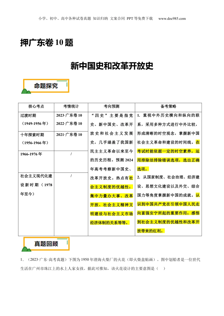 小学、初中、高中各种试卷真题知识归纳文案合同PPT等免费下载www.doc985.com押广东卷10题新中国史和改革开放史核心考点考情统计考向预测备考策略过渡时期(1949-1956年)2023·广东卷102022·广东卷10“四史”主要是指党史、新中国史、改革开放史和社会主义发展史,几乎涵盖了我国新民主主义革命以来至今的历史历程。预测2024年高考考察新中国史、改革开放史。热点有社会主义制度的优越性:集中力量办大事、改革开放、社会主义精神文明建设与社会主义市场经济体制的关系等等。1.重视中外历史横向和纵向的联系,采用多种方式进行中外比较,形成清晰的时空观念,掌握新中国社会主义革命和建设的时间线。在考试时能依据一定的时空素养,运用排除法排除错误选项,选出正确选项。2.从国家制度、社会治理、经济建设、思想文化建设以及外交、综合国力等角度掌握新中国的成就。认识到中国共产党在引领中国人民走向富强安宁所起的重要作用;感悟到社会主义制度的优越性和改革开放带来的红利。十年探索时期(1956-1966年)2021·广东卷101966-1976年/社会主义现代化建设新时期(1978年至今)/1.(2023·广东·高考真题)下图为1950年澄海火柴厂的火花(即火柴盒贴画)。图中划船者是一位世代生活在广州市珠江上的水上人家女孩。据此可推知,该火花设计的主要意图是()小学、初中、高中各种试卷真题知识归纳文案合同PPT等免费下载www.doc985.comA.描绘贫苦大众解放后的新生活B.记述工业化建设带来的新变化C.展现三大改造的新成果D.彰显男女平等的新气象2.(2022·广东·高考真题)1954年7月,中共中央政治局举行会议,周恩来汇报参加日内瓦会议和出访印度、缅甸情况时,毛泽东指出:“门要关死已经不可能了,而且很有一种有利的局势,需要我们走出去。缓和国际紧张局势,不同制度的国家可以和平相处。”这说明()A.国内建设需要调整“一边倒”政策B.支持民族解放运动提升中国影响力C.“求同存异”促进亚非各国了解中国D.不结盟运动兴起改变了世界政治格局3.(2021·广东·高考真题)1957年创办于广州的中国出口商品交易会(简称广交会),在新中国外贸史上占有重要的地位。周恩来指出:“一年两次的广交会是在我们被封锁的情况下不得已搞的我们只好请人家进来看。”由此可知,广交会的创办()A.扩展了与外部世界的交流渠道B.强化了与苏联的经贸联系C.突破了计划经济对外贸的束缚D.加速了不结盟运动的进程1.时间线新中国以来的政体或改革1949年4月--1950年3月“米棉之战”1949年6月银元之战1949年9月第一届中国人民政治协商会议及《中国政治协商会议共同纲领》1949年10月1日新中国成立(新民主义革命的胜利)1950年--1952年土地改革1953年--1956年三大改造小学、初中、高中各种试卷真题知识归纳文案合同PPT等免费下载www.doc985.com1953年--1957年一五计划1954年9月第一次全国人民代表大会及《中华人民共和国宪法》1956年中共八大1958年-1960年大跃进(人民公社化)1961年1月--1965年国民经济调整(八字方针)1966年--1976年10月十年文革1978年12月十一届三中全会(改革开放)1980年5月在深、珠、汕、厦设立经济特区1981年中共十一届六中全会在北京举行,会议通过了《关于建国以来党的若干历史问题的决议》1982年第五届全国人大五次会议1982年“一国两制”构想1984年开放14个沿海港口城市1987年中共十三大(社初级阶段基本路线)1992年南方谈话1992年中共十四大社会主义市场经济体制建设1997年中共十五大(邓小平指导思想)1997年7月1日香港回归1998年12月20日澳门回归2002年中共十六大(三个代表、全面建设小康)2007年中共十七大(中特社会理论体系)2008年海峡两岸实现三通2012年中共十八大(科学发展观)2017年中共十九大(习近平指导思想)2021年建党一百周年伟大的科技成就1959年9月发现大庆油田1963大庆油田基本全面开发并使用1964年6月中远程弹道导弹成功发射1964年10月16日原子弹成功爆炸1967年6月17日清淡成功爆炸小学、初中、高中各种试卷真题知识归纳文案合同PPT等免费下载www.doc985.com1970年人造卫星东方红一号成功发射新中国外交1949年独立自主的外交政策(...