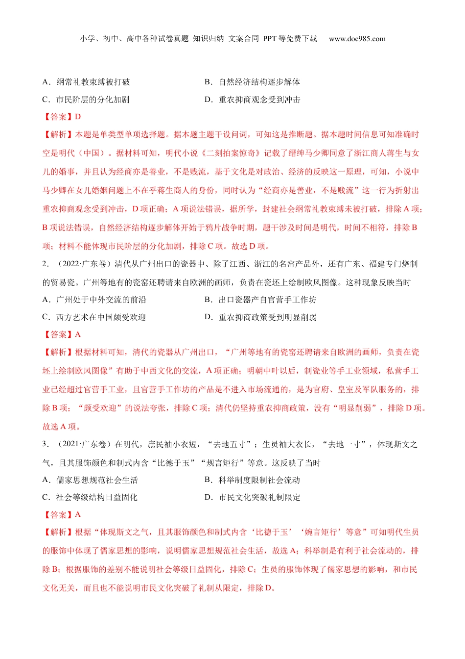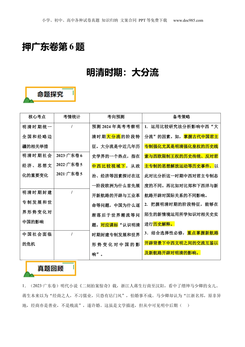 小学、初中、高中各种试卷真题知识归纳文案合同PPT等免费下载www.doc985.com押广东卷第6题明清时期:大分流核心考点考情统计考向预测备考策略明清时期统一全国和经略边疆的相关举措/预测2024年高考考察明清时期大分流的阶段特征。大分流是中近几年历史学界的一个热点,指在中西比较视域下,从政治、经济等因素探讨在这一阶段欧洲为什么首先展开新航路的开辟与工业革命等问题,中国为什么逐渐落后于世界潮流等问题。对应课标“认识明清时期封建专制发展和世界形势变化对中国的影响”。1.运用比较研究法分析影响中西“大分流”的因素。如,掌握古代中国君主专制强化尤其是明清强化皇权的历史线索与西欧限制王权的历史传统、反对君主专制的思想解放运动等历史事件,以此对比分析这一时期中西对君主专制态度的不同。再比如对比郑和下西洋与新航路开辟对国际关系的不同影响。2.把握明清时期的阶段特征,能够在陌生的新情境运用所学知识对相关史实进行历史解释。3.结合选择性必修,重点掌握新航路开辟背景下中西文明之间的交流互鉴以及新航路开辟对明清的影响。明清时期社会经济、思想文化的重要变化2023·广东卷62022·广东卷52021·广东卷5明清时期封建专制发展和世界形势变化对中国的影响/中国社会面临的危机/1.(2023·广东卷)明代小说《二刻拍案惊奇》载,浙江人蒋生行商至汉阳,看中了缙绅马少卿的女儿。蒋生本来以为“经商之人,不习儒业,只恐有玷门风”,怕婚事不成。马少卿却认为“江浙名邦,原非异地,经商亦是善业,不是贱流”,遂许婚。这虽是文学描述,但从中可见明中后期()小学、初中、高中各种试卷真题知识归纳文案合同PPT等免费下载www.doc985.comA.纲常礼教束缚被打破B.自然经济结构逐步解体C.市民阶层的分化加剧D.重农抑商观念受到冲击【答案】D【解析】本题是单类型单项选择题。据本题主题干设问词,可知这是推断题。据本题时间信息可知准确时空是明代(中国)。据材料可知,明代小说《二刻拍案惊奇》记载了缙绅马少卿同意了浙江商人蒋生与女儿的婚事,并且认为经商亦是善业,不是贱流,基于文化是对政治、经济的反映这一原理,可知,小说中马少卿在女儿婚姻问题上不在乎蒋生商人的身份,同时认为“经商亦是善业,不是贱流”这一行为折射出重农抑商观念受到冲击,D项正确;A项说法错误,据所学,封建社会纲常礼教束缚未被打破,排除A项;B项说法错误,自然经济结构逐步解体开始于鸦片战争时期,题干涉及时间是明代,时间不相符,排除B项;材料不能体现市民阶层的分化加剧,排除C项。故选D项。2.(2022·广东卷)清代从广州出口的瓷器中、除了江西、浙江的名窑产品外,还有广东、福建专门烧制的贸易瓷。广州等地有的瓷窑还聘请来自欧洲的画师,负责在瓷坯上绘制欧风图像。这种现象反映当时A.广州处于中外交流的前沿B.出口瓷器产自官营手工作坊C.西方艺术在中国颇受欢迎D.重农抑商政策受到明显削弱【答案】A【解析】根据材料可知,清代的瓷器从广州出口,“广州等地有的瓷窑还聘请来自欧洲的画师,负责在瓷坯上绘制欧风图像”有助于中西文化的交流,A项正确;明朝中叶以后,制瓷业等手工业领域,私营手工业已经超过官营手工业,且官营手工作坊的产品是不进入市场流通的,是为官府、皇室及军队服务的,排除B项;“颇受欢迎”的说法夸张,排除C项;清代仍坚持重农抑商政策,没有“明显削弱”,排除D项。故选A项。3.(2021·广东卷)在明代,庶民袖小衣短,“去地五寸”;生员袖大衣长,“去地一寸”,体现斯文之气,且其服饰颜色和制式内含“比德于玉”“规言矩行”等意。这反映了当时A.儒家思想规范社会生活B.科举制度限制社会流动C.社会等级结构日益固化D.市民文化突破礼制限定【答案】A【解析】根据“体现斯文之气,且其服饰颜色和制式内含‘比德于玉’‘婉言矩行’等意”可知明代生员的服饰中体现了儒家思想的影响,说明儒家思想规范社会生活,故选A;科举制是有利于社会流动的,排除B;根据服饰的差别不能说明社会等级日益固化,排除C;生员的服饰体现了儒家思想的影响,和市民文化无关,而且也不能说明市民文化突破了礼制从限定,排除D。小学、...