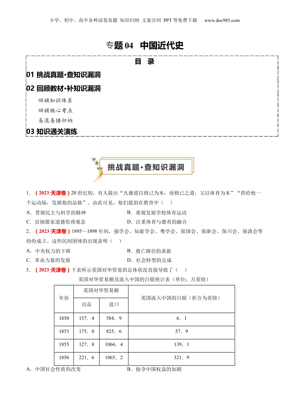 小学、初中、高中各种试卷真题知识归纳文案合同PPT等免费下载www.doc985.com题专04中国近代史目录01挑战真题·查知识漏洞02回顾教材·补知识漏洞回顾知识体系回顾核心考点易混易错归纳03知识通关演练1.(2023·天津卷)20世纪初,有人提出“凡德道以修己为本,而修已之道,又以体育为本”“供给他一个运动场,发展他的品格”。由此可见,他们提倡在教育中()A.贯彻民主与科学的精神B.重视发展学校体育运动C.宣扬儒家道德伦理观念D.注重体育与德育的融合2.(2023·天津卷)1895~1898年间,强学会、知耻学会、粤学会、保国会、保浙会、保川会、保滇会等纷纷成立。这些民间团体的出现表明()A.中央权力的下移B.救亡路径的求新C.革命力量的发展D.社会转型的完成3.(2023·天津卷)下表所示英国对华贸易的总体状况直接导致了()英国对华贸易额及流入中国的白银统计表(单位:万英镑)年份英国对华贸易额英国流入中国的白银(折合为英镑)出品进口1850157.4584.96.11853175.0825.657.91855127.81066.4139.11856221.61065.2321.9A.中国社会性质的改变B.抢夺中国权益的加剧小学、初中、高中各种试卷真题知识归纳文案合同PPT等免费下载www.doc985.comC.以夷制夷主张的提出D.列强瓜分狂潮的出现4.(2023·河北卷)下图为留存至今的一封实寄信件封面,上面贴有1930年3月“赣西南赤色邮政”的邮票。由上述材料可知()A.革命根据地注重基层组织建设B.苏维埃政府初具国家政权形态C.江西和湖南革命政权走向联合D.革命统一战线影响力不断提升5.(2023·河北卷)中英《北京条约》的签订打破了清政府不与外国在京谈判和订约的惯例,且条约规定:“(清朝皇帝)允于即日降谕京外各省督抚大吏,将此原约及续约各条发抄给阅,并令刊刻,悬布通衢,咸使知悉。”而对布告条约谕令,部分地方官员持消极抵触心态。由此可知,当时()A.地方对中央离心力增强B.统治集团试图挽救国家颓势C.英国在华势力范围扩大D.清廷对外关系在阵痛中转变6.(2023·河北卷)晚清时期,常关、海关、厘金局三者业务范围变化示意图如下:这一变化过程表明()注:常关负责管理水路沿岸与主要内陆贸易,收入归中央;厘金局负责管理地方贸易,收入主要归地方。A.清政府财政自主权逐步削弱B.列强资本输出缓慢增加C.税收机构重叠影响行政效率D.地方财政收入日益减少7.(2023·重庆卷)如图为1908年著名漫画家马星驰创作的一幅时事漫画(局部),它反映了()小学、初中、高中各种试卷真题知识归纳文案合同PPT等免费下载www.doc985.comA.列强在华利益彼此冲突对立B.清廷力拒外资实现铁路国有C.攫取路权是列强扩大侵华的工具D.东北地区成为列强在华争夺焦点8.(2023·福建卷)抗战爆发后,中国文艺界大量采用街头剧、朗诵诗、相声、快板、秧歌、标语等形式进行抗日宣传和动员。据此可知,这种宣传和动员()A.以知识分子群体为对象B.以激发民族精神为导向C.以传统文艺形式为载体D.以占领舆论高地为目标9.(2023·福建卷)下图是1990年中国人民邮政发行的一枚纪念邮票。以该邮票为实物史料,可以提取的历史信息是()A.赤色邮花的出现时间B.中国人民邮政的创立时间C.中国人民革命战争的起始时间D.闽西交通总局的成立时间10.(2023·福建卷)19世纪90年代,中国各地的新设民族企业,常到上海、广州、厦门以较高的工资觅雇工人。这一现象可用于说明当时()A.产业工人的待遇丰厚B.资产阶级的救国实践小学、初中、高中各种试卷真题知识归纳文案合同PPT等免费下载www.doc985.comC.通商口岸的产业优势D.晚清政府的政策支持11.(2023·辽宁卷)1939年6月,中共中央要求各地“除积极加紧生产以谋自给外”,各机关部队和所有公营企业的收支“不得于未报解中财经部以前,自行开支”,并“想各种办法节省”。此举旨在()A.促进军民团结B.完善财经制度C.巩固苏区政权D.坚持长期抗战12.(2023·辽宁卷)1914年9月,北京政府颁布《商会法》,规定商会对各级地方官厅行文一律用“呈”“禀”,地方官厅对商会则用“令”“批”。该法一经颁布就遭到商界人士的强烈反对。这反...