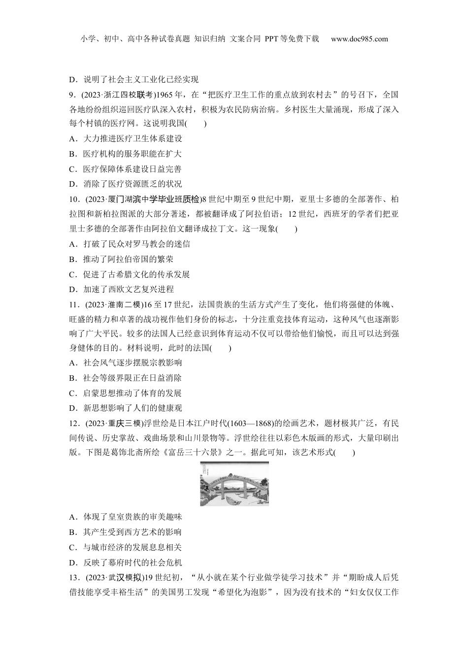 小学、初中、高中各种试卷真题知识归纳文案合同PPT等免费下载www.doc985.com训练2贯彻五育并举促进全面发展一、选择题(每题3分,共45分)1.(2023·湖南“一起考”大考联)下表是考古工作者发现的部分商周时期遗址的发掘情况。据此可知,此时期()出土地点遗址年代出土物品江西鹰潭角山窑商早期至西周初期大量印纹陶及原始瓷,多为生活用具,可能此地在当时是大型窑场陕西长安张家坡西周晚期陶窑遗址出土大量陶鬲和鬲残片,上有钤印或刻写的工匠姓名河南郑州人民公园商晚期出土陶压锤、印模等工具;大量的陶器废品,基本为烧造变形或有气泡粘连的陶盆A.民营制陶业有一定的规模B.出现了专业性的区域经济C.贵族对平民的剥削很严重D.官营作坊垄断了陶器制造2.(2023·州模扬拟)“若夫终日驰骋,劳神苦形,罢车马之用,抏士卒之精,费府库之财,而无德厚之恩,务在独乐,不顾众庶,忘国家之政,贪雉兔之获,则仁者不繇也。”出自司马相如的《上林赋》,这段文字的特点是()A.恬静安宁、朴素绮丽B.铺陈排比、辞藻华丽C.朴实生动、传播广泛D.脍炙人口、千古绝唱3.(2023·南京三模)如图甘肃瓜州榆林窟第15窟的唐代壁画,在莲花上站立着一位两脚前后开立、右手执球杖、左手执球的儿童,其形象表现为屈膝、上身前俯,欲作抛球击打的动作。该壁画体现了()A.西域民众生活富足B.体育和艺术的结合小学、初中、高中各种试卷真题知识归纳文案合同PPT等免费下载www.doc985.comC.市民阶层精神解放D.社会崇尚奢靡享乐4.(2023·福建适性应检测)宋代理学家发挥《中庸》的“天命之谓性”说,确证人人生来就有善的德性,善的德性根源于天,神圣而又庄严,需要人用一生来护持和坚守。人对自身善性的修养是责任,亦是权利。这表明宋代理学()A.主张消除人的欲望B.注重塑造人的品德C.强调人要敬畏自然D.意在维护个人权利5.(2023·哈大附中二模师)清代前期,一些学者回归汉学,从文字、文献的研究入手,对中国历史文化原典进行了卓有成效的实证性研究,并在这种研究中发展了实证考据的科学方法和学术精神,这种研究体现了()A.对偏重思辨和直觉体悟学术传统的一次超越B.经世致用的学术主张逐渐发展成为时代主流C.清政府提倡对传统学术的考证研究D.宽松的文化环境促进学术研究进步6.(2023·浙江十校盟考联联)1902年,中国部分地区遭遇了瘟疫,《大公报》给予极大关注,在社会各界人士投递的稿件中出现了“微生物”等词。1910-1911年间,当鼠疫波及华北之时,《大公报》刊载了天津官医院的来稿,详细介绍了鼠疫的危害、病因、症状以及预防鼠疫的方法,还开设专栏介绍防疫知识。这表明大众传媒()A.从根本上改变了人们日常生活方式B.成为探究生命科学研究的理论阵地C.促使科学的卫生观念在防治疫病中传播D.彻底改变了人们观察世界的角度和方法7.(2023·南通四模)1938年,矿工吴运铎参加了新四军。1941年,在淮南根据地,他带领职工自制土设备,扩大枪弹生产,还成功研制出拉雷、电发踏雷等多种武器弹药,为提高部队火力作出了突出贡献。他说:“只要我的劳动融合在集体的胜利里,那幸福也就有我一份。”由此可知当时()A.陕甘宁边区民众形成勤俭节约的传统B.抗战大后方的军工产业获得迅速发展C.无产阶级革命战士发扬自主创新精神D.大生产运动体现军民自力更生的品质8.(2023·重三模庆)下图是1960年发行的第三套人民币贰元币正面图像。此图()A.揭示了社会主义经济调整的必要性B.体现了崇尚劳动的社会主义新风尚C.反映了我国集中发展重工业的战略小学、初中、高中各种试卷真题知识归纳文案合同PPT等免费下载www.doc985.comD.说明了社会主义工业化已经实现9.(2023·浙江四校考联)1965年,在“把医疗卫生工作的重点放到农村去”的号召下,全国各地纷纷组织巡回医疗队深入农村,积极为农民防病治病。乡村医生大量涌现,形成了深入每个村镇的医疗网。这说明我国()A.大力推进医疗卫生体系建设B.医疗机构的服务职能在扩大C.医疗保障体系建设日益完善D.消除了医疗资源匮乏的状况10.(2023·厦湖中班门滨学毕业质检)8世纪中期至9世纪中期,亚里士多德的全部著作、柏拉图和新柏拉图派的...