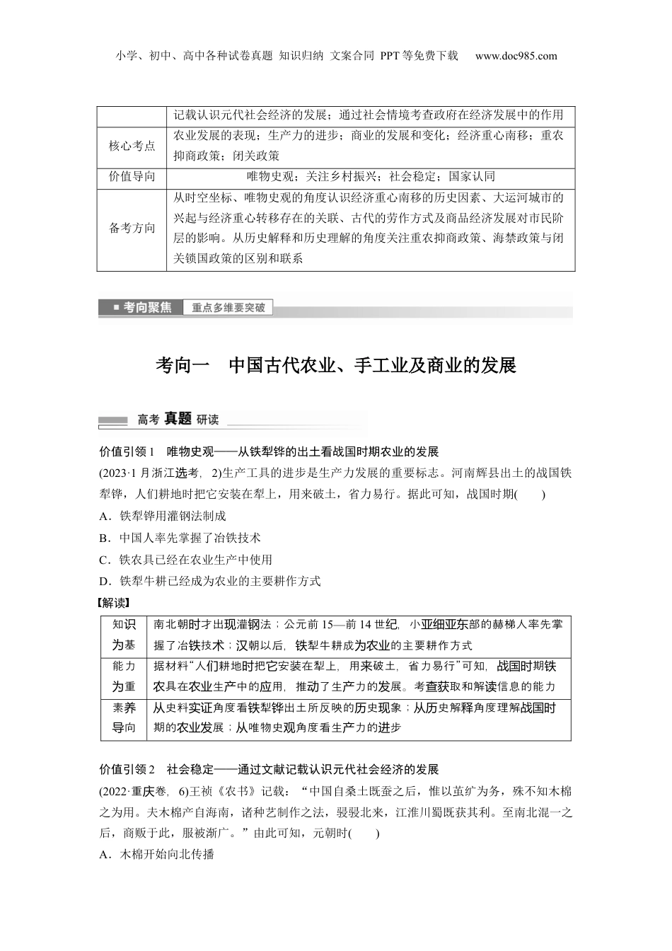 小学、初中、高中各种试卷真题知识归纳文案合同PPT等免费下载www.doc985.com专题三中国古代经济与社会生活知识体系专题线索经济活动是人类赖以生存和发展的基础,包括食(农业)、用(手工业和商业)、居(村落、集镇、城市)、医(医疗卫生)等方面线索一:中国古代农业的发展春秋战国时期,以铁犁牛耕、男耕女织、自给自足为基本特点的小农经济逐渐形成,成为中国传统农业社会生产的基本模式。之后,中国古代农业生产技术不断发展,农耕经济的范围不断扩大线索二:中国古代的手工业和商业中国古代手工业存在家庭手工业、官营手工业和民营手工业三种经营形态,丝绸、瓷器等手工业产品长期领先世界。中国古代商业中,官商和私商长期并存,官商具有一定的垄断性,私商对官商存在一定的依附关系线索三:中国古代的经济政策及社会生活的变迁受中央集权制度的影响,国家权力高度集中并渗透社会与经济生活,形成了土地私有、重农抑商、闭关自守等政策。从唐朝中期到宋元时期,人身依附关系逐渐减弱,思想观念也发生了一些变化线索四:中国古代的村落、集镇、城市和医疗在农耕经济发展的基础上,中国古代的村落、集镇形成,城市则是封建统治的中心,手工业生产和商品贸易在城市中处于依附地位;古代交通发达。在医疗卫生方面,逐渐形成了中医药体系,为中国乃至世界医学的发展作出了巨大贡献情境设计通过生活情境考查明代南方经济的发展;通过考古发现认识战国时期农业的发展和宋代经济的发展。通过表格素材考查汉代江南经济的发展。通过文献小学、初中、高中各种试卷真题知识归纳文案合同PPT等免费下载www.doc985.com记载认识元代社会经济的发展;通过社会情境考查政府在经济发展中的作用核心考点农业发展的表现;生产力的进步;商业的发展和变化;经济重心南移;重农抑商政策;闭关政策价值导向唯物史观;关注乡村振兴;社会稳定;国家认同备考方向从时空坐标、唯物史观的角度认识经济重心南移的历史因素、大运河城市的兴起与经济重心转移存在的关联、古代的劳作方式及商品经济发展对市民阶层的影响。从历史解释和历史理解的角度关注重农抑商政策、海禁政策与闭关锁国政策的区别和联系考向一中国古代农业、手工业及商业的发展价值引领1唯物史观——从铁犁铧的出土看战国时期农业的发展(2023·1月浙江考,选2)生产工具的进步是生产力发展的重要标志。河南辉县出土的战国铁犁铧,人们耕地时把它安装在犁上,用来破土,省力易行。据此可知,战国时期()A.铁犁铧用灌钢法制成B.中国人率先掌握了冶铁技术C.铁农具已经在农业生产中使用D.铁犁牛耕已经成为农业的主要耕作方式解读知识基为南北朝才出灌法;公元前时现钢15—前14世,小部的赫梯人率先掌纪亚细亚东握了冶技;朝以后,犁牛耕成的主要耕作方式铁术汉铁为农业能力重为据材料“人耕地把安装在犁上,用破土,省力易行们时它来”可知,期战国时铁具在生中的用,推了生力的展。考取和解信息的能力农农业产应动产发查获读素养向导史料角度看犁出土所反映的史象;史解角度理解从实证铁铧历现从历释战国时期的展;唯物史角度看生力的步农业发从观产进价值引领2社会稳定——通过文献记载认识元代社会经济的发展(2022·重卷,庆6)王祯《农书》记载:“中国自桑土既蚕之后,惟以茧纩为务,殊不知木棉之为用。夫木棉产自海南,诸种艺制作之法,骎骎北来,江淮川蜀既获其利。至南北混一之后,商贩于此,服被渐广。”由此可知,元朝时()A.木棉开始向北传播小学、初中、高中各种试卷真题知识归纳文案合同PPT等免费下载www.doc985.comB.商贾对外出口大宗棉布C.丝绸产量不及棉布D.国家统一促进棉布流行解读知识基为①元朝治者的重政策。了其治,元世祖忽必烈在建伊始就确立统农为维护统国了“桑奖励农”的立方。国针②元代棉技的步。元代的看,在棉业术进从农书来花的栽培方面,地、整地到施肥,都取得了很大的步。从择选种进③道婆改黄工具,制造用机具,成各花的棉品,促江流域棉进纺织专织种纹织对进长纺织和棉花植的迅速展起了重要作用业种业发能力重为元代是一多民族家一步展期,着家一以及交通展,南北统国进发时随国统发经系一步密切,棉在全的...