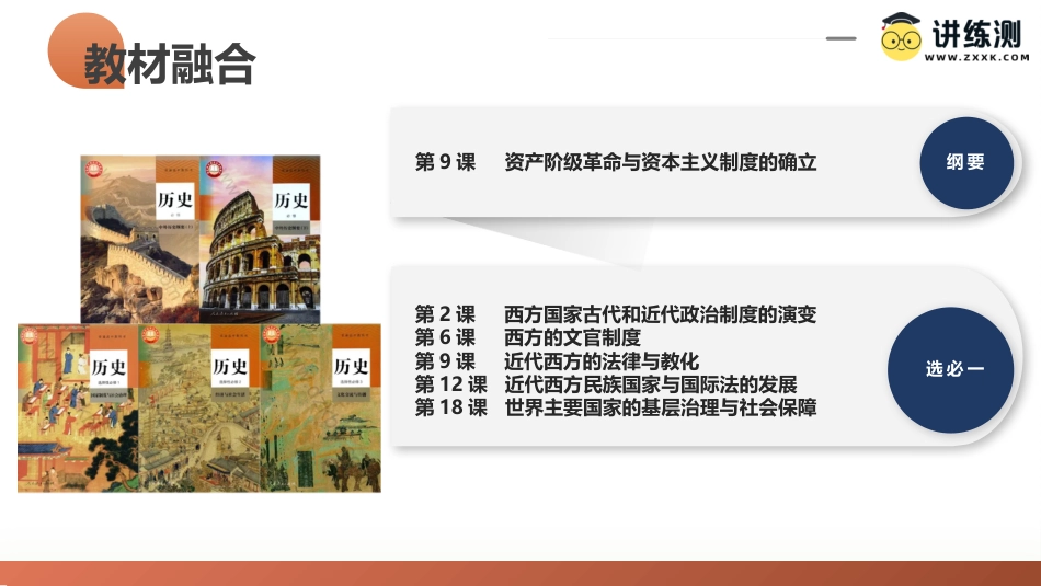 第32讲资产阶级革命与资本主义制度的确立高考一轮复习讲练测2024选必一纲要第2课西方国家古代和近代政治制度的演变第6课西方的文官制度第9课近代西方的法律与教化第12课近代西方民族国家与国际法的发展第18课世界主要国家的基层治理与社会保障教材融合第9课资产阶级革命与资本主义制度的确立稿定PPT稿定PPT,海量素材持续更新,上千款模板有选择总一款适合你02考情分析考点要求考题统计考情分析英、美、法资产阶级革命2023北京卷选择题,3分2023全国乙卷选择题,4分2022北京卷选择题,3分2022湖北卷选择题,3分2021重庆卷选择题,3分2021海南卷选择题,3分2021广东卷选择题,3分近三年考查较多,通过不同国家的资产阶级革命了解革命不同过程。复习时重点把握,注意和资本主义经济发展结合。资本主义的扩展2023全国卷新课标选择题,4分2023全国甲卷非选择题,15分2022北京卷选择题,3分2022湖北卷选择题,3分2022全国甲卷非选择题,15分2021江苏卷非选择题15分这部分内容和资本主义制度的建立结合复习,重点和地图结合,放到国际背景中重点把握。考点一资产阶级革命【夯基·知识梳理】知识点1英、美、法资产阶级革命【提升·考向预测】考向1英、美、法资产阶级革命01复习目标02网络构建03梳理预测考点二资本主义制度的确立【夯基·知识梳理】知识点1资本主义基本制度的确立知识点2资本主义的扩展知识点3官员的选拔与管理(选必一)知识点4近代的法律与教化(选必一)【提升·考向预测】考向1资本主义的扩展目录索引CONTENTS04真题感悟01复习目标PARTONE稿定PPT稿定PPT,海量素材持续更新,上千款模板有选择总一款适合你021、了解三国革命进程与革命成果,认识资本主义制度和经济制度的确立是资产阶级反对封建制度的产物。2、正确认识资本主义制度的实质,认清资产阶级所宣扬的人权、自由、平等和博爱精神的本质,引导学生树立正确的价值观。复习目标02网络构建PARTONE02网络构建03梳理预测PARTONE稿定PPT夯基·知识梳理考点一资产阶级革命知识点1英、美、法资产阶级革命1.英国资产阶级革命(1)背景:16~17世纪,资产阶级和新贵族在经济上日益强大,他们以议会为基地,向专制王权发起挑战。(2)过程:①1640年,英国爆发革命;1688年,“光荣革命”使资产阶级革命成果获得巩固;②1689年通过的《权利法案》明确限制王权;02③1701年,《王位继承法》通过,“议会至上”原则被确立,国王逐渐处于“统而不治”的地位。(3)影响:以和平手段,把英国改造成君主立宪制国家,为英国开辟了和平渐进的发展之路。稿定PPT稿定PPT,海量素材持续更新,上千款模板有选择总一款适合你022.美国独立战争(1)背景:18世纪中叶,英国对北美大西洋沿岸13块殖民地的种种限制和剥削,激起了北美人民的不满。(2)过程:①1775年4月,来克星顿发生冲突,北美独立战争开始;②1776年7月4日,大陆会议发表《独立宣言》,阐述了人民主权思想,宣告北美殖民地脱离英国独立;③1783年,英国承认美国独立,签署《巴黎和约》。(3)影响:美国独立战争是一场资产阶级革命,促进了欧洲国家的资产阶级革命,为拉丁美洲独立战争提供了先例。稿定PPT稿定PPT,海量素材持续更新,上千款模板有选择总一款适合你02稿定PPT稿定PPT,海量素材持续更新,上千款模板有选择总一款适合你023.法国资产阶级革命(1)原因:①18世纪,法国封建制度严重阻碍资本主义发展;②资产阶级迫切要求摆脱封建专制统治和等级制度的束缚;③启蒙思想的影响。(2)过程:①1789年7月14日,法国民众攻占了巴士底狱,法国爆发大革命;②1789年8月,颁布《人权宣言》,提出人权、自由、平等、法治、人民主权和保护私有财产等原则;③1791年,颁布宪法,确立了新制度的基本框架;稿定PPT稿定PPT,海量素材持续更新,上千款模板有选择总一款适合你02④1799年,拿破仑发动军事政变,建立军事独裁统治;⑤1815年,拿破仑帝国覆灭。(3)影响:法国大革命沉重打击了欧洲其他国家的封建制度,革命的原则随拿破仑的军队传播到欧洲各地。稿定PPT稿定PPT,海量素材持续更新,上千款模板有选择总一款适合你02考向1英、美、法资产阶级革命1.英国资产阶...