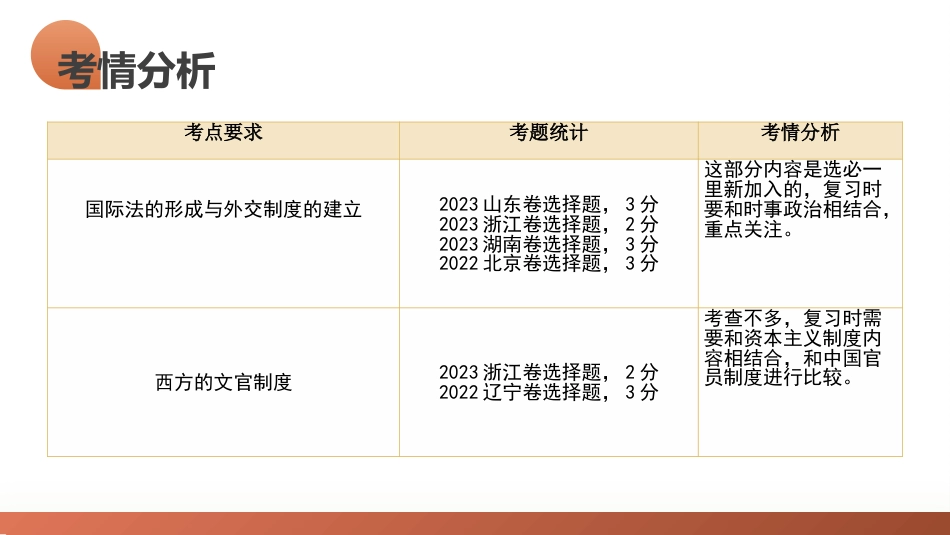 第35讲近代西方的民族国家文官制度与国际法高考一轮复习讲练测2024选必一纲要第6课西方的文官制度第12课近代西方民族国家与国际法的发展教材融合第6课全球航路的开辟第7课全球联系的初步建立与世界格局的演变第8课欧洲的思想解放运动稿定PPT稿定PPT,海量素材持续更新,上千款模板有选择总一款适合你02考情分析考点要求考题统计考情分析国际法的形成与外交制度的建立2023山东卷选择题,3分2023浙江卷选择题,2分2023湖南卷选择题,3分2022北京卷选择题,3分这部分内容是选必一里新加入的,复习时要和时事政治相结合,重点关注。西方的文官制度2023浙江卷选择题,2分2022辽宁卷选择题,3分考查不多,复习时需要和资本主义制度内容相结合,和中国官员制度进行比较。考点一近代西方民族国家与国际法发展【夯基·知识梳理】知识点1近代西方民族国家的产生知识点2国际法的形成与外交制度的建立知识点320世纪国际法的发展【提升·考向预测】考向1国际法的形成与外交制度的建立01复习目标02网络构建03梳理预测考点二近代西方的文官制度【夯基·知识梳理】知识点1西方文官制度出现的背景知识点2西方文官制度的建立知识点3西方文官制度的特点和影响【提升·考向预测】考向1西方的文官制度目录索引CONTENTS04真题感悟01复习目标PARTONE稿定PPT稿定PPT,海量素材持续更新,上千款模板有选择总一款适合你021、通过对近代欧洲民族国家及国际法的学习,使学生能够认识国际法的产生对欧洲各国、对世界的影响,并且能够认识到民族国际对国际法产生的推动作用。2、通过分析文官制度出现的历史因素和现实因素,认识文官制度首先出现在英国的必然性,培养历史解释素养。引导学生从唯物史观的角度正确认识其历史作用,培养唯物史观素养。复习目标02网络构建PARTONE02网络构建03梳理预测PARTONE稿定PPT夯基·知识梳理考点一近代西方民族国家与国际法发展知识点1近代西方民族国家的产生(选必一)1.专制王权国家形成(1)背景①15世纪前后,西欧国家的封建割据势力遭到削弱,中央集权得到加强。②宗教改革运动沉重打击了教会势力,强化了各国的世俗权力,国家和民族认同观念日益显现。稿定PPT稿定PPT,海量素材持续更新,上千款模板有选择总一款适合你02(2)表现①1534年,英国通过《至尊法案》,宣布国王是英国教会的首脑,摆脱罗马教廷的控制,建立起国王的专制统治。②路易十四统治时期,法国王权达到顶峰。③欧洲国家纷纷成为专制王权国家。(3)特点:国家的版图常常因为国王的婚姻或继承关系发生改变。2.民族国家的建立(1)背景①13世纪,英语开始成为英国人广泛使用的语言;16世纪,法语成为法国的官方语言。对民族语言的重视强化了民族认同,促进了民族国家的形成。稿定PPT稿定PPT,海量素材持续更新,上千款模板有选择总一款适合你02②法国大革命及拿破仑战争,不仅传播了自由平等思想,还促进了欧洲各国民族意识的觉醒。(2)表现①欧洲各专制王权国家逐渐变为具有独立主权的民族国家。②这些民族国家有的由单一民族组成,更多的则是包括了多个民族。稿定PPT稿定PPT,海量素材持续更新,上千款模板有选择总一款适合你02知识点2国际法的形成与外交制度的建立(选必一)1.国际法的形成(1)背景①随着国家主权意识的加强,各国都强调国家利益至上,国家之间的利益纷争加剧。②人们希望通过建立一定的法律制度来处理国家之间的关系,减少武力冲突。(2)过程A.荷兰人格劳秀斯在1625年岀版的《战争与和平法》一书中提出君主应该制定条约并接受约束,确定了国际法的主体是主权国家,奠定了国际法的基础。B.威斯特伐利亚体系稿定PPT稿定PPT,海量素材持续更新,上千款模板有选择总一款适合你02①形成:1648年交战各方签订《威斯特伐利亚和约》,结束欧洲混战局面,形成威斯特伐利亚体系。②意义:确立了国际关系中的国家领土、主权与独立等原则;开创了用国际会议和通过谈判达成协议的形式解决国际争端、结束国际战争的先例;确认了缔约国必须遵守条约、各缔约国可以对违约国家集体制裁的国际法基本原则。2.近代外交制度建立(1)基础:17世纪时,欧洲国家的君主们不再满足仅仅派遣临时使者与他...