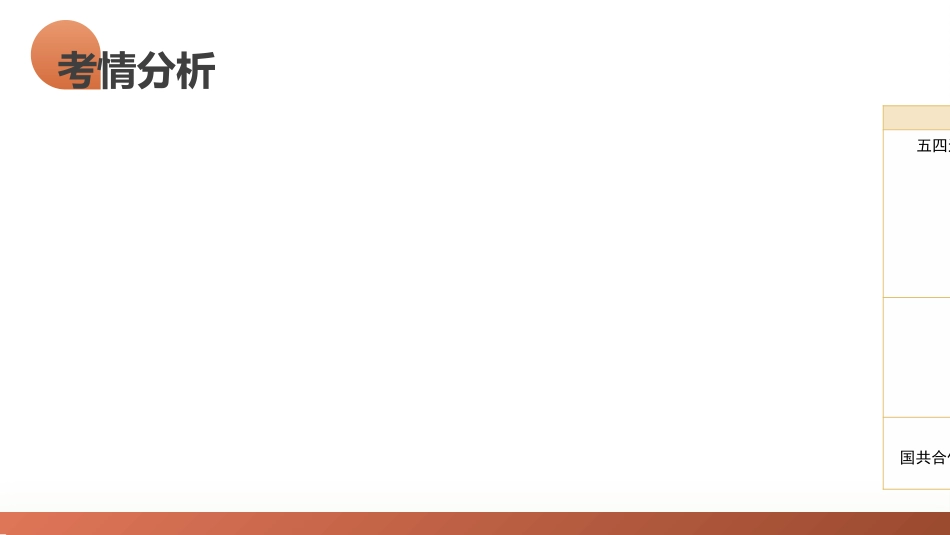 第18讲五四运动与中国共产党的诞生高考一轮复习讲练测2024纲要上纲要下第11课马克思主义的诞生和传播第14课第一次世界大战与战后国际秩序第15课革命的胜利与苏联的社会主义实践第16课亚非拉民族民主运动的高涨第21课五四运动与中国共产党的诞生教材融合稿定PPT稿定PPT,海量素材持续更新,上千款模板有选择总一款适合你02考情分析五四运国共合作考点一五四运动和马克思主义的传播【夯基·知识梳理】知识点1五四运动知识点2马克思主义的传播【提升·考向预测】考向1五四运动和马克思主义的传播01复习目标02网络构建03梳理预测考点二中国共产党的诞生与国共合作【夯基·知识梳理】知识点1中国共产党的诞生知识点2国共合作与国民革命【提升·考向预测】考向1中国共产党的诞生考向2国共合作与国民革命目录索引CONTENTS04真题感悟01复习目标PARTONE稿定PPT稿定PPT,海量素材持续更新,上千款模板有选择总一款适合你021、认识列强侵华对中国社会的影响,概述晚清时期中国军民反抗外来侵略的斗争事迹,理解其性质和意义。2、认识社会各阶级为挽救危局所作的努力及存在的局限性。复习目标02网络构建PARTONE02网络构建03梳理预测PARTONE稿定PPT夯基·知识梳理考点一五四运动和马克思主义的传播知识点1五四运动(一)五四运动1、背景(根本原因是阶级矛盾尖锐,即北洋军阀的黑暗统治)(1)政治:北洋军阀对内独裁统治,对外出卖主权。(2)经济:民族工业进一步发展(短暂春天)。(3)阶级:工人阶级力量壮大。(4)思想:新文化运动解放思想;俄国十月革命的胜利,指明革命新方向:马克思主义的传播。稿定PPT稿定PPT,海量素材持续更新,上千款模板有选择总一款适合你02(5)外交(导火线):1919年初,巴黎和会外交失败①1919年1月,巴黎召开的“和平会议”,中国提出废除外国在中国的一切特权、取消“二十一条”等正义要求遭和会拒绝。②和会竟决定将德国在中国山东的权益转让给日本。这一消息激起人们的愤怒,成为五四运动爆发的导火索。2、过程:(特点:革命性、爱国性、群众性、彻底性)时间中心口号主力形式第一阶段1919年5月4日北京“外争主权,内除国贼”“誓死力争,还我青岛”“废除二十一条”“拒绝在合约上签字”学生游行示威第二阶段1919年6月5日上海—工人工人罢工,商人罢市,学生罢课稿定PPT023、结果:五四运动取得初步胜利。(1)北洋政府释放了被捕学生。(2)参加巴黎和会的中国代表也拒绝在和约上签字。稿定PPT稿定PPT,海量素材持续更新,上千款模板有选择总一款适合你02探究·知识拓展旧民主主义革命和新民主主义革命项目旧民主主义革命新民主主义革命相同点革命性质资产阶级民主革命(由任务决定)社会性质半殖民地半封建社会革命任务反帝反封建不同点领导阶级资产阶级无产阶级指导思想三民主义马克思主义群众基础不广泛广泛结果资产阶级共和国人民民主专政的国家前途资本主义社会主义范畴世界资产阶级革命世界无产阶级革命稿定PPT稿定PPT,海量素材持续更新,上千款模板有选择总一款适合你02探究·知识拓展五四运动是中国旧民主主义革命走向新民主主义革命的转折点(1)从领导阶级看,五四运动中,中国工人阶级开始登上政治舞台,在运动中发挥了主力军的作用。(2)从指导思想上看,五四运动后,马克思主义成为新文化运动传播的主要思想,并逐渐与工人运动结合在一起。(3)从革命前途上看,工人阶级不仅要砸碎一个旧世界,还要建立一个完全不同于以往的新社会。(4)从时代特点上看,五四运动发生在俄国十月革命之后,属于世界无产阶级革命的一部分。稿定PPT稿定PPT,海量素材持续更新,上千款模板有选择总一款适合你02知识点2马克思主义的传播1、时间、地点:从十月革命后(1917年11月)开始广泛传播,北京与上海成为宣传马克思主义的中心。2、载体:1919年李大钊在《新青年》“马克思主义专号”上发表了《我的马克思主义观》,系统介绍了马克思主义学说。3、团体:1920年3月,李大钊又发起中国最早研究马克思主义的团体——马克思学说研究会,1920年5月,陈独秀在上海组织了马克思主义研究会。(南陈北李)4、人员:从日本留学回国的李达、陈望道(1920翻译...