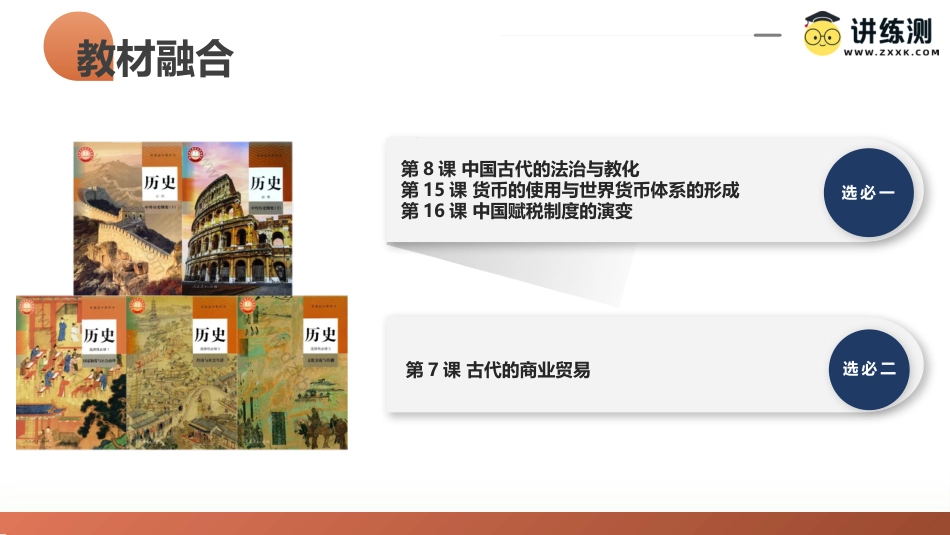 第11讲中国古代的法治教化商业贸易及货币与赋税制度高考一轮复习讲练测2024选必二选必一第8课中国古代的法治与教化第15课货币的使用与世界货币体系的形成第16课中国赋税制度的演变第7课古代的商业贸易教材融合稿定PPT稿定PPT,海量素材持续更新,上千款模板有选择总一款适合你02考情分析考点要求考题统计考情分析中国古代的法治教化2023浙江卷非选择题,15分2022天津卷非选择题,20分2022海南卷选择题,3分2022北京卷选择题,3分2021海南卷选择题,3分2021湖北卷选择题,3分这部分内容是新教材新加出来的知识点,但是近三年考查较多,复习时和当时的朝代背景相结合,放到特定的时期理解记忆可以达到事半功倍效果。中国古代商贸2022河北卷选择题,3分整个中国古代史中商贸部分是经济史的重要环节,复习时重点关注史料部分。中国货币的演进历程2022湖北卷选择题,3分2020海南卷选择题,2分2020全国新课标Ⅲ卷,4分近年考查多,考查方式是图文结合,跨度较大,需要学生能够快速理清货币发展史。中国古代的赋税制度2023湖南卷非选择题,18分2023浙江卷选择题,3分2022北京卷非选择题,12分2021湖北卷非选择题,14分2021辽宁卷选择题,3分2021广东卷选择题,3分复习这部分内容时,除了将历朝历代赋税制度理清,还要对赋税变化重点把握。考点一中国古代的法治教化(选必一)【夯基·知识梳理】知识点1先秦时期的德治与法治知识点2秦汉至隋唐时期的法律与教化知识点3宋元至明清时期的法律与教化【提升·考向预测】考向1中国古代的法治教化01复习目标02网络构建03梳理预测考点二中国古代商贸、货币与赋税制度【夯基·知识梳理】知识点1商业贸易的起源与发展(选必二)知识点2货币、信贷、商业契约(选必二)知识点3中国古代的赋役制度(选必一)【提升·考向预测】考向1中国古代商贸考向2中国货币的演进历程考向3中国古代的赋税制度目录索引CONTENTS04真题感悟01复习目标PARTONE稿定PPT稿定PPT,海量素材持续更新,上千款模板有选择总一款适合你021、理解中国古代历朝历代法治教化的特点,明白法治教化对中国古代封建社会统治的影响。2、概述中国古代商贸、货币与赋税制度的主要内容,探讨其对近代中国经济发展的影响。复习目标02网络构建PARTONE02网络构建03梳理预测PARTONE稿定PPT夯基·知识梳理考点一中国古代的法治教化知识点1先秦时期的德治与法治1.夏商:君主及奴隶主贵族可以随意残害奴隶。2.西周:为维护社会等级秩序,建立了以宗法为核心的礼制,提出“敬天保民”思想,有一定的进步性。3.东周:(1)背景:王室衰微,大国争霸,礼崩乐坏。诸侯国君纷纷寻找治国新思想,出现百家争鸣局面。(2)代表:①儒家:德治思想;②法家:法治思想。稿定PPT稿定PPT,海量素材持续更新,上千款模板有选择总一款适合你02a.儒家的德治思想(1)早期:子产“铸刑书”引发了一场辩论。(2)春秋战国时期:德治与法治之争在思想界体现为儒家与法家之争。代表时代治国思想教化思想理论来源孔子春秋为政以德,“节用而爱人,使民以时”,不要过度消耗民力通过道德礼义教化民众,重视民生与民意,宣称“民为贵,社稷次之,君为轻”人性善孟子战国“施仁政于民,省刑罚,薄税敛”稿定PPT02b.法家的法治思想(1)早期国家:已经有了法律。夏朝有《禹刑》,商朝有《汤刑》,周朝有《九刑》。(2)春秋时期:中国最早的成文法出现。郑国的子产“铸刑书”,把刑法浇铸在金属器皿上,制定了中国历史上最早的成文法。代表国别治国主张(实践)社会教化理论来源韩非韩国君主要以法、术、势驾驭臣下;君主赏罚分明为保证法令畅通,韩非主张“以法为教”“以吏为师”人性恶商鞅秦国颁行法令,保护新兴地主阶级的权益(3)结果:a.儒家主张通过道德礼义教化民众,重视民生与民意,但不适用于战争激烈的战国时期。b.法家思想既能带来富国强兵的现实利益,又满足了各国君主专制的愿望。稿定PPT稿定PPT,海量素材持续更新,上千款模板有选择总一款适合你02知识点2秦汉至隋唐时期的法律与教化1.秦朝:(1)以法家思想治国,推动了律的编纂。此后,历朝法典多以“律”命名。(2)云梦睡虎地秦简,极大丰富了人们对秦律...