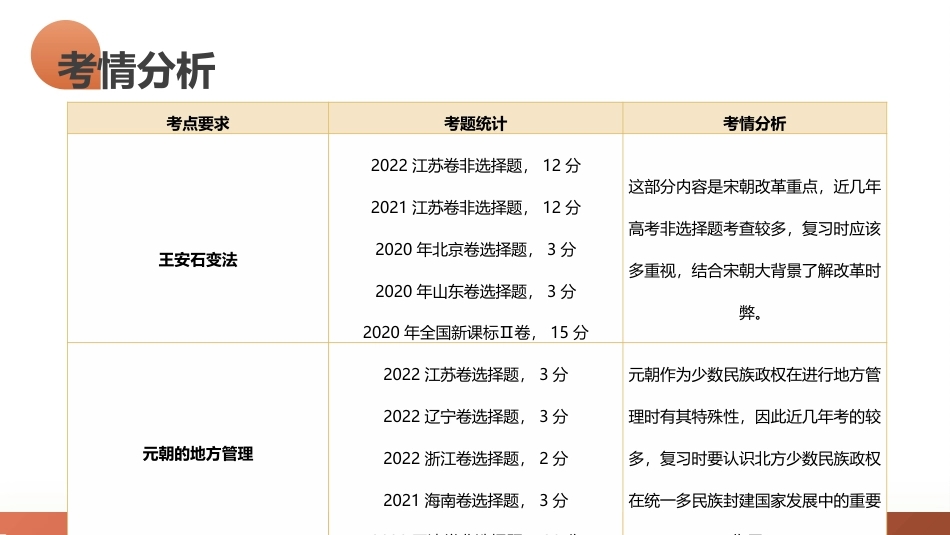 第06讲两宋的政治、军事及辽夏金元的统治高考一轮复习讲练测2024选必一纲要选必三第9课两宋的政治和军事P49第10课辽夏金元的统治P54第1课中国古代政治制度的形成与发展P2-3第4课中国历代变法与改革第5课中国古代官员的选拔与管理P30第8课中国古代的法治与教化P44第11课中国古代的民族关系与对外交往P60第16课中国赋税制度的演变P92第17课中国古代的户籍制度与社会治理P98第2课中华文化的世界意义P8第9课古代的商路、贸易与文化交流P49第11课古代战争与地域文化的演变P63教材融合稿定PPT稿定PPT,海量素材持续更新,上千款模板有选择总一款适合你02考情分析考点要求考题统计考情分析王安石变法2022江苏卷非选择题,12分2021江苏卷非选择题,12分2020年北京卷选择题,3分2020年山东卷选择题,3分2020年全国新课标Ⅱ卷,15分这部分内容是宋朝改革重点,近几年高考非选择题考查较多,复习时应该多重视,结合宋朝大背景了解改革时弊。元朝的地方管理2022江苏卷选择题,3分2022辽宁卷选择题,3分2022浙江卷选择题,2分2021海南卷选择题,3分津卷选分元朝作为少数民族政权在进行地方管理时有其特殊性,因此近几年考的较多,复习时要认识北方少数民族政权在统一多民族封建国家发展中的重要作考点一两宋的政治统治与内政外交【夯基·知识梳理】知识点1宋朝政治制度与施政措施知识点2官员的选拔与管理(选必一)知识点3法律与教化(选必一)知识点4民族关系与对外交往(选必一)知识点5户籍制度和基层治理(选必一)【提升·考向预测】考向1王安石变法01复习目标02网络构建03梳理预测考点二辽夏金元的政权更替与内政外交【夯基·知识梳理】知识点1辽夏金元的政治制度与施政措施知识点2官员的选拔与管理(选必一)知识点3官员的选拔与管理(选必一)知识点4户籍制度和基层治理(选必一)【提升·考向预测】考向1元朝的地方管理目录索引CONTENTS04真题感悟01复习目标PARTONE稿定PPT稿定PPT,海量素材持续更新,上千款模板有选择总一款适合你021、通过唐后期和五代十国的社会动荡,理解北宋初期强化中央集权的举措;了解北宋中期的重要改革,认识两宋时期在政治、军事上的新变化和重要影响。2、通过了解辽夏金元诸政权的建立、发展和相关制度建设,认识北方少数民族政权在统一多民族封建国家发展中的重要作用。复习目标02网络构建PARTONE02网络构建03梳理预测PARTONE稿定PPT夯基·知识梳理考点一两宋的政治统治与内政外交知识点1宋朝政治制度与施政措施稿定PPT稿定PPT,海量素材持续更新,上千款模板有选择总一款适合你02一、宋初中央集权的加强1、背景:①建立:960年后周大将赵匡胤发动陈桥驿兵变(黄袍加身),改国号为宋,以开封为东京,作为都城,史称北宋。赵匡胤就是宋太祖。②统一:北宋建立后,相继灭掉南方的几个割据政权和北方的北汉,结束了五代十国的分裂局面(方针:先南后北)③教训:吸取唐后期以来军阀割据、政局动荡的历史教训:外重内轻,君弱臣强。2、目的:加强中央集权,维护政权稳定。3、措施:(1)加强对地方的控制:稿定PPT稿定PPT,海量素材持续更新,上千款模板有选择总一款适合你02①行政上(夺其权):中央派文官出任地方各州的长官知州,节度使逐渐变为虚衔;②经济财政上(制钱谷):设诸路转运司统管地方财政,保证各州赋税绝大部分上缴朝廷;③军事上(收其兵):将地方精锐部队编入禁军,拱卫京师,镇守地方,定期更换驻地。(杯酒释兵权)特点:强干弱枝,守内虚外(2)分散机构权力:(中央:二府三司三衙一台谏,加强君主专制)(特点:分化事权,内外相制)02中央军事权①设枢密院专掌军政,分割宰相军权②枢密院与禁军管理机构“三衙”分权,前者有调兵权但并不统兵,后者统兵但无权调兵。财政权三司专掌财政,与宰相分权,行政权增设参知政事为副相,分割宰相行政权地方①包括转运司在内,先后设立了平行的四个路级机构(四监司),从不同方面对各州进行监控和节制。②州一级增设通判,与知州共同签署文书,彼此制约。(削弱地方权力,强化中央集权。)皇权—相权特点:从汉唐到宋朝,相权逐渐削弱,君权逐渐加强02(3)崇文抑武(重文轻武——重视文...
