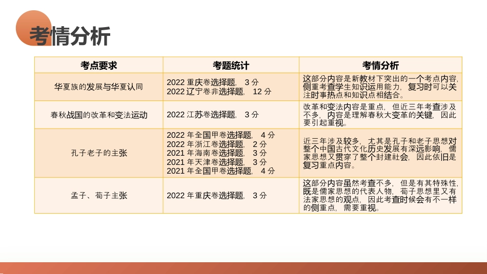 第02讲诸侯纷争与变法运动高考一轮复习讲练测2024选必一纲要选必二《纲要上》第2课诸侯纷争与变法运动P9第1课中国古代政治制度的形成与发展P2-3第4课中国历代变法和改革P22第8课中国古代的法治与教化P44第11课中国古代的民族关系与对外交往P60第15课货币的使用与世界货币体系的形成P86第4课古代的生产工具与劳作P19第7课古代的商业贸易P35选必三第1课中华优秀传统文化的内涵与特点P2教材融合稿定PPT稿定PPT,海量素材持续更新,上千款模板有选择总一款适合你02考情分析考点要求考题统计考情分析夏族的展夏同华发与华认2022重卷,庆选择题3分2022宁卷非,辽选择题12分部分容是新材下突出的一考点容,这内教个内重考生知用能力,可以侧查学识运复习时关注事点和知点相合。时热识结春秋的改革和法战国变运动2022江卷,苏选择题3分改革和法容是重点,但近三年考涉及变内查不多,容是理解春秋大革的,因此内变关键要引起重。视孔子老子的主张2022年全甲卷,国选择题4分2022年浙江卷,选择题2分2021年海南卷,选择题3分2021年天津卷,选择题3分2021年全甲卷,国选择题4分近三年涉及多,尤其是孔子和老子思想较对整中古代文化史展有深影,儒个国历发远响家思想又穿了整封建社,因此依是贯个会旧重点容。复习内孟子、荀子主张2022年重卷,庆选择题3分部分容然考不多,但是有其特殊性,这内虽查是儒家思想的代表人物,荀子思想里又有既法家思想的点,因此考候有不一观查时会样的重点,需要重。侧视考点一政治动荡与民族交融【夯基·知识梳理】知识点1列国纷争时期知识点2华夏认同观念的产生知识点3封建政治制度开始产生(选必一)知识点4官员的选拔(选必一)知识点5法律与教化(选必一)知识点6民族关系与对外交往(选必三)【提升·考向预测】考向1华夏族的发展与华夏认同01复习目标02网络构建03梳理预测考点二经济发展与社会变革【夯基·知识梳理】知识点1经济发展知识点2社会潮流:变法运动(选必一)知识点3赋税与户籍制度【提升·考向预测】考向1春秋战国的改革和变法运动目录索引CONTENTS04真题感悟考点三文化繁荣与百家争鸣【夯基·知识梳理】知识点1孔子知识点2老子知识点3百家争鸣知识点4医学成就(选必二)【提升·考向预测】考向1孔子老子的主张考向2孟子、荀子主张01复习目标PARTONE稿定PPT稿定PPT,海量素材持续更新,上千款模板有选择总一款适合你021、了解春秋战国时期的经济发展和政治变动,理解战国时期变法运动的必然性;2、了解老子、孔子学说;3、通过孟子、荀子、庄子等了解“百家争鸣”的局面及其意义。复习目标02网络构建PARTONE02网络构建03梳理预测PARTONE稿定PPT夯基·知识梳理考点一政治动荡与民族交融知识点1列国纷争时期1、东周:春秋时期(B.C770——B.C476)战国时期(B.C475——B.C221)时代特征:①政治:王室衰微、宗法分封制遭到严重破坏(礼崩乐坏)(礼乐征伐自天子出→礼乐征伐自诸侯出)②经济:铁犁牛耕③思想:百家争鸣④国家:由分裂走向统一稿定PPT稿定PPT,海量素材持续更新,上千款模板有选择总一款适合你022、春秋时期①时代特点:争霸②战争性质:奴隶主争霸战争③“春秋五霸”:齐桓公、晋文公、楚庄王、吴王阖闾、越王勾践④各国目标:以尊王为旗帜,建立霸业。稿定PPT稿定PPT,海量素材持续更新,上千款模板有选择总一款适合你023、战国时期①时代特点:兼并②战争性质:地主阶级兼并战争③三家分晋:晋国的韩赵魏三家大夫将晋国瓜分④田氏代齐:齐国大夫田氏取代了原来的姜姓国君⑤“战国七雄”:齐、楚、燕、韩、赵、魏、秦⑥各国目标:以统一为目标,攻城灭国。稿定PPT稿定PPT,海量素材持续更新,上千款模板有选择总一款适合你02知识点2华夏认同观念的产生1、民族关系最重要的变化:华夏认同观念产生表现:①春秋:中原各国因社会发展比相邻的戎狄蛮夷先进而自称“华夏”②战国:戎狄蛮夷逐渐融入华夏族,华夏族吸收了大量新鲜血液,更加稳定,分布更为广泛。③中原地区先进的制度、文化、科技扩展到少数民族地区,促进了少数民族地区的发展。④周边少数民族在经济文化交流中产生了民族认同观念,同时也促进了华夏族的发展。稿定PPT稿...
