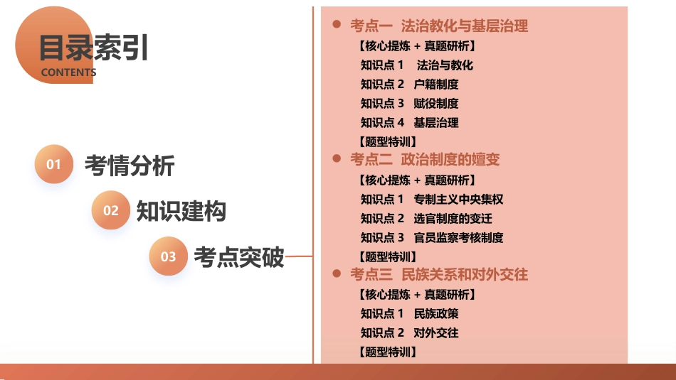 导师:XXX高考二轮复习讲练测2024专题一古代中国的政治制度与国家治理考点一法治教化与基层治理【核心提炼+真题研析】知识点1法治与教化知识点2户籍制度知识点3赋役制度知识点4基层治理【题型特训】考点二政治制度的嬗变【核心提炼+真题研析】知识点1专制主义中央集权知识点2选官制度的变迁知识点3官员监察考核制度【题型特训】考点三民族关系和对外交往【核心提炼+真题研析】知识点1民族政策知识点2对外交往【题型特训】01考情分析02知识建构03考点突破目录索引CONTENTS01考情分析考点要求考题统计(2021——2023)备考建议法治教化与基层治理法治与教化3年7考(选择题5次,非选择题2次)3年考查基本平衡,把握户籍和赋役特点命题,尤其关注法治与教化内容,属于新增加的知识点。复习时关注史料,结合实际进行问题的拓展延伸。中国古代赋役3年7考(选择题3次,非选择题4次)历代户籍制度演变3年1考(选择题1次)历代基层治理3年2考(选择题1次,非选择题1次)政治制度的嬗变专制主义中央集权3年13考(选择题11次,非选择题2次)选官制度和官员的考核监察融合到专制主义内容里进行复习,关注中央机构的构成和发展演变。古代官员选拔管理3年7考(选择题5次,非选择题2次)民族关系和对外交往民族关系和对外交往3年3考(选择题2次,非选择题1次)近三年有所涉及,但也属于重点,备考中从实际出发,联系时事政治内容,注重地图的把握,提高知识运用能力。02知识建构稿定PPT稿定PPT,海量素材持续更新,上千款模板选择总有一款适合你0203考点突破考点一法治教化与基层治理稿定PPT知识点1法治与教化1、先秦时期德治与法治的思想渊源:法治:《左传》记载2,夏有《禹刑》、商有《汤刑》、周有《九刑》,表明早期国家可能已经有了法律。德治:西周统治者建立了以宗法为核心的礼制,同时提出“敬天保民”的思想,有一定的进步性。核心提炼·真题研析表现1:法治:郑国子产“铸刑书”,把刑法浇铸在金属器皿上,制定了中国历史上最早的成文法。德治:叔向写信给子产,反对他刊布法律,理由是刑罚适用于乱世,公布刑书会使老百姓更注重争端而不顾道德礼仪。德法之争的表现:表现2:思想界体现为儒家与法家之争儒法之争派别儒家法家治国手段德治法治代表人物孔子:为政以德,节用而爱人,使民以时。孟子:施仁政于民,省刑罚,薄税敛。民贵君轻,仁者无敌商鞅:颁布法律,保护地主阶级权益韩非:法、术、势驭下;赏罚分明;以法为教,以吏为师人性论人性善人性恶影响有积极意义,但不适合战国时期,无助于君主实现强国抱负,难以落实既能带来实现富国强兵,又满足了各国君主专制的愿望,秦国富强,统一,建立第一个集权封建国家秦朝秦以法家思想治国,推动了律的编纂。此后,历朝法典多以“律”命名。云梦睡虎地秦简,发布法律文告,称“令”两汉沿袭秦律,制成《九章律》。张家山汉墓《二年律令》。法律文告,称“令”。以经注律魏晋法律律令儒家化:原因:儒家成为主流思想之后,以经注律;魏明帝置律博士,专用儒家思想解释律令。影响:法律以亲属之间的尊卑亲疏作为量刑的重要原则之一,目的是维护儒家提倡的三纲五常。教化重视家训唐朝法律律在唐初经过多次删繁就简。唐高宗时在《贞观律》基础上修订颁布《永徽律》。后来,又对律文进行逐条解释,撰成《永徽律疏》,即《唐律疏议》。是中国现存最早、最为完整的封建法典;中华法系确立的标志;历代王朝创制法律的蓝本;礼法结合的典范.教化《大唐开元礼》:提倡礼治的背景。732年颁行,内容有吉、宾、军、嘉、凶五礼。特点是体系庞大,体例严谨,内容繁复。地位是秦汉以来封建礼仪制度的集大成。社会层面:推广魏晋南北朝以来重视家训的经验,强化基层教化。2、秦汉至明清宋朝法律基本沿用唐朝法律体系,制定法律多以唐律为蓝本(举例)教化儒学开始向基层渗透,并发展出理学;南宋后期,程朱理学逐步确立统治地位,控制教育和科举,并通过授徒、书院讲学等方式在社会上广泛传播,甚至深入族规、家训中;朱熹的《家礼》成为家庭和幼童的行为规范。儒学士人投身基层教化,以乡约教化乡里,吕大均和《吕氏乡约》元朝法律对唐宋法律整...