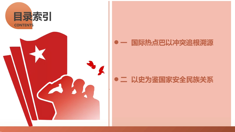 导师:XXX高考二轮复习讲练测2024高考热点八从巴以冲突看国家安全与民族关系时事链接巴以冲突是指巴勒斯坦和以色列之间长期存在的领土、政治和宗教纷争。这场冲突的根源可以追溯到一个多世纪前的殖民行为,而且它的性质已经从单纯的领土争端演化为复杂的政治、文化、宗教和民族认同的问题。2023年10月7日,巴勒斯坦伊斯兰抵抗运动(哈马斯)宣布对以色列采取代号“阿克萨洪水”的军事行动,以色列随即宣布进入战争状态,对加沙地带哈马斯目标发起代号“铁剑”的行动。当地时间10月11日,以色列宣布成立以色列紧急联合政府。10月17日晚间,加沙地带加沙城的阿赫利阿拉伯医院遭空袭。10月30日,以色列总理内塔尼亚胡宣布,战争进入了第三阶段——以色列国防军扩大了对加沙地带的地面进攻。2024年3月2日,加沙地带卫生部门发表声明称,自2023年10月7日巴以新一轮冲突爆发以来,以军在当地的军事行动已造成30320人死亡、71533人受伤。这场冲突不仅影响了当地人民的生活和安全,也对全球经济、能源、安全和稳定产生了深远的影响。一国际热点巴以冲突追根溯源二以史为鉴国家安全民族关系目录索引CONTENTS01国际热点巴以冲突追根溯源稿定PPT国际热点巴以冲突追根溯源1、巴以冲突的内部原因国家领土矛盾1947年建国的以色列是在之前巴勒斯坦的国家版图上重新建立。民族矛盾犹太民族和阿拉伯穆斯林民族是两个完全不同的种族。宗教文化矛盾犹太人信奉犹太教,而巴勒斯坦和阿拉伯世界的人民信仰伊斯兰教。稿定PPT,海量素材持续更新,上千款模板选择总有一款适合你022、巴以冲突的外部原因1.以色列的背后是美国,美国为了巩固“石油-美元”锚定的世界金融霸权,多年来在中东进行了多场战争,并且利用以色列和阿拉伯世界的矛盾不断在背后拱火。2.以色列犹太人在美国的权势非常大,在金融、经济、军事领域均有犹太籍的重要代表,比如目前美国国务卿布林肯。因为在二战中曾经惨遭德国大屠杀,以色列人有很强的民族团结意识和担心被迫害的心理。1.(2024·安徽六安·统考模拟预测)当前,世界之变、时代之变、历史之变正以前所未有的方式展开。乌克兰危机延宕,巴以冲突战火又起,地区安全热点问题此起彼伏。恐怖主义、网络攻击、跨国犯罪、生物安全等非传统安全挑战持续上升。为此,当今世界各国应该()A.搞意识形态对抗,固守非黑即白思维B.扩大利益汇合点,构建命运共同体C.构建单极世界,坚持集团对抗D.筑起小院高墙,实行脱钩断链2.(2024·吉林延边·统考一模)面对近期的巴以冲突,王毅部长指出:中方反对和谴责一切伤害平民的行为,并指出以色列的行为已超越自卫范围,应停止对加沙民众的集体惩罚。同时强调,中方愿同沙特等阿拉伯国家一道,继续支持巴勒斯坦恢复民族权利的事业,推动巴勒斯坦问题重回“两国方案”正确轨道,得到全面、公正、持久解决。这一言论反映出中国()A.倡导建立国际政治新秩序B.致力于落后国家的民族复兴C.注重维护国际正义与和平D.积极践行和平共处五项原则根据材料“乌克兰危机延宕,巴以冲突战火又起,地区安全热点问题此起彼伏。恐怖主义、网络攻击、跨国犯罪、生物安全等非传统安全挑战持续上升”可知,当今世界非传统安全挑战持续上升,导致世界局势动荡,为此,当今世界各国应该扩大利益汇合点,构建命运共同体,推动世界和平与发展“搞意识形态对抗,固守非黑即白思维”不利于世界和平与发展,不符合题意“构建单极世界,坚持集团对抗”不利于维护世界稳定,不符合题意“筑起小院高墙,实行脱钩断链”不利于维护世界稳定,不符合题意B根据材料可知,面对巴以冲突,我国政府始终站在正义的一方,不仅呼吁冲突双方用和平的方式解决矛盾,还呼吁国际社会加速推动巴以问题的公正、和平和根本性的解决,以维护世界和平,这反映出我国外交注重维护国际正义和和平材料只涉及中国对巴以冲突问题的和平解决,这与建立国际政治新秩序无关中国注重推动第三世界国家的民族发展,但“致力于”的说法过于绝对化和平共处五项原则是指导两国关系的原则,材料反映的是中国推动巴以问题的和平解决,这与和平共处五项原则无关C3.(2024·湖南·模拟预测)阅...