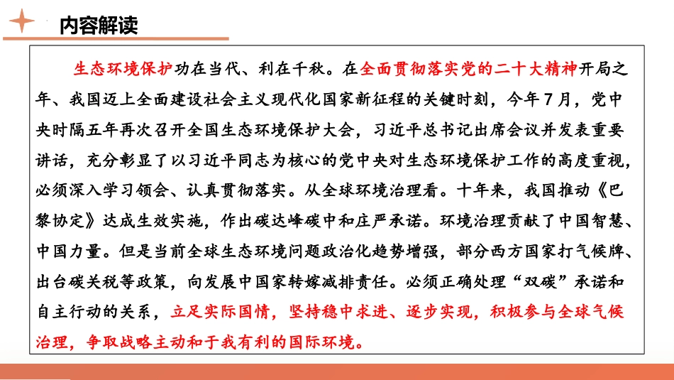 导师:XXX高考二轮复习讲练测2024高考热点六生态文明,美丽中国内容解读生态环境保护功在当代、利在千秋。在全面贯彻落实党的二十大精神开局之年、我国迈上全面建设社会主义现代化国家新征程的关键时刻,今年7月,党中央时隔五年再次召开全国生态环境保护大会,习近平总书记出席会议并发表重要讲话,充分彰显了以习近平同志为核心的党中央对生态环境保护工作的高度重视,必须深入学习领会、认真贯彻落实。从全球环境治理看。十年来,我国推动《巴黎协定》达成生效实施,作出碳达峰碳中和庄严承诺。环境治理贡献了中国智慧、中国力量。但是当前全球生态环境问题政治化趋势增强,部分西方国家打气候牌、出台碳关税等政策,向发展中国家转嫁减排责任。必须正确处理“双碳”承诺和自主行动的关系,立足实际国情,坚持稳中求进、逐步实现,积极参与全球气候治理,争取战略主动和于我有利的国际环境。一古代中国,敬天保民二近代中国,工业探索三世界工业,环境问题目录索引CONTENTS01古代中国敬天保民稿定PPT古代中国,敬天保民1、中国古代环境保护概况古代环境保护思想古代环境保护实践古代环境保护特点①总结出了二十四节气;并能够因地制宜,兴修水利,为农业发展创造条件;②《齐民要术》《农政全书》等总结性的农学著作;③儒家的“天人合一”思想;道家的“道法自然”思想。①先秦时期已懂得施用粪肥、草木灰和绿肥等;②魏晋南北朝时期黄河流域过度开垦导致的环境破坏状况有所缓解;③隋唐开通大运河,设专职官员管理水利事业,在各地兴修了不少水利工程。①合理利用、保护自然,不过度索取;顺应自然、尊重生命;②人与自然的和谐相处;③利用宗法力量;④历史悠久;立法保障;⑤因地制宜;奖惩结合;⑥与传统农业社会发展密切相关;⑦体现封建国家重视农业的思想;⑧提高土地利用率,解决人地矛盾;注重利用科技力量。1.(2022·湖南卷)汉武帝南征北伐,东巡西幸,奢靡无度,政府库告竭,遂用聚敛之臣,“至于卖爵、更币、算车船、租六畜、告缗、均输、盐铁、榷酤,凡可以佐用者一孔不遗,独于田租不敢增益”。武帝此举()A.体现以农为本B.服务于汉初战事C.意在藏富于民D.解决了财政危机2.(2021·辽宁卷)蠲免是中国古代朝廷根据地方民力对百姓应征赋税的免除。清朝的蠲免,除“偏灾赈蠲外,凡逋负(拖欠赋税)之在民者,与银谷食种之贷而未收者,遇国家庆典,或巡幸,或军兴,辄止勿责”。据此可知,蠲免政策旨在()A.减轻地方财政负担B.稳定地方社会秩序C.遏制地方官员贪腐D.提高民众生活水平根据“独于田租不敢增益”结合所学知识,可见汉代统治者视农业为国本,不敢增加田租是为了避免动摇国本汉武帝敛财不仅为了战事,还有满足巡幸和奢侈挥霍的原因汉武帝推行的各种政令,其本质的目的不是“藏富于民”,而是要充盈国库材料没有体现汉武帝的措施“解决了”财政危机A根据材料可知,蠲免是中国古代朝廷根据地方民力对百姓应征赋税的免除,清朝的蠲免政策有利于减轻人民负担,缓和阶级矛盾,稳定地方社会秩序,维护清王朝统治减轻地方财政负担与蠲免政策的宗旨不符材料没有涉及地方官员贪腐信息,而是强调蠲免政策旨在稳定地方社会秩序蠲免政策有利于减轻人民负担,不等于提高民众生活水平B02近代中国工业探索稿定PPT近代中国,工业探索1、中国近代工业化探索时期内容洋务运动创办了一批近代工业,刺激了中国近代民族资本主义的产生和发展,但没有使中国走上富强的道路,没有实现中国的工业化。甲午中日战争清政府放宽对民间办厂的限制,中国民族工业有了初步发展;辛亥革命推翻了封建帝制,鼓舞了民族资产阶级投资近代企业的热情,促进了民族工业的发展,迎来了民族工业的“短暂春天”;一战结束后,帝国主义卷土重来,中国民族工业走向萧条;抗日战争解放战争由于长期战乱,帝国主义的侵略和官僚资本主义的压榨,民族工业陷入绝境。稿定PPT,海量素材持续更新,上千款模板选择总有一款适合你022、中国现代工业化探索时期内容1949~1956年进行社会主义三大改造,实施“一五”计划,从而开始了新中国社会主义工业化的起步。1956~1966年我国社会主义建设...