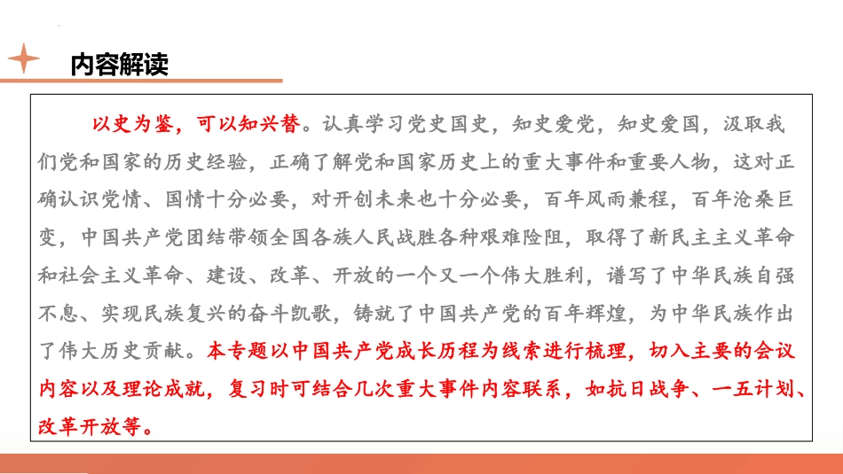 导师:XXX高考二轮复习讲练测2024高考热点一红色党史,逐梦征程内容解读以史为鉴,可以知兴替。认真学习党史国史,知史爱党,知史爱国,汲取我们党和国家的历史经验,正确了解党和国家历史上的重大事件和重要人物,这对正确认识党情、国情十分必要,对开创未来也十分必要,百年风雨兼程,百年沧桑巨变,中国共产党团结带领全国各族人民战胜各种艰难险阻,取得了新民主主义革命和社会主义革命、建设、改革、开放的一个又一个伟大胜利,谱写了中华民族自强不息、实现民族复兴的奋斗凯歌,铸就了中国共产党的百年辉煌,为中华民族作出了伟大历史贡献。本专题以中国共产党成长历程为线索进行梳理,切入主要的会议内容以及理论成就,复习时可结合几次重大事件内容联系,如抗日战争、一五计划、改革开放等。一开天辟地,革命时代二改天换地,建设时代三翻天覆地,改革时代四惊天动地,复兴时代目录索引CONTENTS01开天辟地革命时代稿定PPT革命时代1、中共一大、中共二大和中共三大(1921——1923)会议时间地点内容意义中共一大1921上海嘉兴确定了中国共产党这个名称,明确了党的奋斗目标是推翻资产阶级,建立无产阶级专政,实现社会主义和共产主义。中国历史上开天辟地的大事变。中国革命的面貌就焕然一新了。中共二大1922上海制定了党的最低纲领和最高纲领。其中最低纲领,即党在民主革命阶段的纲领,内容包括打倒军阀,推翻国际帝国主义的压迫,统一中国为真正的民主共和国。在中国历史上第一次提出了明确的反帝反封建的民主革命纲领。中共三大1923广州通过了关于国共合作问题的决议。促成第一次国共合作,揭开了席卷全国、轰轰烈烈大革命的序幕。021.(2023·全国甲卷)中国共产党在成立之初就注重增强阶级基础。中共一大在讨论今后的工作时,“决定集中我们的全部精力组织工厂工人……鉴于我们的党至今几乎完全由知识分子组成,所以代表大会决定要特别注意组织工人”。这反映出当时()A.革命统一战线建立B.民主革命纲领开始制定C.党的中心任务确立D.工农武装割据思想形成中共一大通过的《关于当前实际工作的决议》,确定党成立后的中心任务是组织工会和教育工人,领导工人运动,对党领导工人运动的任务、方针、政策和方法都提出了规定或要求1924年至1927年第一次国共合作建立了革命统一战线,进行了轰轰烈烈的国民大革命1922年中共制定了党的民主革命纲领,实现了最高纲领和最低纲领的统一在开辟井冈山革命根据地的实践中,毛泽东逐渐发展这种思想,形成了“工农武装割据”的思想,与材料时间不符C022.(2021·湖南卷)阅读材料,完成下列要求。材料1921年7月,13名代表出席中国共产党第一次全国代表大会,他们代表着全国50多名党员。共产国际代表马林和尼克尔斯基出席大会。下表为中共“一大”部分代表基本情况——据中共中央党史研究室《中国共产党历史》等编制(1)根据材料,归纳中共“一大”代表群体的特点。(2)根据材料并结合所学知识,分析这些代表走到一起的时代背景。姓名出生年份籍贯备注何叔衡1876湖南秀才,新民学会会员董必武1886湖北秀才,曾加入中国同盟会,曾留学日本李达1890湖南曾留学日本,《共产党》月刊主编李汉俊1890湖北曾留学日本毛泽东1893湖南师范毕业,新民学会组织者,《湘江评论》主编包惠僧1894湖北记者,北京大学肄业,陈独秀指定代表陈潭秋1896湖北师范毕业,武汉共产主义小组发起者之一王尽美1898山东师范毕业,在济南成立马克思学说研究会邓恩铭1901贵州中学生,在济南成立马克思学说研究会刘仁静1902湖北北京大学学生【答案】(1)代表多来自于南方,特别是两湖地区;都是知识分子,多是青年知识分子;都初步具有马克思主义理论;对马克思主义的信仰程度有差别。(2)中国逐步沦为半殖民半封建社会的深渊,民族危机空前严重;旧民主主义失败,中国革命呼唤新的阶级和政党;民族资本主义快速发展,无产阶级力量壮大登上历史舞台;新文化运动解放了人们的思想,五四运动后,马克思主义的传播成为新文化运动的主流。从中共“一大”代表的“籍贯”可知,他们多来自于南方,特别是两湖地区;根据表格展示的中共一大代表的“出生年份”和...