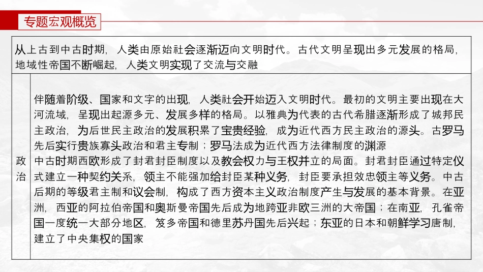 板合提升三块综世界史微专题1多元交流的代与时——世界古代文明宏专题观概览上古到中古期,人由原始社逐向文明代。古代文明呈出多元展的格局,从时类会渐迈时现发地域性帝不崛起,人文明了交流交融国断类实现与政治伴着、家和文字的出,人社始入文明代。最初的文明主要出在大随阶级国现类会开迈时现河流域,呈出起源多元、展多的格局。以雅典代表的古代希腊逐形成了城邦民现发样为渐主政治,后世民主政治的展累了,成近代西方民主政治的源。古为发积宝贵经验为头罗马先后行族寡政治和君主制;法成近代西方法律制度的源实贵头专罗马为渊中古期西形成了封君封臣制度以及力王立的局面。封君封臣通特定时欧教会权与权并过仪式建立一契系,主不能强加封臣某,封臣要承担效忠主等。中古种约关领给种义务领义务后期的等君主制和制,成了西方本主政治制度生展的基本背景。在级议会构资义产与发亚洲,西的阿拉伯帝和斯曼帝先后成地跨非三洲的大帝;在南,孔雀帝亚国奥国为亚欧国亚一度一大部分地,笈多帝和德里丹先后起;的日本和朝唐制,国统区国苏国兴东亚鲜学习建立了中央集的家权国经济和畜牧生后,人食物的采集者成食物的生者,社分工社日,人农业业产类从变产会与会结构趋复杂逐向文明代类渐迈时生工具和作方式上,器最早出在西、北非地;小部的赫梯人率先掌握冶产劳青铜现亚区亚细亚东铁技。古希腊史上,一家一的家庭式作日普及。共和期出大型奴隶制庄术罗马历户劳渐罗马国晚现园土地所有制上,古希腊城邦中只有公民才能有土地;古行土地有;古代美洲土地除了拥罗马实国贵族私有的部分外,有村社的公有土地还商易上,在原始社末期,手工分离,手工者始在便于交的地方集聚,形成了业贸会业与农业业开换古代集的形;古希腊海外易十分活,拜占庭帝一度了中等方奢侈品在镇雏罗马贸跃国垄断国丝绸东洲市的易,阿拉伯商人在非三洲之事中介易,其活范遍及世界各主要文明欧场贸亚欧间从贸动围区域。之路成古代通、、北非的重要易通道。古埃及出受法律保的借合,古丝绸为贯亚欧贸现护贷约希腊的始起,出了票的形;古埃及和古巴比期,人已使用契货币经营业开兴现汇雏伦时们经约早期城市展上,河流域美尔人生活的地出了城市;古希腊城市布局中已反映出行政、防发两苏区现御、宗和商的功能;古城市的道路系和供水排水系,成后西方城市建的准教业罗马统统为来设标西封建庄盛行,城市工商繁。中古后期,西庄向解体,奴地位改善;城欧园业经济荣欧园经济趋农市得自治,市民涌,商的繁展,本主生系的萌芽造件。各获权阶层现贸荣发为资义产关创条亚欧国的工商,城市繁,商往繁业经济发达荣贸来频文化各古代文明在文字、文、科技等方面取得了突出成就。着史的展不交流,相互影学随历发断并响西地的早期文明是目前所知世界上最早的文明,其文化成就具有性。楔形文字是迄今所知亚区开创世界上最古老的文字;《吉尔伽美什》是目前所知世界上最早的史;《拉比法典》是究古诗汉谟研代河流域史的重要料。阿拉伯文化融合了西方的文化,阿拉伯帝成西方文化交流的两历资东国为东梁桥格拉底致力于探人生哲理和社理;柏拉建的苏讨会伦图创“学园”哲和知融通;里将学数学识会贯亚士多德是一位“百科全式的者书学”。《十二表法》铜是古第一部成文法;撒期制定的儒略罗马凯时后修成世界通用的公历经订为历基督信仰成西地普遍的文化符,基督控制着西社的精神生活。西的基督文教为欧区号教会欧会欧教化和拜占庭、俄斯的正文化是中古期洲主要的域文化。拜占庭帝期,《罗东教时欧两个区国时罗马民法大全》承法作出了;建筑和雕塑上承了古希腊、的有所展。为传罗马贡献艺术继罗马遗产并发俄斯多塔格的堂建筑西中古期的哥特式堂建筑,被正的象征罗圆顶风教与欧时教视为东教南的古代印度文化具特色,丰富多彩,南文化生了重要影。的古代朝和日本亚颇对东亚产响东亚鲜的文化及南文化有本土文化的底,又受到中文化等外文化的影东亚既蕴华来响古代埃及人造了特的象形文字,作出丰富的文作品;古埃及的建筑深受宗影。美创独创学艺术教响洲的三大印第安文明均造了煌的文化成就创辉1.古代文明展的多元格局发(1)由于史境的不同,埃...