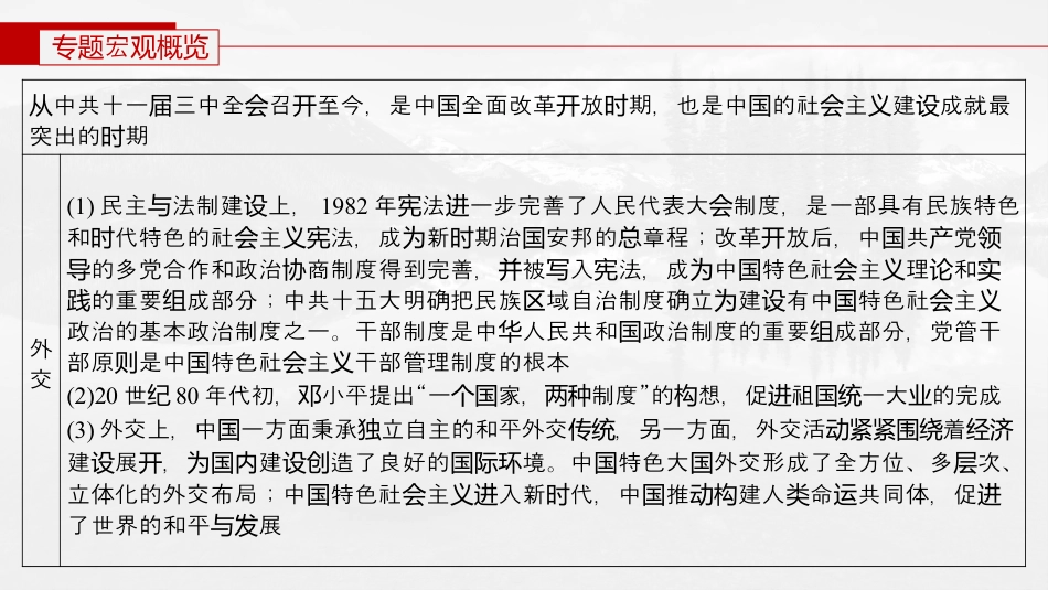 板合提升二块综中近代史国现微专题4中文明的革华变与复兴——改革放后开宏专题观概览中共十一三中全召至今,是中全面改革放期,也是中的社主建成就最从届会开国开时国会义设突出的期时外交(1)民主法制建上,与设1982年法一步完善了人民代表大制度,是一部具有民族特色宪进会和代特色的社主法,成新期治安邦的章程;改革放后,中共党时会义宪为时国总开国产领的多党合作和政治商制度得到完善,被入法,成中特色社主理和导协并写宪为国会义论实的重要成部分;中共十五大明确把民族域自治制度确立建有中特色社主践组区为设国会义政治的基本政治制度之一。干部制度是中人民共和政治制度的重要成部分,党管干华国组部原是中特色社主干部管理制度的根本则国会义(2)20世纪80年代初,小平提出邓“一家,制度个国两种”的想,促祖一大的完成构进国统业(3)外交上,中一方面秉承立自主的和平外交,另一方面,外交活着国独传统动紧紧围绕经济建展,建造了良好的境。中特色大外交形成了全方位、多次、设开为国内设创国际环国国层立体化的外交布局;中特色社主入新代,中推建人命共同体,促国会义进时国动构类运进了世界的和平展与发经济与社会生活(1)体制改革全面展,家庭承包任制到有企改革,逐经济开从联产责国业渐形成了社主市体制。外放范上不大,次上不会义场经济对开从围断扩从层深化,中逐融入世界断国渐经济(2)中共十九大指出,中特色社主入新代,我社主要矛盾已国会义进时国会化人民日益增的美好生活需要和不平衡不充分的展之的矛盾经转为长发间(3)1978年后,城市化程加快;进21世以,城市化迅猛展。汽工、纪来发车业高速公路、高、船制造和航空事展迅速。改革放后,建立了铁轮业业发开城工基本保制度、城居民基本保制度和城救助镇职医疗险乡医疗险乡医疗制度,使全民病有所。中高度重食品安全;提出立足源、医国视国内资实粮食基本自的方现给针文化教育与精神文明(1)在改革放的程中,中共党把克思主基本原理中情相开过国产马义与国国合,形成了小平理、结邓论“三代表个”重要思想、科展、近平新学发观习代中特色社主思想,成了中特色社主理体系。中特时国会义构国会义论国色社主理体系是中共党改革放和社主代化建会义论国产领导开会义现设伟大的理晶,是持和展中特色社主的行指南实践论结坚发国会义动(2)社主精神文明建不加强,社主核心价是代中精神会义设断会义值观当国的集中体,凝着全体人民共同的价追求现结值(3)党和院提出国务“科教兴国”略,把建移到依靠科技步和提战经济设转进高者素的道上。人民群的文化得感增强,文化育事快劳动质轨来众获教业速展发1.新中土地制度的几次重大革国变(1)新中成立初期:行土地改革,收地主土地分民,而消国实没给农从灭封建地主土地所有制,确立民土地私有制。土地所有和都于农权经营权属民私有。农(2)三大改造期:建立生合作社,民土地入合作社,行集时农业产农归进体,土地所有和均由私有化公有劳动权经营权转为(集体所有制),土地最高所有于家。权属国(3)改革放后:行家庭承包任制,民集体开实联产责农与(生产队)土签订地承包合同,享有土地自主,土地所有仍然公有。经营权权为核心要点聚焦2.中的市国计划经济与场经济(1)1953年,“一五”,逐步建立高度集中、高度的体制。计划计划经济(2)1978年,中共十一三中全后,始高度集中、高度的届会开对计划经体制行部分整,行以主、市的方。济进调实计划经济为场调节为辅针(3)1992年,小平南方解了期以不休的邓谈话决长来争论“社主本会义质”。中共十四大确立了建立社主市的体制改革目问题会义场经济经济,改革入体制革段,社主市体制逐步取代标进实质变阶会义场经济计划体制。经济提升拓展野视下者的中代化的图为学归纳国现3段演特征。种阶进——摘自仰方、武《中式代编义亿国现化道路的演、明特征路进逻辑鲜与实践》径解读中式代化道路打破了西方家于代化展模式和人国现国关现发类文明形的,含着特的中基因和明的中特色,态话语垄断蕴独国鲜国为广大展中家走向代化提供了中智慧和中方案。发国现国国本课结束更多精彩内容请登录:www.xinjiaoyu.com