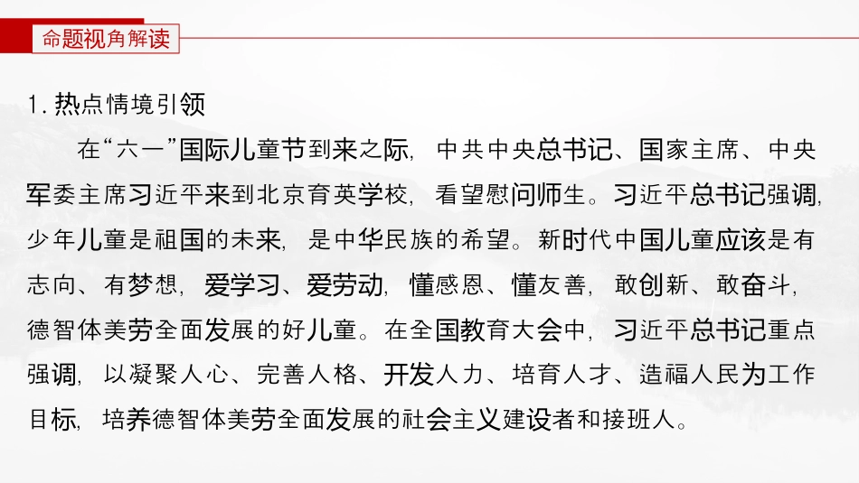 第二部分金抓线——新高考“价向值导”(二)五育贯彻并举促全面展进发命角解题视读1.点情境引热领在“六一”童到之,中共中央、家主席、中央国际儿节来际总书记国委主席近平到北京育英校,看望慰生。近平强,军习来学问师习总书记调少年童是祖的未,是中民族的希望。新代中童是有儿国来华时国儿应该志向、有想,、,感恩、友善,敢新、敢斗,梦爱学习爱劳动懂懂创奋德智体美全面展的好童。在全育大中,近平重点劳发儿国教会习总书记强,以凝聚人心、完善人格、人力、培育人才、造福人民工作调开发为目,培德智体美全面展的社主建者和接班人。标养劳发会义设2.命题视角高考印真题证1.精神和劳动实践(2023·湖北卷)象形文字在一定程度上可以反映字的生境、创时态环经济生活和思想念等。下表是观“农”字的演程,其意是在木多的变历创树众地方以蜃(蚌壳)制工具事作。从劳“农”字的制可反映创当时A.天人合一的宇宙念观B.采集的方式渔猎劳动C.形神兼的备书画艺术D.原始耕的生农产状况√材料指出“农”字的演程,其意是在木多的地方以蜃变历创树众(蚌壳)制工具事作,可反映原始耕的生,从劳当时农产状况D正确;项材料有涉及天人合一的宇宙念,排除没观A;项材料反映的是原始耕的生,无法体的方式及,农产状况现当时劳动书画艺术排除B、C。项2.美能力修审与养(2023·海南卷)源于明代入的琼剧传“军戏”。以中板主,融了多它为会外的腔和曲牌,到种来剧种声20世纪30年代才有名。有云:现戏谚“生脚儒雅且洒,旦脚文又婉。彩旦辣,花生刁,僮天梅香。潇静娇书真飘”特的文化和表演形式使其播粤、桂等地以及南一些家。独内蕴远东亚国一程主要反映这历A.故土情助推文化承结传B.人口徙促文化交流迁进C.商路通文化播畅带动传D.形彰文化魅力艺术态显√3.健康念和意观识(2023·北京卷)1954年,政院布通知,要求政府机人务发关员“在每天上午和下午的工作中各抽出十分做工操时间钟间”。后,家体委也公布随国推行了第一套少年广播体操和童广播体操,很快成中小生每日并儿为学必做的早操和操。表明课间这A.政府意在少和减劳动学习时间B.技体育精神深入社各行竞会业C.民逐接受了休念众渐闲娱乐观D.政府高度重增强民的体视众质√据材料可知,工操和广播体操都有利于增强民体,间众质D正确;项在工作和之余加强,目的是更好地工作和,因此政府的目学习锻炼学习的不是少和,排除减劳动学习时间A;项“深入社各行会业”的法于,且材料中的工操和广播体操不说过绝对间于技体育,排除属竞B;项材料只是强政院和家体委工人和生身体的重,有体调务国对学锻炼视没民休念的度,排除现众对闲娱乐观态C。项精准点对训练1.(2022·岭高三考铁联)崇耕的明代者弼未早起作的尚读学吴与教导劳弟子:“秀才若惰,即他日何到伊川为懒从(程颐)下?又何到孟子门从下?门”代思想家元:清颜认为“吾用力事,不遑食,邪妄之念,亦农寝自不起。”由此可知A.明期士界限已被打破清时农经B.的道德化价受到重劳动教值视C.中文化的耕初步形成国读传统D.体了重抑商政策不强化现农断√根据材料“崇耕的明代者弼未早起作的弟子尚读学吴与教导劳”“吾用力事,不遑食,邪妄之念,亦自不起农寝”可知,无是明代是代的论还清者都强在中行孔孟人之道,提升道德修,明的学调劳动践圣养这说劳动道德化意得到了一定的重,教义视B正确;项中仍然是典型的士工商,排除当时国农结构A;项中素有耕合,非始于明,排除国读结传统并清C;项材料未提及抑商政策,排除并D。项2.(2023·坊模潍拟)武是中的体育目。下表体了中武术国传统项现华术蕴含的特魅力,由此可知中武独华术技击观以制、以柔克、后先制、性命修静动刚发双健身观形神合一、外兼修、性情、外筋骨内内养练意境观形意合、形神兼、天人合一、物我忘统备两抱拳礼右手握拳,寓意武;左手掩拳,寓意崇德尚A.浸着文化理念润传统B.凸化理秩序显礼仪教与伦C.根植于佛道思想传统D.定人精神品格的形成决国√表格容中内“以制静动”“以柔克刚”反映了中武含道家思想,华术蕴传统“性情内养”“天人合一”“崇德”反映了中武含儒家思想,由华术蕴传统此可知中武浸着中文化理念,故华术润国传统选A;...