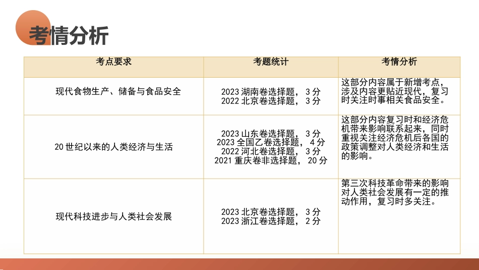 第46讲现代世界的食物生产经济生活与科技进步高考一轮复习讲练测2024选必二纲要下第19课资本主义国家新变化第20课社会主义国家的发展与变化第3课现代食物的生产、储备和食品安全第6课现代科技进步与人类社会发展第9课20世纪以来人类的经济与生活教材融合稿定PPT稿定PPT,海量素材持续更新,上千款模板有选择总一款适合你02考情分析考点要求考题统计考情分析现代食物生产、储备与食品安全2023湖南卷选择题,3分2022北京卷选择题,3分这部分内容属于新增考点,涉及内容更贴近现代,复习时关注时事相关食品安全。20世纪以来的人类经济与生活2023山东卷选择题,3分2023全国乙卷选择题,4分2022河北卷选择题,3分2021重庆卷非选择题,20分这部分内容复习时和经济危机带来影响联系起来,同时重视关注经济危机后各国的政策调整对人类经济和生活的影响。现代科技进步与人类社会发展2023北京卷选择题,3分2023浙江卷选择题,2分第三次科技革命带来的影响对人类社会发展有一定的推动作用,复习时多关注。考点一现代食物生产、储备与食品安全(选必二)【夯基·知识梳理】知识点1食物生产的现代化知识点2食物储备技术的进步知识点3消除饥饿与食品安全【提升·考向预测】考向1现代食物生产、储备与食品安全01复习目标02网络构建03梳理预测考点二现代世界的经济生活(选必二)【夯基·知识梳理】知识点1世界经济的发展知识点2国际贸易与人类生活知识点3国际金融与人类生活【提升·考向预测】考向120世纪以来的人类经济与生活目录索引CONTENTS04真题感悟考点三现代科技进步与人类社会发展(选必二)【夯基·知识梳理】知识点1现代科学技术的发展知识点2现代科技进步的革命性意义【提升·考向预测】考向1现代科技进步与人类社会发展01复习目标PARTONE稿定PPT稿定PPT,海量素材持续更新,上千款模板有选择总一款适合你021、了解现代农业、渔业发展过程中,人类在食物生产、储备方面的进步,认识消除饥饿和食品安全在人类历史上的重大意义。2、了解国际贸易变化的主要原因和表现,分析对人类生活的影响。3、认识人工智能技术对人类劳作方式及生活方式的影响;理解劳动人民对历史的推动作用,以及生产方式的变革对人类社会发展所具有的革命性意义。复习目标02网络构建PARTONE02网络构建03梳理预测PARTONE稿定PPT夯基·知识梳理考点一现代食物生产、储备与食品安全(选必二)知识点1食物生产的现代化1.传统农业向现代农业转变(1)背景:①工业革命后,资本主义机器生产推动着传统农业向现代农业转变。②20世纪中叶,欧美各国完成了农业机械化,建立起高度集约的现代农业。(2)实现:①一大批优良品种育成推广,优质高效化肥广泛应用。②以高科技为基础的设施农业有了突破性进展,农作物单位面积产量及禽畜的生产量大幅增长。稿定PPT稿定PPT,海量素材持续更新,上千款模板有选择总一款适合你02③大型农场、养殖场成为现代农业主要生产经营模式。2.农业科技的发展(1)农业机械化①前提:20世纪以来,汽油拖拉机、柴油拖拉机相继批量生产,为农业机械的广泛使用创造了条件。②机械:用大功率拖拉机牵引的铧式犁、播种机、联合收割机等,大大提高了工作效率。③特征:美国农业机械以大型为主,法国以中型为主,日本以小型为主,中国是大、中、小型结合。④意义:推动着农作物的播种、收割与加工等从人工化向自动化转变。稿定PPT02(2)育种技术①1930年,美国培育出玉米新品种,平均亩产增至350千克。②1941年,墨西哥培育出小麦新品种,亩产提高到250千克。③20世纪60年代,菲律宾培育出亩产600-650千克的杂交水稻在东南亚推广。④20世纪60年代以来,中国的杂交水稻制种技术也不断取得突破,2014年,“中国超级杂交水稻”平均亩产突破1000千克,创世界纪录。⑤影响:提高了粮食作物的单位面积产量,为人类消除饥饿作出了突出贡献。(3)养殖、畜牧业①养殖业:养殖场和牧场的各个生产环节,从给料、给水到产品收集、包装、运输都实现了机械化和自动控制。②渔业:现代科学技术用于海洋捕捞,渔船、网具等日趋现代化;水产养殖向工厂化、机械化、集约化经营发展。稿定PPT稿定PPT,海量素材持续更新,...