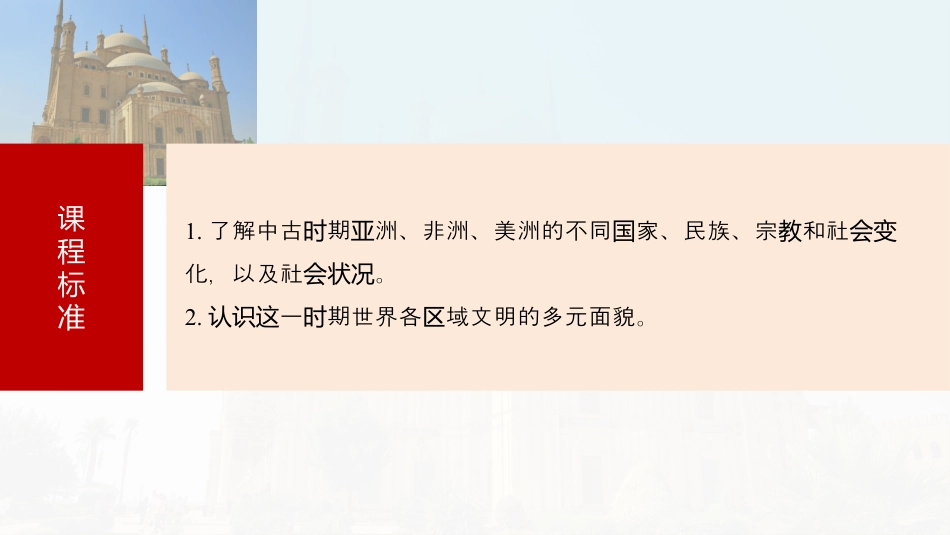 第十一单元世界古代史:古代文明的生展和中古期的世产与发时界中古期的洲、非洲和美洲时亚第31讲课程标准1.了解中古期洲、非洲、美洲的不同家、民族、宗和社时亚国教会变化,以及社。会状况2.一期世界各域文明的多元面貌。认识这时区考情分析1.率型:部分是高考低考点,主要以主频题该频选择题为2.情境:多利用文字、片等多形式新情境,注重培生取和设计图种创设学习养学获解史信息的能力。如读历(2023·湖南卷,12)日本土地制度;(2023·海南卷,10)非洲文化法律的影;传统对响(2023·6月浙江考,选11)阿特克文明;兹(2023·1月浙江考,选11)美洲印第安文化成就;(2021·福建卷,12)阿拉伯文化3.核心考向:阿拉伯帝在西方文化交流中的梁作用,斯曼帝西方国东桥奥国对东贸易的影以及美洲印第安文明成就响整体感知内容导航一梳理必备知识二突破关键能力三链接高考热点四课时精练梳理必知备识落基性实础1.阿拉伯帝国(1)建立与扩张知识点一中古时期的亚洲(2)帝治国统政治最高治者哈里掌握政治、事和宗大,下各部大臣统发军教权设助辅经济①工商:繁,手工和商得到很大展业经济荣业业发②易:在到、西到西、南至非洲的广大地事着贸东东亚欧区从上和海上易陆贸③城市:帝境城市繁多,巴格是世界上最大的城市国内达当时之一(3)帝文化国①成就:吸收了被征服地的文化,广泛翻古代波斯、印度、希腊和区译的文,融合西方文化,在多域取得重要成就。罗马献东诸领②地位:阿拉伯商人和旅行家西方文化交流的梁。东桥③影:中的造、印度的字等先后阿拉伯人入洲,促响国纸术数经传欧进了西文化的展。欧发2.斯曼帝的起奥国兴(1)起兴与扩张(2)帝治国统政治最高治者是丹,宗上和封建主是治统苏教层统阶级经济①15—16世,首都伊斯坦布尔成西方文化交流中心纪为东经济②控制了接的商路,往商品征收重,影西方连亚欧对过税响东之的易间贸3.南的家亚与东亚国(1)南家亚国①笈多帝:国4世初,恒河中游起,几乎征服了北印度,帝政局纪兴国定,但政令不一;印度展印度的主要宗。稳够统教发为教②德里丹:苏国13世初建立,丹最高治者,地方分行省,纪苏为统划为行省督由丹任命,重要位由穆斯林担任。总苏职(2)家东亚国①日本②朝鲜新一罗统7世末,初步一朝半,模仿中建立中央集家纪统鲜岛国权国高王朝丽10世初,新人王建仿效中唐朝制度建立高王朝纪罗国丽朝建立鲜14世末,高大李成桂自立王,都城,改纪丽将为迁汉国号朝为鲜抗侵略击16世末,面日本侵略,明朝派赴朝作。明朝纪对军队鲜战大子、朝大李舜臣先后牲将邓龙鲜将牺1.思考·情境问题君士坦丁堡陷落之后,奥斯曼人对君士坦丁堡进行劫掠,三天后,苏丹穆罕默德用重惩威吓的办法,禁止继续抢劫和屠杀。结合所学知识,指出君士坦丁堡战役的结果和危害。答案结果:君士坦丁堡被奧斯曼帝国攻陷,拜占庭帝国灭亡。危害:君士坦丁堡城中的人民遭受很大伤害;城中建筑物遭到重大破坏。2.阐释·核心概念印度教随着印度封建社会形成,种姓制度发生新变化而出现的。印度教广泛吸收婆罗门教、佛教和耆那教教义以及民间信仰、风俗习惯、哲学思想等,把种姓制度作为核心教义,要求教徒严格遵守种姓制度。3.挖掘·教材信息阅读教材“问题探究”栏目,谈谈你对坂本太郎观念的看法,并说明理由。答案这段材料较为全面客观地评价了日本幕府统治时期的锁国政策。日本实行锁国政策在客观上加强了幕府统治,保持了国内和平,同时使国内经济得到发展,使日本文化得以昌盛,但锁国政策也使日本脱离了世界发展大势,日益变得落后,最终导致日本成为被侵略的对象。4.思考·情境问题唐朝与新罗保持了长期、频繁的友好往来。结合所学,简述高丽王朝仿效唐朝制度的表现。答案在中央设置三省六部,将地方划分为十道,推行土地国有,引入科举考试选拔官员,中国的儒家经典和辞章之学广为传播。1.古代非洲文明(1)班人图知识点二古代非洲与美洲贡献培育高粱、西瓜和棉花等重要作物,了牛,引了甜农驯养进羊和山羊等,掌握了冶技绵铁术活域动区西非展到撒哈拉沙漠以南地,从扩区11世,成地的纪为当主要居民,促、畜牧和冶技的播进农业业铁术传(2)古代非洲文明域区北非东公元前后,阿克姆王...