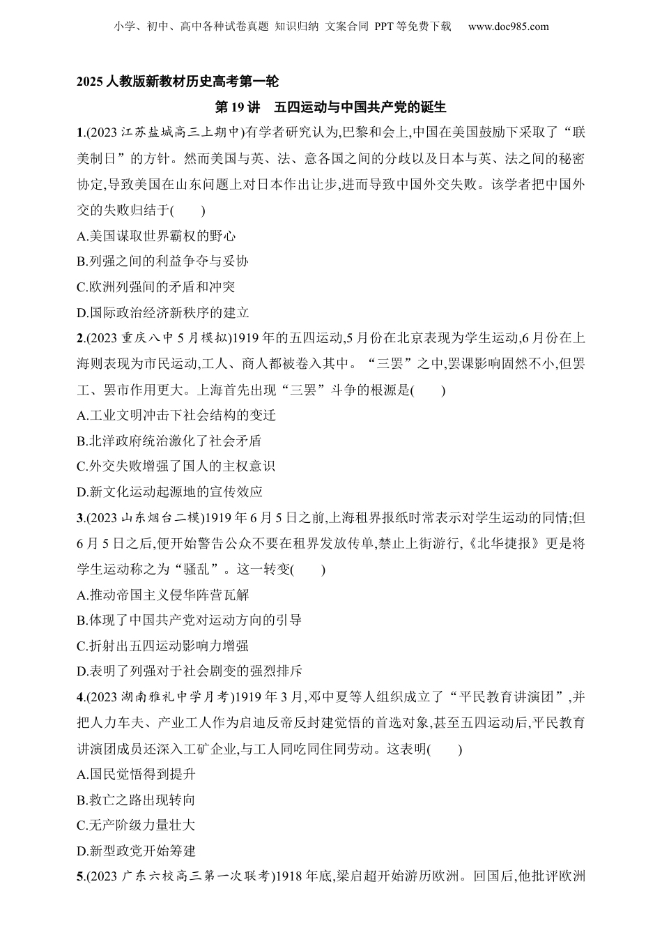 小学、初中、高中各种试卷真题知识归纳文案合同PPT等免费下载www.doc985.com2025人教版新教材历史高考第一轮第19讲五四运动与中国共产党的诞生1.(2023江苏盐城高三上期中)有学者研究认为,巴黎和会上,中国在美国鼓励下采取了“联美制日”的方针。然而美国与英、法、意各国之间的分歧以及日本与英、法之间的秘密协定,导致美国在山东问题上对日本作出让步,进而导致中国外交失败。该学者把中国外交的失败归结于()A.美国谋取世界霸权的野心B.列强之间的利益争夺与妥协C.欧洲列强间的矛盾和冲突D.国际政治经济新秩序的建立2.(2023重庆八中5月模拟)1919年的五四运动,5月份在北京表现为学生运动,6月份在上海则表现为市民运动,工人、商人都被卷入其中。“三罢”之中,罢课影响固然不小,但罢工、罢市作用更大。上海首先出现“三罢”斗争的根源是()A.工业文明冲击下社会结构的变迁B.北洋政府统治激化了社会矛盾C.外交失败增强了国人的主权意识D.新文化运动起源地的宣传效应3.(2023山东烟台二模)1919年6月5日之前,上海租界报纸时常表示对学生运动的同情;但6月5日之后,便开始警告公众不要在租界发放传单,禁止上街游行,《北华捷报》更是将学生运动称之为“骚乱”。这一转变()A.推动帝国主义侵华阵营瓦解B.体现了中国共产党对运动方向的引导C.折射出五四运动影响力增强D.表明了列强对于社会剧变的强烈排斥4.(2023湖南雅礼中学月考)1919年3月,邓中夏等人组织成立了“平民教育讲演团”,并把人力车夫、产业工人作为启迪反帝反封建觉悟的首选对象,甚至五四运动后,平民教育讲演团成员还深入工矿企业,与工人同吃同住同劳动。这表明()A.国民觉悟得到提升B.救亡之路出现转向C.无产阶级力量壮大D.新型政党开始筹建5.(2023广东六校高三第一次联考)1918年底,梁启超开始游历欧洲。回国后,他批评欧洲小学、初中、高中各种试卷真题知识归纳文案合同PPT等免费下载www.doc985.com资本主义“乃系一种不自然之状态,并非合理之组织,现在虽十分发达,然已将趋末路,且其积重难返,不能挽救,势必破裂”。梁启超的反思()A.促使中国知识界全面回归传统文化B.反映了知识分子逐渐认同苏俄革命C.率领知识界开始抵制西方文化入侵D.客观上有利于马克思主义的传播6.(2023海南六模)1919年6月,宪法学家张慰慈在《每周评论》上第一次比较完整地介绍了苏俄新宪法。苏俄宪法首个完整中译本是刊载于1919年《解放与改造》第1卷中。此后,解释和评论苏俄宪法的文本如雨后春笋。这一现象()A.导致新文化运动方向发生变化B.说明马克思主义得到广泛传播C.促进了近代中国法律制度变革D.开启了社会主义法治观念启蒙7.(2023重庆八中5月模拟)《共产党》月刊创刊于俄国十月革命三周年纪念日,共出6期,在全国秘密发行。在创刊号的《短言》中,陈独秀明确提出“跟着俄国共产党”“经济的改造自然占人类改造之主要地位。吾人生产方法除资本主义及社会主义外,别无他途”。该月刊在当时所起到的实际作用是()A.推动马克思主义与工人运动相结合B.对建党工作起到了重要的指导作用C.促使中国共产党早期组织开始成立D.使得思想界认清了欧美的社会制度8.(2023浙江宁波高三选考)中共一大是在秘密状态下召开的,因此关于它的召开日期众说纷纭:“一大”的亲历者有的说是6月底,有的则说是7月底。抗战时期,中国共产党将党的纪念日定为每年的7月1日。有学者查阅了相关的苏联档案、当事人的回忆录以及当时的报刊杂志等多种史料,考证出中共一大召开于1921年7月23日。这一结论被学术界和中共所认同。对此解读最准确的是()A.历史带有主观色彩,原无真相可言B.历史解释应该允许而且提倡多元化C.历史研究应该对多种史料进行考辨分析D.历史研究只有结合亲历者的结论才可信9.(2023辽宁沈阳高三上期中)1922年,中共二大将无产阶级置于“帮助”“援助”“扶助”的地位。1925年,中共四大指出,无产阶级的政党应该指导无产阶级参加民族运动,不小学、初中、高中各种试卷真题知识归纳文案合同PPT等免费下载www.doc985.com是附属资产阶级而参加,乃以自己阶级独立的地位与目的而参加,并且取得领导的地位,才能够得到胜利。这表明中国共产党()A.完善工农武装割据革命理论B.忽视了国内民族资产阶级...