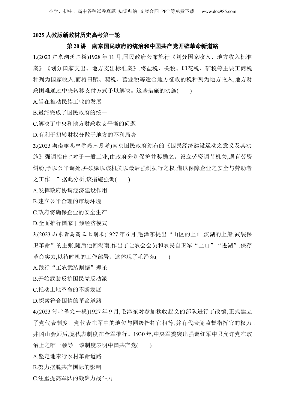 小学、初中、高中各种试卷真题知识归纳文案合同PPT等免费下载www.doc985.com2025人教版新教材历史高考第一轮第20讲南京国民政府的统治和中国共产党开辟革命新道路1.(2023广东潮州二模)1928年11月,国民政府公布施行《划分国家收入、地方收入标准案》《划分国家支出、地方支出标准案》,将盐税、关税、印花税、矿税等主要工商税种列为国家收入,而将田赋、契税、营业税等适合地方征收的税种列为地方收入,地方财政困难通过中央转移支付方式予以解决。这些措施的实施()A.旨在推动民族工业的发展B.最终完成了国民政府的统一C.解决了中央和地方财政收支平衡的问题D.有利于扭转财权分散于地方的不利局势2.(2023湖南雅礼中学高三月考)南京国民政府颁布的《国民经济建设运动之意义及其实施》强调指出:“对于一般工业,由政府分别保护并奖励之。设立劳资调节机关,遇有劳资纠纷,予以公平调处,并须赋以该机关以最后强制执行之权,借以保障企业之安全与劳动者之工作。”据此分析,该措施强调()A.发挥政府协调经济建设作用B.建立公平合理的市场环境C.政府将确保企业的安全生产D.全面推行国家干预经济模式3.(2023山东青岛高三上期末)1927年6月,毛泽东提出“山区的上山,滨湖的上船,武装保卫革命”的主张,随后他回湖南,作出了让农会会员和农民自卫军“上山”“进湖”,保存革命实力,以待时机的工作部署。这体现了毛泽东()A.践行“工农武装割据”理论B.开始武装反抗国民党反动派C.推动土地革命的不断发展D.探索符合国情的革命道路4.(2023河北保定一模)1927年9月,毛泽东对参加秋收起义的部队进行了改编,正式建立了党代表制度。党代表在军中的地位与同级指挥官相等,并有代表党监督指挥官的权力。井冈山会师后,党代表制度在全军推行。1930年,中央军委突出强调红军中只允许党在政治上之唯一领导。该制度表明中国共产党()A.坚定地奉行农村革命道路B.努力摆脱共产国际的影响C.注重提高军队的凝聚力战斗力小学、初中、高中各种试卷真题知识归纳文案合同PPT等免费下载www.doc985.comD.为红军实现顺利转移创造条件5.(2023山东聊城三模)1930年5月,毛泽东在赣南寻邬县进行了周密的社会调查,写成《寻邬调查》,此后又发表了《兴国调查》《东塘等处调查》《木口村调查》《赣西南土地分配情形》《江西土地斗争中的错误》《分田后的富农问题》等著作。上述调查及相关著作()A.提高了农民的生产积极性B.有利于土地革命的开展C.推动了井冈山根据地建立D.贯彻了八七会议的精神6.(2023浙江东阳5月模拟)1928年12月,湘赣边区政府总结土地斗争经验,颁布实施《井冈山土地法》。1929年4月,毛泽东主持制定的《兴国土地法》,对《井冈山土地法》作了重要更正,把“没收一切土地”改为“没收公共土地及地主阶级土地”。湘赣边区土地法的调整()A.体现了红色政权灵活的革命政策B.开启“工农武装割据”道路的序幕C.出于粉碎国民党“围剿”红军的需要D.意在扩大国民革命统一战线的基础7.(2023重庆八中月考)1929年12月,红军第四军党的第九次代表大会在福建古田召开,会议指出:“中国的红军是一个执行革命的政治任务的武装集团……除了打仗消灭敌人军事力量外,还要负担宣传群众、组织群众、武装群众、帮助群众建立革命政权以至于建立共产党的组织等项重大的任务。”这一决议()A.全面纠正了党内的“左”倾错误B.推动了中国的革命形势向前发展C.实现了党工作重心的第一次转移D.是对国民党大力“围剿”的回击8.(2023河北衡水二模)1931年6月,闽西苏维埃政府颁布《重新分配土地的条例》,改变单纯按照人口分配的做法,提出在给贫农、雇农与中农分田时,要分等级分配,劳动力强大者,可酌量增加田地;富农一岁至十五岁及六十一岁以上者不分土地,其余年龄者分足成。该条例的颁布有利于()A.巩固中华苏维埃共和国B.提高富农的革命热情C.实现“平均地权”的理想小学、初中、高中各种试卷真题知识归纳文案合同PPT等免费下载www.doc985.comD.维护贫苦农民的利益9.(2023福建三模)1929年11月,福建才溪苏区发动群众投资入股,建起了中央苏区第一个集体所有制性质的消费合作社——才溪区消费合作社。1931年,才溪创设了劳动合作社,成立社员代表大会,选举产生劳动合作社委员...