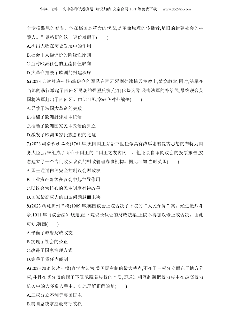 小学、初中、高中各种试卷真题知识归纳文案合同PPT等免费下载www.doc985.com2025人教版新教材历史高考第一轮第31讲资产阶级革命与资本主义制度的确立1.(2023江苏苏州二模)有学者这样评价西方近代历史上的某一事件:这场革命的爆发是因为清教和王国的法律、自由受到威胁,它是实用主义和理性主义相结合的产物,它建立起的“平衡”维持了若干年之久。这场革命()A.推动国家权力中心转移B.揭开了宗教改革的序幕C.促使民主共和政体建立D.强化了民族国家的意识2.(2023北京丰台一模)1777年,法国开始资助美国进行独立战争,但美国独立后,英国仍是美国的最大贸易伙伴,法国的经济却瘫痪了。平民的活路被切断了,只有起义。据此可知,法国对美国独立战争的资助导致了()A.法国爆发大革命B.美国取得独立战争的胜利C.平民生活的艰难D.英国成为最终的获利者3.(2023天津和平二模)马克垚主编的《世界文明史》认为,18世纪末的法国大革命从许多方面来看都是美国革命的一个直接后果,但它要解决的问题却不同美国革命,而和一个半世纪以前的英国革命如出一辙。英法革命所要解决的不同于美国革命的问题是()A.为资本主义的发展扫除障碍B.废除封建君主专制制度C.建立近代资本主义政治制度D.建立资本主义世界市场4.(2023河北保定一模)拿破仑·波拿巴上台后,对当时已失去反抗能力的雅各宾派残余分子采取高压政策。而对真正构成主要危险的王党势力,他严令枪决一切手持武器的或煽动叛乱的人。同时,他发布命令允许逃亡者回国,并从回国者中任命了一批官员。其做法()A.旨在消除不同阶层的政见分歧B.迟滞了法国工业革命进程C.符合巩固法国大革命成果的需要D.实际废除了本国封建制度5.(2023河北唐山一模)恩格斯指出:“对德国来说,拿破仑并不像他的敌人所说的那样是一小学、初中、高中各种试卷真题知识归纳文案合同PPT等免费下载www.doc985.com个专横跋扈的暴君。他在德国是革命的代表,是革命原理的传播者,是旧的封建社会的摧毁人。”恩格斯的这一评价着眼于()A.杰出人物在历史发展中的作用B.社会中人物评价的阶级性原则C.当时欧洲社会的主流价值取向D.大革命摧毁了欧洲的封建秩序6.(2023天津静海一模)拿破仑的军队在西班牙到处逮捕天主教士,焚烧教堂;同时,法军在当地的暴行激起了西班牙民众的强烈反抗,他们化整为零,袭击法军的补给线,最终联合英国将法军赶出了西班牙。由此可见,拿破仑对外战争()A.导致了法国大革命的失败B.推翻了欧洲封建君主统治C.推动了欧洲国家民主政治的建立D.激发了欧洲国家民族意识的觉醒7.(2023湖南长沙二模)1761年,英国国王乔治三世任命具有浓厚忠君复古思想的布特为国务大臣,后来组成了听命于国王的“国王之友内阁”。他还亲自审阅议会的投票报告,授意建立了一个专门收买议员的财政管理办事机构。据此可知,当时英国()A.国王通过内阁完全控制议会财政权B.工业资产阶级在议会中起主导作用C.以议会为核心的民主制度有待改善D.国家最高权力的归属问题悬而未决8.(2023福建泉州三模)1909年,英国议会上院否决了下院的“人民预算”案。经过激烈斗争,1911年《议会法》规定,经下院议长认证的财政法案,上院不得加以修正或否决。由此可知,英国()A.平衡了政府财政收支B.实现了社会的公正C.改进了国家治理方式D.完善了责任内阁制9.(2023湖南长沙一模)有学者认为,美国民主制的最大特点,不在于三权分立而在于地方分权,并且在其分权的幌子下又隐藏着集权的本质,即通过相互制衡把权力集中在最高权力机关中的大多数人手中。对此理解正确的是()A.三权分立不利于美国民主B.美国总统掌握最高行政权小学、初中、高中各种试卷真题知识归纳文案合同PPT等免费下载www.doc985.comC.联邦制度强化了国家权力D.相互制衡促进了议会民主10.下表所示是19世纪初期德国两位重要政治家关于教育发展的言论。据此可推知,当时德国的教育发展()政治家言论德国改革者施泰因复兴民族必须主要依靠青年人的教育和训练普鲁士国王威廉三世朕谨誓以最大的热忱,特别注意于我国国民公共教育的事务A.促进德国工业化的迅猛发展B.标志着德国统一局面的形成C.使德国教育水平领先于世界D.一定程度上促进了德国崛起11.(2023湖南永州三模)据统计,印度在1860年...