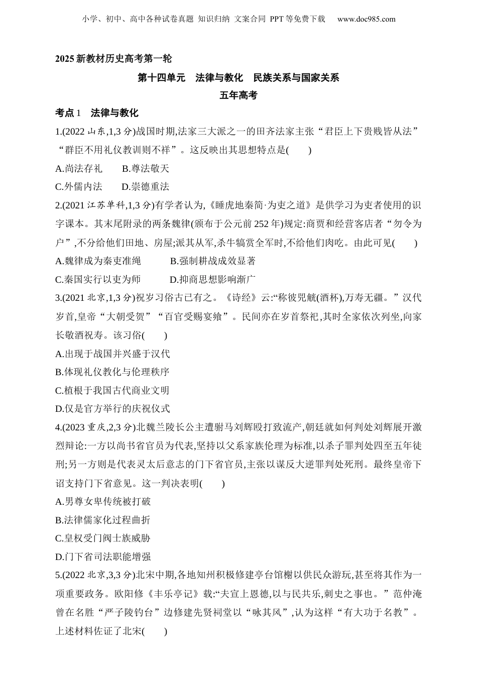 小学、初中、高中各种试卷真题知识归纳文案合同PPT等免费下载www.doc985.com2025新教材历史高考第一轮第十四单元法律与教化民族关系与国家关系五年高考考点1法律与教化1.(2022山东,1,3分)战国时期,法家三大派之一的田齐法家主张“君臣上下贵贱皆从法”“群臣不用礼仪教训则不祥”。这反映出其思想特点是()A.尚法存礼B.尊法敬天C.外儒内法D.崇德重法2.(2021江苏单科,1,3分)有学者认为,《睡虎地秦简·为吏之道》是供学习为吏者使用的识字课本。其末尾附录的两条魏律(颁布于公元前252年)规定:商贾和经营客店者“勿令为户”,不分给他们田地、房屋;派其从军,杀牛犒赏全军时,不给他们肉吃。由此可见()A.魏律成为秦吏准绳B.强制耕战成效显著C.秦国实行以吏为师D.抑商思想影响渐广3.(2021北京,1,3分)祝岁习俗古已有之。《诗经》云:“称彼兕觥(酒杯),万寿无疆。”汉代岁首,皇帝“大朝受贺”“百官受赐宴飨”。民间亦在岁首祭祀,其时全家依次列坐,向家长敬酒祝寿。该习俗()A.出现于战国并兴盛于汉代B.体现礼仪教化与伦理秩序C.植根于我国古代商业文明D.仅是官方举行的庆祝仪式4.(2023重庆,2,3分)北魏兰陵长公主遭驸马刘辉殴打致流产,朝廷就如何判处刘辉展开激烈辩论:一方以尚书省官员为代表,坚持以父系家族伦理为标准,以杀子罪判处四至五年徒刑;另一方则是代表灵太后意志的门下省官员,主张以谋反大逆罪判处死刑。最终皇帝下诏支持门下省意见。这一判决表明()A.男尊女卑传统被打破B.法律儒家化过程曲折C.皇权受门阀士族威胁D.门下省司法职能增强5.(2022北京,3,3分)北宋中期,各地知州积极修建亭台馆榭以供民众游玩,甚至将其作为一项重要政务。欧阳修《丰乐亭记》载:“夫宣上恩德,以与民共乐,刺史之事也。”范仲淹曾在名胜“严子陵钓台”边修建先贤祠堂以“咏其风”,认为这样“有大功于名教”。上述材料佐证了北宋()小学、初中、高中各种试卷真题知识归纳文案合同PPT等免费下载www.doc985.comA.注重推行社会教化B.放松了对经济的控制C.鼓励文学艺术创作D.实行崇文抑武的方针6.(2021湖北,4,3分)明代继承前代“以例辅律”的传统。“律”一经颁行,即成定制,因而难以应对不断出现的新问题,故朝廷不得不大量增补各类“例”以维护社会正常秩序,甚至将六部办定的“成案”提升为“现行则例”。此举()A.提升了社会治理的能力B.杜绝了司法腐败的可能C.确保了审判结果的公正D.导致了社会矛盾的激化7.(2022海南,5,3分)《汉书》记载“开国承家,有法有制”,认为国家应关注礼制和法律。唐代有士人说:“礼法二事,皆王教之端。”宋代以后,儒学士人以乡约教化乡里。到了明清,乡约与法律逐渐合流。这些治理方式旨在()A.推诚辅君,效功百姓B.灭私徇公,坚守直道C.守道与德,思退刑罚D.威制天下,以案刑狱8.(2020天津,7,3分)20世纪50年代,我国在经济极其落后的基础上,开始大规模工业建设,各行各业掀起劳动建设高潮。1955年3月,天津制表业的工人们在缺少资金设备、没有图纸资料的情况下,奋战数月,研制出第一块国产手表,用智慧的双手结束了“中国只能修表,不能造表”的历史。由此可以看到当时()A.国民经济恢复的重要成果B.工业综合实力的全面提升四名工人在简陋的条件下研制手表C.勤俭节约的优良传统D.艰苦奋斗的时代精神9.(“五史”教育·改革开放史)(2023福建,11,3分)改革开放初期,我国兴起了一股读书热潮。随后,上海率先开展名为“振兴中华”的职工读书活动,并设立“职工读书奖”;在中共中央的肯定与号召下,知识竞赛、演讲比赛、征文比赛等活动在各地风靡一时。这些做法旨在()小学、初中、高中各种试卷真题知识归纳文案合同PPT等免费下载www.doc985.comA.服务社会主义现代化建设B.提升人民群众的文化修养C.开创对外开放的全新局面D.抵制资本主义的精神污染10.(2021湖北,10,3分)1981年,中国女排经过顽强拼搏勇夺第三届世界杯冠军。亿万人民通过电视机、收音机收看、收听了这一盛况。女排夺冠后,很快收到数万件海内外的贺信、贺电。全国各地群众纷纷表示,要以女排为榜样,为社会主义现代化建设做出贡献。由此可见()A.电视机在家庭普及B.女排精神激励国人C.排球运动推广全国D.体育强国梦想实现11.(2022天津,9,3分)20世纪80年...